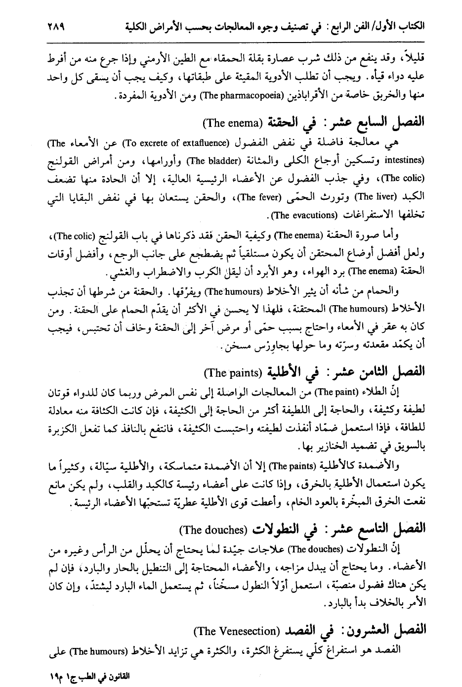قَلِيلا وَقد ينفع من ذَلِك شرب عصارة بقلة الحمقاء مَعَ الطين الأرمني وَإِذا جرع مِنْهُ من أفرط عَلَيْهِ دَوَاء قيأه. وَيجب أَن تطلب الْأَدْوِيَة المقيئة على طبقاتها وَكَيف يجب أَن يسقى كل وَاحِد مِنْهَا والخربق خَاصَّة من الأقراباذين وَمن الْأَدْوِيَة المفردة. الْفَصْل السَّادِس عشر الحقنة هِيَ معالجة فاضلة فِي نفض الفضول عَن الأمعاء وتسكين أوجاع الْكُلِّي والمثانة وأورامها وَمن أمراض القولنج وَفِي جذب الفضول عَن الْأَعْضَاء الرئيسية الْعَالِيَة إِلَّا أَن الحادة مِنْهَا تضعف الكبد وتورث الْحمى والحقن يستعان بهَا فِي نفض البقايا الَّتِي تخلفها الإستفراغات. وَأما صُورَة الحقنة وَكَيْفِيَّة الحقن فقد ذَكرنَاهَا فِي بَاب القولنج وَلَعَلَّ أفضل أوضاع المحتقن أَن يكون مُسْتَلْقِيا ثمَّ يضطجع على جَانب الوجع وَأفضل أَوْقَات الحقنة برد الْهَوَاء وَهُوَ الْأَبْرَد أَن ليقل الكرب وَالِاضْطِرَاب والغشي. وَالْحمام من شَأْنه أَن يثير الأخلاط ويفرقها. والحقنة من شَرطهَا أَن تجذب الأخلاط المحتقنة فَلهَذَا لَا يحسن فِي الْأَكْثَر أَن يقدم الْحمام على الحقنة. وَمن كَانَ بِهِ عقر فِي الأمعاء وَاحْتَاجَ بِسَبَب حقى أَو مرض آخر إِلَى الحقنة وَخَافَ أَن تحتبس فَيجب أَن يكمّد مقعدته وسرته وَمَا حولهَا بجاوِرس مسخن. الْفَصْل السَّابِع عشر الأطلية إِن الطلاء من المعالجات الْوَاصِلَة إِلَى نفس الْمَرَض وَرُبمَا كَانَ للدواء قوتان لَطِيفَة وكثيفة وَالْحَاجة إِلَى اللطيفة أَكثر من الْحَاجة إِلَى الكثيفة فَإِن كَانَت الكثافة مِنْهُ معادلة للطافة فَإِذا اسْتعْمل ضماد أنفذت لطيفته واحتبست الكثيفة فَانْتَفع بالنافذ كَمَا تفعل الكزبرة بالسويق فِي تضميد الْخَنَازِير بهَا. والأضمدة كالأطلية إِلَّا أَن الأضمدة متماسكة والأطلية سيالة وَكَثِيرًا مَا يكون اسْتِعْمَال الأطلية بالخرق وَإِذا كَانَت على أَعْضَاء رئيسة كالكبد وَالْقلب وَلم يكن مَانع نَفَعت الْخرق المبخرة بِالْعودِ الخام وأعطت قوى الأطلية عطرية تستحبها الْأَعْضَاء الرئيسة. الْفَصْل الثَّامِن عشر النطولات إِن النطولات علاجات جَيِّدَة لما يحْتَاج أَن يُبدل من الرَّأْس وَغَيره من الْأَعْضَاء. وَمَا يحْتَاج أَن يُبدل مزاجه والأعضاء المحتاجة إِلَى التنطيل بالحار والبارد فَإِن لم يكن هُنَاكَ فضول منصبة اسْتعْمل أَولا النطول مسخناً ثمَّ يسْتَعْمل المَاء الْبَارِد ليشتد وَإِن كَانَ الْأَمر بِالْخِلَافِ بِمَا بالبارد. الْفَصْل التَّاسِع عشر الفصد الفصد هُوَ استفراغ كلي يستفرغ الْكَثْرَة وَالْكَثْرَة هِيَ تزايد الأخلاط على