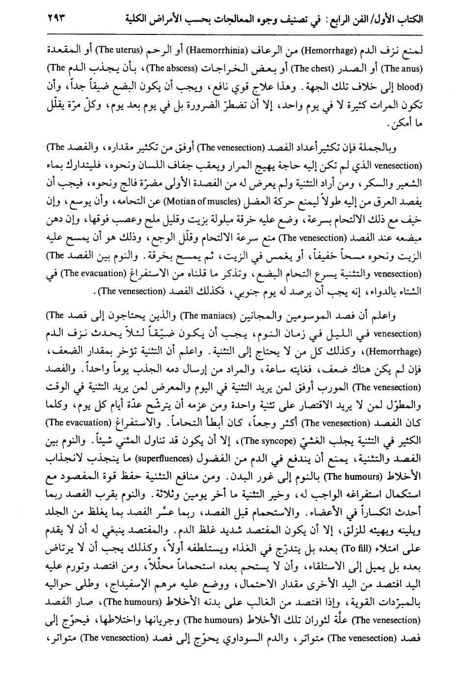 لمنع نزف الدَّم من الرعاف أَو الرَّحِم أَو المقعدة أَو الصَّدْر أَو بعض الخراجات بِأَن يجذب الدَّم إِلَى خلاف تِلْكَ الْجِهَة. وَهَذَا علاج قوي نَافِع وَيجب أَن يكون الْبضْع ضيقا جدا وَأَن تكون المرات كَثِيرَة لَا فِي يَوْم وَاحِد إِلَّا أَن تضطر الضَّرُورَة بل فِي يَوْم بعد يَوْم وكل مرّة يقلّل مَا أمكن. وَبِالْجُمْلَةِ فَإِن تَكْثِير أعداد الفصد أوفق من تَكْثِير مِقْدَاره والفصد الَّذِي لم تكن إِلَيْهِ حَاجَة يهيج المرار ويعقب جفاف اللِّسَان وَنَحْوه فليتدارك بِمَاء الشّعير وَالسكر وَمن أَرَادَ التَّثْنِيَة وَلم يعرض لَهُ من الفصدة الأولى مضرَّة فالج وَنَحْوه فَيجب أَن يفصد الْعرق من إِلَيْهِ طولا ليمنع حَرَكَة العضل عَن التحامه وَأَن يُوسع وَإِن خيف مَعَ ذَلِك الالتحام بِسُرْعَة وضع عَلَيْهِ خرقَة مبلولة بِزَيْت وَقَلِيل ملح وَعصب فَوْقهَا وَأَن دهن مبضعه عِنْد الفصد منع سرعَة الالتحام وقلل الوجع وَذَلِكَ هُوَ أَن يمسح عَلَيْهِ الزَّيْت وَنَحْوه مسحاً خَفِيفا أَو يغمس فِي الزَّيْت ثمَّ يمسح بِخرقَة. وَالنَّوْم بَين الفصد والتئنية يسْرع التحام الْبضْع وتذكر مَا قُلْنَاهُ من الاستفراغ فِي الشتَاء بالدواء أَنه يجب أَن يرصد لَهُ يَوْم جنوبي فَكَذَلِك الفصد. وَاعْلَم أَن فصد الموسومين والمجانين وَالَّذين يَحْتَاجُونَ إِلَى فصد فِي اللَّيْل فِي زمَان النّوم يجب أَن يكون ضيقا لئلاّ يحدث نزف الدَّم وَكَذَلِكَ كل من لَا يحْتَاج إِلَى التَّثْنِيَة. وَاعْلَم أَن التَّثْنِيَة تُؤخر بِمِقْدَار الضعْف فَإِن لم يكن هُنَاكَ ضعف فغايته سَاعَة وَالْمرَاد من إرْسَال دَمه الجذب يَوْمًا وَاحِدًا. والفصد المورب أوفق لمن يُرِيد التَّثْنِيَة فِي الْيَوْم والمعرض لمن يُرِيد التَّثْنِيَة فِي الْوَقْت والمطول لمن لَا يُرِيد الِاقْتِصَار على تَثْنِيَة وَاحِدَة وَمن عزمه أَن يترشّح عدَّة أَيَّام كل يَوْم وَكلما كَانَ الفصد أَكثر وجعاً كَانَ أَبْطَأَ التحاماً. والاستفراغ الْكثير فِي التَّثْنِيَة يجلب الغشي إِلَّا أَن يكون قد تنَاول المثني شَيْئا. وَالنَّوْم بَين الفصد والتثنية يمْنَع أَن ينْدَفع فِي الدَّم من الفضول مَا ينجذب لانجذاب الأخلاط بِالنَّوْمِ إِلَى غور الْبدن. وَمن مَنَافِع التَّثْنِيَة حفظ قُوَّة المفصود مَعَ استكمال استفراغه الْوَاجِب لَهُ وَخير التثنيه مَا أخر يَوْمَيْنِ وَثَلَاثَة. وَالنَّوْم بِقرب الفصد رُبمَا أحدث انكساراً فِي الْأَعْضَاء. والاستحمام قبل الفصد رُبمَا عسَر الفصد بِمَا يغلظ من الْجلد ويلينه ويهيئه للزلق إِلَّا أَن يكون المفتصد شَدِيد غلظ الدَّم. والمفتصد يَنْبَغِي لَهُ أَن لَا يقدم على امتلاء بعده بل يتدرج فى الْغذَاء ويستلطفه أَولا وَكَذَلِكَ يجب أَن لَا يرتاض بعده بل يمِيل إِلَى الاستلقاء وَأَن لَا يستحم بعده استحماماً محللاً وَمن افتصد وتورم عَلَيْهِ الْيَد افتصد من الْيَد الآخرى مِقْدَار الِاحْتِمَال وَوضع عَلَيْهِ مرهم الاسفيداج وطلى حواليه بالمبردات القوية وَإِذا افتصد من الْغَالِب على بدنه الأخلاط صَار الفصد عِلّة لثوران تِلْكَ الأخلاط وجريانها واختلاطها فيحوج إِلَى فصد متواتر وَالدَّم السوداوي يحوج إِلَى فصد متواتر