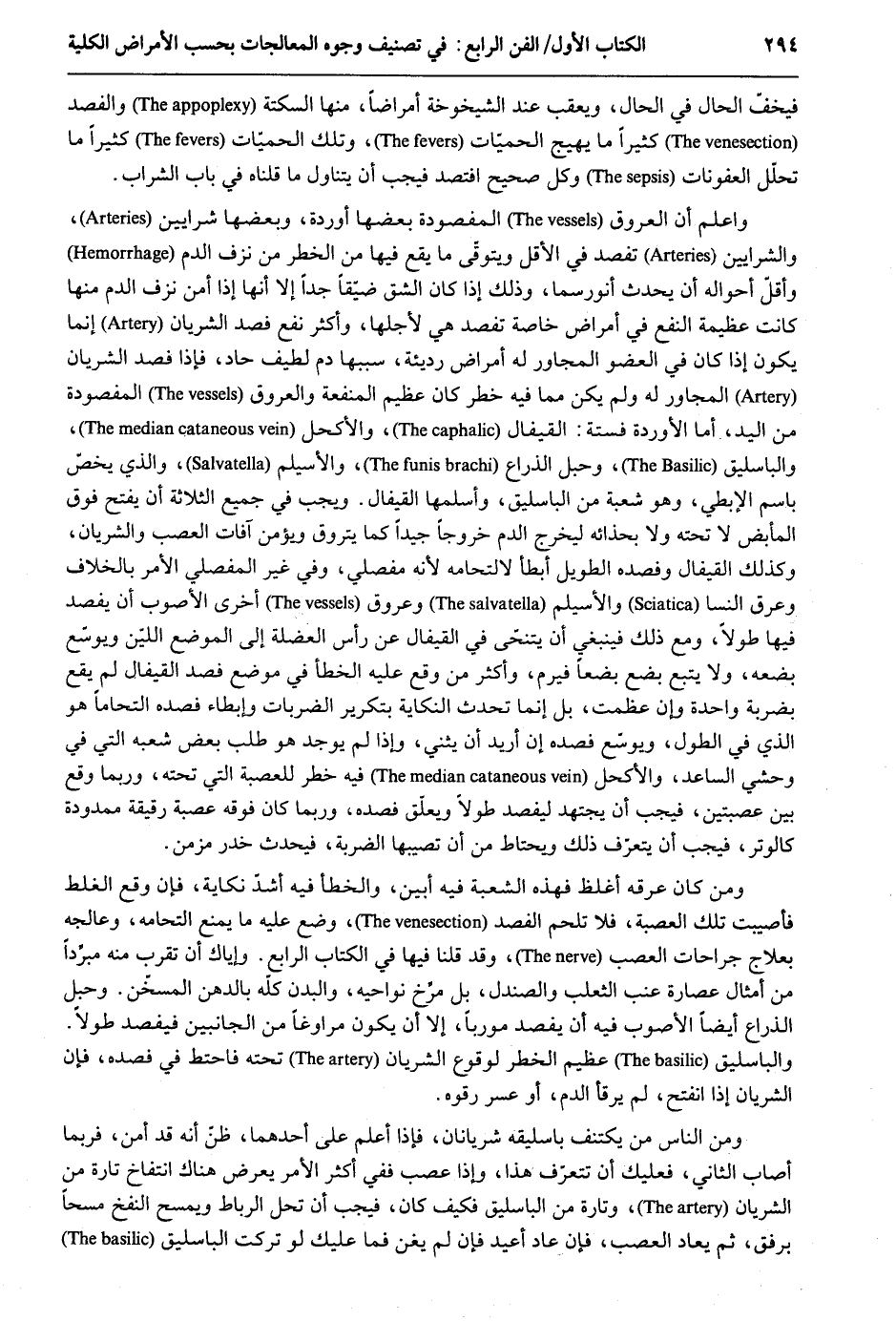 فيخف الْحَال فِي الْحَال ويعقب عِنْد الشيخوخة أمراضاً مِنْهَا السكتة والفصد كثيرا مَا يهيج الحميّات وَتلك الحميات كثيرأً مَا تتحلل العفونات وكل صَحِيح افتصد فَيجب أَن يتَنَاوَل مَا قُلْنَاهُ فِي بَاب الشَّرَاب. وَاعْلَم أَن الْعُرُوق المفصودة بَعْضهَا أوردة وَبَعضهَا شرايين والشرايين تفصد فِي الْأَقَل ويتوقى مَا يَقع فِيهَا من الْخطر من نزف الدَّم وأقلّ أَحْوَاله أَن يحدث أنورسما وَذَلِكَ إِذا كَانَ الشق ضيقا جدا إِلَّا أَنَّهَا إِذا أَمن نزف الدَّم مِنْهَا كَانَت عَظِيمَة النَّفْع فِي أمراض خَاصَّة تفصد هِيَ لأَجلهَا وَأكْثر نفع فصد الشريان إِنَّمَا يكون إِذا كَانَ فِي الْعُضْو المجاور لَهُ أَعْرَاض رَدِيئَة سَببهَا دم لطيف حاد فَإِذا فصد الشريان المجاور لَهُ وَلم يكن مِمَّا فِيهِ خطر كَانَ عَظِيم الْمَنْفَعَة وَالْعُرُوق المفصودة من الْيَد أما الأوردة فستة: القيفال والأكحل والباسليق وحبل الذِّرَاع والأسيلم وَالَّذِي يخص باسم الإبطي وَهُوَ شُعْبَة من الباسليق وَأَصلهَا القيفال. وَيجب فِي جَمِيع الثَّلَاثَة أَن يفتح فَوق المأبض لَا تَحْتَهُ وَلَا بحذائه ليخرج الدَّم خُرُوجًا جيدا كَمَا يتروق ويؤمن أفات العصب والشريان وَكَذَلِكَ القيفال وفصده الطَّوِيل أَبْطَأَ لالتحامه لِأَنَّهُ مفصلي وَفِي غير المفصلي الْأَمر بِالْخِلَافِ وعرق النسا والأسيلم وعروق أُخْرَى الأصوب أَن يفصد فِيهَا طولا وَمَعَ ذَلِك يَنْبَغِي أَن يتنحّى فِي القيفال عَن رَأس العضلة إِلَى مَوضِع اللين ويوسع بضعه وَلَا يتبع بضع بضعاً فيرم وَأكْثر من وَقع عَلَيْهِ الْخَطَأ فِي مَوضِع فصد القيفال لم يَقع بضربة وَاحِدَة وَأَن عظمت بل إِنَّمَا تحدث النكاية بتكرير الضربات وإبطاء فصده التحاماً هُوَ الَّذِي فِي الطول ويوسع فصده إِن أُرِيد أَن يثني وَإِذا لم يُوجد هُوَ طلب بعض شعبه الَّتِي فِي وَحشِي الساعد والأكحل فِيهِ خطر للْعصبَةِ الَّتِي تَحْتَهُ وَرُبمَا وَقع بَين عصبتين فَيجب أَن يجْتَهد ليفصد طولا ويعلق فصده وَرُبمَا كَانَ فَوْقه عصبَة رقيقَة ممدودة كالوتر فَيجب أَن يتعرف ذَلِك ويحتاط من أَن تصيبها الضَّرْبَة فَيحدث خدر مزمن. وَمن كَانَ عرقه أغْلظ فَهَذِهِ الشعبة فِيهِ أبين وَالْخَطَأ فِيهِ أَشد نكاية فَإِن وَقع الْغَلَط فأصيبت تِلْكَ الْعصبَة فَلَا تلحم الفصد وضع عَلَيْهِ مَا يمْنَع التحامه وعالجه بعلاج جراحات العصب وَقد قُلْنَا فِيهَا فِي الْكتاب الرَّابِع. وَإِيَّاك أَن تقرب مِنْهُ مبرًداً من أَمْثَال عصارة عِنَب الثَّعْلَب والصندل بل مرخ نواحيه وَالْبدن كُله بالدهن المسخن. وحبل الذِّرَاع أَيْضا الأصوب فِيهِ أَن يفصد مورباً إِلَّا أَن يكون مراوغاً من الْجَانِبَيْنِ فيفصد طولا. والباسليق عَظِيم الْخطر لوُقُوع الشريان تَحْتَهُ فاحتط فِي فصده فَإِن الشريان إِذا انْفَتح لم يرقأ الدَّم أَو عسر رقوه. وَمن النَّاس من يكتنف باسليقه شريانان فَإِذا أعلم على أَحدهمَا ظن أَنه قد أَمن فَرُبمَا أصَاب الثَّانِي فَعَلَيْك أَن تتعرف هَذَا وَإِذا عصب فَفِي أَكثر الْأَمر يعرض هُنَاكَ انتفاخ تَارَة من الشريان وَتارَة من الباسليق فَكيف كَانَ فَيجب أَن تحل الرِّبَاط وَيمْسَح النفخ مسحاً بِرِفْق ثمَّ يُعَاد العصب فَإِن عَاد أُعِيد إِلَيْك فَإِن لم يغن فَمَا عَلَيْك لَو تركت الباسليق