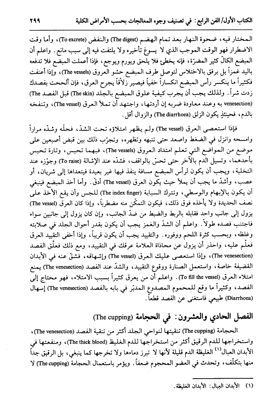 الْمُخْتَار فِيهِ ضحوة النَّهَار بعد تَمام الهضم والنفض وَأما وَقت الِاضْطِرَار فَهُوَ الْوَقْت الْمُوجب الَّذِي لَا يسوغ تَأْخِيره وَلَا يلْتَفت فِيهِ إِلَى سَبَب مَانع. وَاعْلَم أَن المبضع الكال كثير المضرّة فَإِنَّهُ يخطىء فَلَا يلْحق ويورم ويوجع فَإِذا أعملت المبضع فَلَا تَدْفَعهُ بِالْيَدِ غمزاً بل بِرِفْق بالاختلاس لتوصل طرف المبضع حَشْو الْعُرُوق وَإِذا أعنفت فكثيراً مَا ينكسر رَأس المبضع انكساراً خفِيا فَيصير زلآقاً يجرح الْعرق فَإِن ألححت بفصدك زِدْت شرا. وَلذَلِك يجب أَن يجرب كَيْفيَّة علوق المبضع بِالْجلدِ قبل الفصد بِهِ وَعند معاودة ضربه إِن أردتها واجتهد أَن تملأ الْعرق وتنفخه بِالدَّمِ فَحِينَئِذٍ يكون الزلق والزوال أقل. فَإِذا استعصى الْعرق وَلم يظْهر امتلاؤه تَحت الشد فَحله وشدّه مرَارًا وامسحه وَانْزِلْ فِي الضغط واصعد حَتَّى تنبهه وتظهره وتجرب ذَلِك بَين قبض أصبعين على مَوضِع من الْمَوَاضِع الَّتِي تعلم امتداد الْعُرُوق فبهما تحبس وَتارَة تحبس بِأَحَدِهِمَا وتسيل الدَّم بِالْآخرِ حَتَّى تحسّ بالواقف فشدّه عِنْد الإشالة وَجوزهُ عِنْد التَّخْلِيَة وَيجب أَن يكون لرأس المبضع مَسَافَة ينفذ فِيهَا غير بعيدَة فيتعداها إِلَى شريان أَو عصب وَأَشد مَا يجب أَن يمْلَأ حَيْثُ يكون الْعرق أدقّ. وَأما أَخذ المبضع فَيَنْبَغِي أَن يكون بالإبهام وَالْوُسْطَى وتترك السبابَة للجس وَأَن يَقع الْأَخْذ على نصف الحديدة وَلَا يَأْخُذهُ فَوق ذَلِك فَيكون التَّمَكُّن مِنْهُ مضطرباً وَإِذا كَانَ الْعرق يَزُول إِلَى جَانب وَاحِد فقابله بالربط والضبط من ضدّ الْجَانِب وَإِن كَانَ يَزُول إِلَى جانبين سَوَاء فاجتنب فصده طولا. وَاعْلَم أَن الشد والغمز يجب أَن يكون بِقدر أَحْوَال الْجلد فِي صلابته وغلظه وبحسب كَثْرَة اللَّحْم ووفوره. وَالتَّقْيِيد يجب أَن يكون قَرِيبا وَإِذا أخْفى التَّقْيِيد الْعرق فَعلم عَلَيْهِ وَاحْذَرْ أَن يَزُول عَن محاذاة الْعَلامَة عرقك فِي التَّقْيِيد وَمَعَ ذَلِك فعلق الفصد وَإِذا استعصى عَلَيْك الْعرق وإشهاقه فشق عَنهُ فِي الْأَبدَان القضيفة خَاصَّة وَاسْتعْمل السنارة وَوُقُوع التَّقْيِيد والشد عِنْد الفصد يمْنَع امتلاء الْعرق. وَاعْلَم أَن من يعرق كثيرا بِسَبَب الامتلاء فَهُوَ مُحْتَاج إِلَى الفصد وَكَثِيرًا مَا وَقع للمحموم المصدوع الْمُدبر فِي بَابه بالفصد إسهال طبيعي فاستغنى عَن الفصد قطعا. الْفَصْل وَالْعشْرُونَ الْحجامَة الْحجامَة تنقيتها لنواحي الْجلد أَكثر من تنقية الفصد واستخراجها للدم الرَّقِيق أَكثر من استخراجها للدم الغليظ ومنفعتها فِي الْأَبدَان العبال الغليظة الدَّم قَليلَة لِأَنَّهَا لَا تبرز دماءها وَلَا تخرجها كَمَا يَنْبَغِي بل الرَّقِيق جدا مِنْهَا بتكلف وتحدث فِي الْعُضْو المحجوم ضعفا. وَيُؤمر بِاسْتِعْمَال الْحجامَة لَا