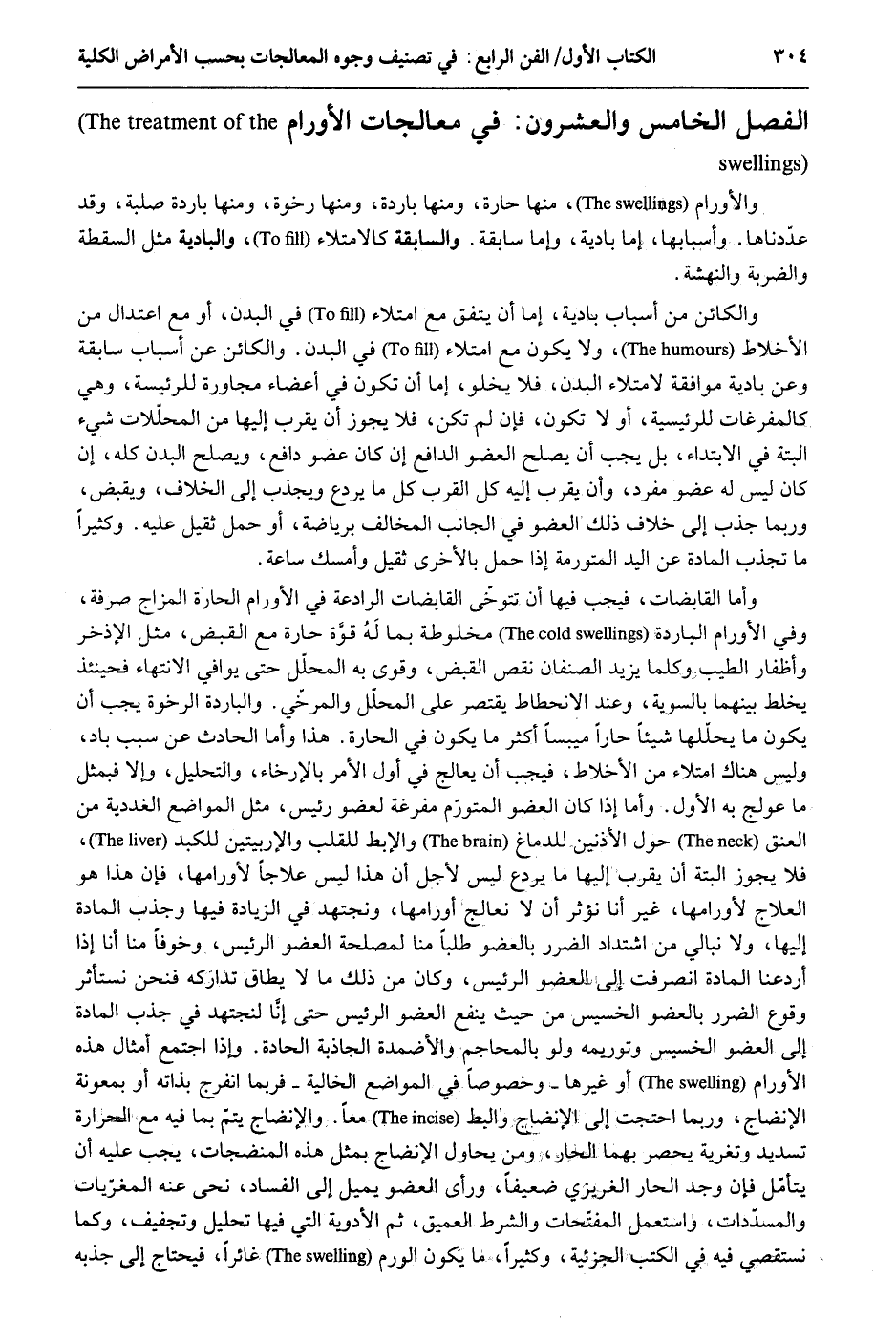 نَحْو الْجلد وَلَو بالمحاجم بالنَّار. وَأما الأورام الصلبة الْمُجَاوزَة حد الِابْتِدَاء فالقانون فِيهَا أَن تلين تَارَة بِمَا يقلّ إسخانه وتجفيفه لئلآ يتحجر كثيفه لشدَّة التَّحْلِيل بل يستعد جَمِيعه للتحليل ثمَّ يشد عَلَيْهِ التَّحْلِيل ثمَّ إِن خيف - من تحلل مَا تحلّل - تحجر مَا يبْقى أقبل على تليينه ثَانِيًا وَلَا يزَال يفعل ذَلِك حَتَّى يفنى كُله فِي مدتي التليين والتحليل. والأورام الفجة تعالج يما يسخن مَعَ لطافة والأورام النفخية تعالج بِمَا يسخن مَعَ لطافة جَوْهَر لتحلل الرّيح وَتوسع المسام إِذْ السَّبَب فِي الأورام النفخية غلظ الرّيح بانسداد المسام. وَيجب أَيْضا أَن يعتنى بجسم مَادَّة مَا يحدث البخار الريحي. وَمن الأورام أورام قرحية كالنملة فَيجب أَن تبرد كالفلغموني وَلَكِن لَا يَنْبَغِي أَن يرطب وَأَن كَانَ الورم يَقْتَضِي الترطيب بل يَنْبَغِي أَن تجقف لِأَن الْعرض هَهُنَا قد غلب السَّبَب. وَالْعرض هُوَ التقرح المتوقع أَو الْوَاقِع. والتقرح علاجه التجفيف وأضر الْأَشْيَاء بِهِ الترطيب. وَأما الأورام الْبَاطِنَة فَيجب أَن تنقص الْمَادَّة عَنْهَا بالفصد والإسهال ويجتنب صَاحبهَا الْحمام وَالشرَاب والحركات الْبَدَنِيَّة والنفسانية المفرطة كالغضب وَنَحْوه ثمَّ يسْتَعْمل فِي بَدْء الْأَمر مَا يردع من غير حمل شَدِيد وخصوصاً إِن كَانَ فِي مثل الْمعدة أَو الكبد لهاذا جَاءَ وَقت تحليلها فَلَا يجب أَن يخلي عَن أدوية قابضة طيبَة الرّيح كَمَا أومأنا إِلَيْهِ فِيمَا سلف. والكبد والمعدة أحْوج إِلَى ذَلِك من الرئة وَيجب أَن تكون الملينات للطبيعة الَّتِي تسْتَعْمل فِيهَا إنضاج وموافقة للأورام مثل عِنَب الثَّعْلَب وَالْخيَار شنبر. ولعنب الثَّعْلَب خاصية فِي تَحْلِيل الأورام الحارة الْبَاطِنَة وَيجب أَن لَا يغذى أَرْبَابهَا إِلَّا لطيفاً وَفِي غير وَقت النّوبَة إِن كَانَت فِي ابتدائها إِلَّا لضعف شَدِيد. وَمن بلي باجتماع ورم الأحشاء مَعَ سُقُوط الْقُوَّة فَهُوَ فِي طَرِيق الْمَوْت لِأَن الْقُوَّة لَا تنتعش إِلَّا بالغذاء. والغذاء أضرّ شَيْء فَإِن تحللت فَمَا أحسن مَا يكون وَإِن تَفَجَّرَتْ فَيجب أَن يشرب مَا يغسلهَا مثل مَاء الْعَسَل أَو مَاء السكر ثمَّ يتَنَاوَل مَا ينضج بِرِفْق مَعَ تجفيف ثمَّ آخر الْأَمر يقْتَصر على المجففات. وستعلم هَذَا من الْكتاب الْمُشْتَمل على الْأَمْرَاض الْجُزْئِيَّة علما مشروحاً وَقد يغلط فِي الأورام الْبَاطِنَة الَّتِي تَحت الْبَطن فَإِنَّهَا رُبمَا لم تكن أوراماً بل كَانَت فتقاً فَيكون بطها فِيهِ خطر وَرُبمَا كَانَت ورماً بَاطِنا وَلَيْسَ فِي الصفاق بل فِي المعي نَفسه وَكَانَ فِي بطه خطر فَاعْلَم ذَلِك. الْفَصْل الْخَامِس وَالْعشْرُونَ كَلَام مُجمل فِي البَط من أَرَادَ أَن يبط بطأ فَيجب أَن يفدب بشقه مَعَ الأسرة والغضون الَّتِي فِي ذَلِك الْعُضْو إِلَّا أَن يكون الْعُضْو مثل الْجَبْهَة فَإِن البط إِذا وَقع على مَذْهَب أسرته وغضونه انْقَطَعت عضلة الْجَبْهَة وَسقط الْحَاجِب.