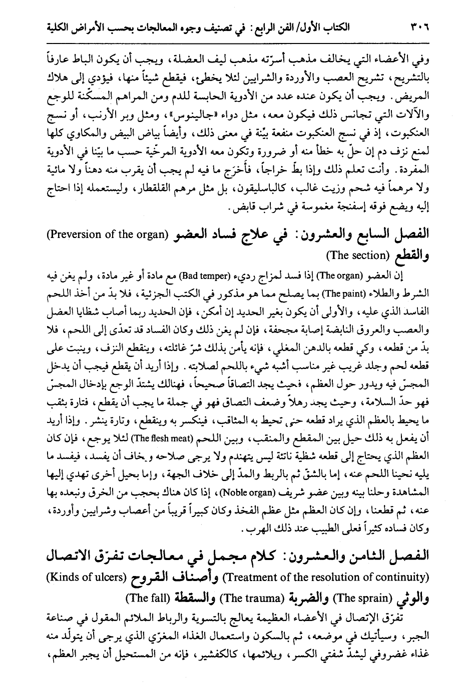 وخصوصاً فِي الْأَبدَان الْبَالِغَة إِلَّا على هَذِه الصّفة فَإِنَّهُ لَا يعود إِلَى الِاتِّصَال الْبَتَّةَ. وسنتكلم فِي الْجَبْر كلَاما مستقصى فِي الْكتب الْجُزْئِيَّة. وَأما تفرق الإتصال الْوَاقِع فِي الْأَعْضَاء اللينة فالغرض فِي علاجها مُرَاعَاة أصُول ثَلَاثَة إِن كَانَ السَّبَب ثَابتا فَأول مَا يجب هُوَ قطع مَا يسيل وَقطع مادته إِن كَانَ لمجاوره مَادَّة. وَالثَّانِي: إلحام الشق بالأدوية والأغذية الْمُوَافقَة. وَالثَّالِث: منع العفونة مَا أمكن. وَإِذا كفى من الثَّلَاثَة وَاحِد صرفت الْعِنَايَة إِلَى البَاقِينَ. أما قطع مَا يسيل فقد عرفت الْوَجْه فِي ذَلِك وَنحن قد فَرغْنَا عَن بَيَانه. وَأما الإلحام. فتجمع الشفاه إِن اجْتمعت وبالتجفيف فَيتَنَاوَل المغريات وَيَنْبَغِي أَن تعلم أَن الْغَرَض فِي مداواة القروح هُوَ التجفيف فَمَا كَانَ مِنْهَا نقياً جفف فَقَط وَمَا كَانَ مِنْهَا عفناً اسْتعْملت فِيهِ الْأَدْوِيَة الحادة الأكالة مثل القلقطار والزاج والزرنيخ والنورة فَإِن لم ينجع فَلَا بُد من النَّار. والدواء المركّب من الزنجار والشمع والدهن ينقى بزنجاره وَيمْنَع إفراط اللذع بدهنه وشمعه فَهُوَ دَوَاء معتدل فِي هَذَا الشَّأْن الْمَذْكُور فِي أقراباذين وَتقول: إِن كل قرحَة لَا يَخْلُو إِمَّا أَن تكون مُفْردَة وَإِمَّا أَن تكون مركبة. والمفردة إِن كَانَت صَغِيرَة وَلم يتأكل من وَسطهَا شَيْء فَيجب أَن يجمع شفتاها وتعصب بعد توق من وُقُوع شَيْء فِيمَا بَينهَا من دهن أَو غُبَار فَإِنَّهُ يلتحم وَكَذَلِكَ الْكَبِيرَة الَّتِي لم يذهب من جوهرها شَيْء وَيُمكن إطباق جُزْء مِنْهَا على الآخر. وَأما الْكَبِيرَة الَّتِي لَا يُمكن ضمهَا شقاً كَانَ أَو فضاء مملوءاً صديداً أَو قد ذهب مِنْهَا شَيْء من جَوْهَر الْعُضْو فعلاجها التجفيف. فَإِن كَانَ الذَّاهِب جلدا فَقَط احْتِيجَ إِلَى مَا يخْتم وَهُوَ إِمَّا بِالذَّاتِ فالقوابض وَإِمَّا بِالْعرضِ فالحادة إِذا اسْتعْمل مِنْهَا قَلِيل مَعْلُوم مثل الزاج والقلقطار فَإِنَّهَا أعون على التجفيف وإحداث الخشكريشة فَإِن أَكثر أكل وَزَاد فِي القروح وَأما إِن كَانَ الذَّاهِب لَحْمًا كالقروح الغائرة فَلَا يجب أَن نبادر إِلَى الْخَتْم بل يجب أَن يعتني أَولا ب بإنبات اللَّحْم وَإِنَّمَا ينْبت اللَّحْم مَا لَا يتعدّى تجفيفه الدرجَة الأولى كثيرا بل هَهُنَا شَرَائِط يَنْبَغِي أَن تراعى من ذَلِك اعْتِبَار حَال مزاج الْعُضْو الْأَصْلِيّ ومزاج القرحة فَإِن كَانَ الْعُضْو فِي مزاجه شَدِيد الرطوبه والقرحة لَيست بشديدة الرُّطُوبَة كفى تجفيف يسير فِي الدرجَة الأولى لِأَن الْمَرَض لم يَتَعَدَّ عَن طبيعة الْعُضْو كثيرا. وَأما إِذا كَانَ الْعُضْو يَابسا والقرحة شَدِيدَة الرُّطُوبَة احْتِيجَ إِلَى مَا يجفف فِي الدرجَة الثَّانِيَة وَالثَّالِثَة ليَرُدهُ إِلَى مزاجه وَيجب أَن يعدل الْحَال فِي المعتدلين وَمن ذَلِك اعْتِبَار مزاج الْبدن كُله لِأَن الْبدن إِذا كَانَ شَدِيد اليبوسة كَانَ الْعُضْو الزَّائِد فِي رطوبته معتدلاً فِي الرُّطُوبَة بِحَسب الْبدن المعتدل فَيجب أَن يجفف بالمعتدل وَكَذَلِكَ إِن كَانَ الْبدن زَائِد الرُّطُوبَة والعضو إِلَى ٍ اليبوسة وَإِن خرجا جَمِيعًا إِلَى الزِّيَادَة فَحِينَئِذٍ إِن كَانَ الْخُرُوج إِلَى الرُّطُوبَة جفف تجفيفاً أَكثر أَو إِلَى اليبوسة جفّف تجفيفاً أقل وَمن ذَلِك اعْتِبَار قُوَّة المجقفات فَإِن المجففات المنبتة - وَإِن لم يطْلب مِنْهَا تجفيف شَدِيد مثله - يمْنَع الْمَادَّة المنصبة إِلَى الْعُضْو الَّتِي مِنْهَا يتهيأ إنبات اللَّحْم كَمَا يطْلب فِي مجففات لَا تسْتَعْمل لإنبات اللَّحْم بل للختم فإذاه يطْلب مِنْهَا أَن تكون أَكثر جلاءَ وغسلاً للصديد من المجففات الخاتمة الَّتِي لَا يُرَاد مِنْهَا إِلَّا الْخَتْم