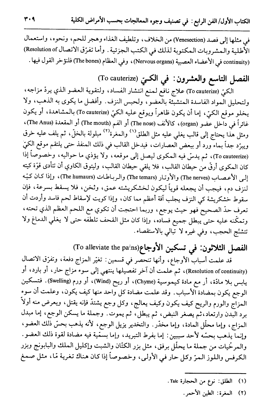 الإجاص والنشا والاسفيذاجات والزعفران واللاذن والخطمي والحماما والكرنب والسلجم وطبيخها والشحوم والزوفا الرطب وأذهان مِمَّا ذكر والمسهلات والمستفركات كَيفَ كَانَت من هَذَا الْقَبِيل. وَيجب أَن تسْتَعْمل المرخيات بعد الاستفراغ إِن احْتِيجَ إِلَى استفْراغ حَتَّى تَنْقَطِع الْمَادَّة المنصبة إِلَى ذَلِك الْعُضْو وَأَيْضًا جَمِيع مَا ينضج الأورام أَو يفجرها. والمخدرات أقواها الأفيون وَمن جُمْلَتهَا اللفاح وبزره وقشور أَصله والخشخاشات والبنج والشوكران وعنب الثَّعْلَب وبزر الخس. وَمن هَذِه الْجُمْلَة الثَّلج وَالْمَاء الْبَارِد وَكثير مَا يَقع الْغَلَط فِي الأوجاع فَتكون أَسبَابهَا أموراٌ من خَارج مثل حر أَو برد أَو سوء وساد وَفَسَاد مُضْطَجع أَو صرعة فِي السكر وَغَيره فيطلب لَهَا سَبَب من الْبدن فيغلط. وَلِهَذَا يجب أَن تتعرف ذَلِك وتتعرف هَل هُنَاكَ امتلاء أم لَيْسَ وتتعرف هَل هُنَاكَ أَسبَاب الامتلات الْمَعْلُومَة وَرُبمَا كَانَ السَّبَب أَيْضا قد ورد من خَارج فَتمكن دَاخِلا مثل من يشرب مَاء بَارِدًا فَيحدث بِهِ وجع شَدِيد فِي نواحي معدته وكبده وَكَثِيرًا مَا لَا يحْتَاج إِلَى أَمر عَظِيم من الاستفراغ وَنَحْوه فَإِنَّهُ كثيرا مَا يَكْفِيهِ الاستحمام وَالنَّوْم الْبَالِغ فِيهِ وَمثل من يتَنَاوَل شَيْئا حاراً فيصدعه صداعاً عَظِيما ويكفيه شرب مَاء مبرد. وَرُبمَا كَانَ الشَّيْء الَّذِي من قبله يُرْجَى زَوَال الوجع إِمَّا بطيء التَّأْثِير وَلَا يحْتَمل الوجع إِلَى ذَلِك الْوَقْت مثل استفراغ الْمَادَّة الفاعلة لوجع القولنج المحتبسة فِي لِيف الأمعاء وَإِمَّا سريع التَّأْثِير لكنه عَظِيم الغائلة مثل تخدير الْعُضْو الوجع فِي القولنج بالأدوية الَّتِي من شَأْنهَا أَن تفعل ذَلِك فيتحير المعالج فى ذَلِك فَيجب أَن يكون عِنْده حدس قوي ليعلم أى المدتين أطول مُدَّة ثبات الْقُوَّة أَو مدد الوجع وَأَيْضًا الْحَالين أضرّ فِيهِ الوجع أَو الغائلة المتوقعة فِي التخدير فيؤثر تَقْدِيم مَا هُوَ أصوب. فَرُبمَا كَانَ الوجع - إِن بَقِي - قتل بشدته وبعظمه والتخدير رُبمَا لم يقتل وَإِن أضرّ من وَجه اخر وَرُبمَا أمكنك أَن تتلافى مضرّته وتعاود وتعالج بالعلاج الصَّوَاب وَمَعَ ذَلِك فَيجب أَن تنظر فِي تركيب المخدر وكيفيته وتستعمل أسهله وتستعمل مركبه مَعَ ترياقاته إِلَّا أَن يكون الْأَمر عَظِيما جدا فتخاف وتحتاج إِلَى تخدير قوي وَرُبمَا كَانَ بعض الْأَعْضَاء غير ميال بِاسْتِعْمَال المخدر عَلَيْهِ فَإِنَّهُ لَا يُؤَدِّي إِلَى غائلة عَظِيمَة مثل الْأَسْنَان إِذا وضع عَلَيْهَا مخدّر. وَرُبمَا كَانَ الشّرْب أَيْضا سليما فِي مثله مثل شرب المخدر لأجل وجع الْعين فَإِن ذَلِك أقل ضَرَرا بِالْعينِ من أَن يكتحل بِهِ وَرُبمَا سهك تلاقي ضَرَر شربهَا بالأعضاء الآخرى. وَأما فِي مثل القولنج فتعظم الغائلة لِأَن الْمَادَّة تزداد بردا وجموداً واستغلافاً والمخدرات قد تسكن الوجع بِمَا تنوم فَإِن النّوم أحد أَسبَاب سُكُون الوجع وخصوصاً إِذا اسْتعْمل الْجُوع مَعَه فِي وجع مادي. والمخدّرات المركبة الَّتِي تكسر قواها أدوية هِيَ كالترياق لَهَا أسلم مثل الفلونيا وَمثل الأقراص الْمَعْرُوفَة بِالْمُثَلثَةِ لَكِنَّهَا أَضْعَف تخديراً. والطري مِنْهَا أقوى تخديراً والعتيق يكَاد لَا يخدر والمتوسط متوسط. وَمن الأوجاع مَا هُوَ شَدِيد الشدَّة سهل العلاج أَحْيَانًا مثل الأوجاع الريحية فَرُبمَا سكنها وكفاها صب المَاء الْحَار عَلَيْهَا وَلَكِن فِي ذَلِك خطر وَاحِد وَذَلِكَ أَنه رُبمَا كَانَ السَّبَب ورماً
