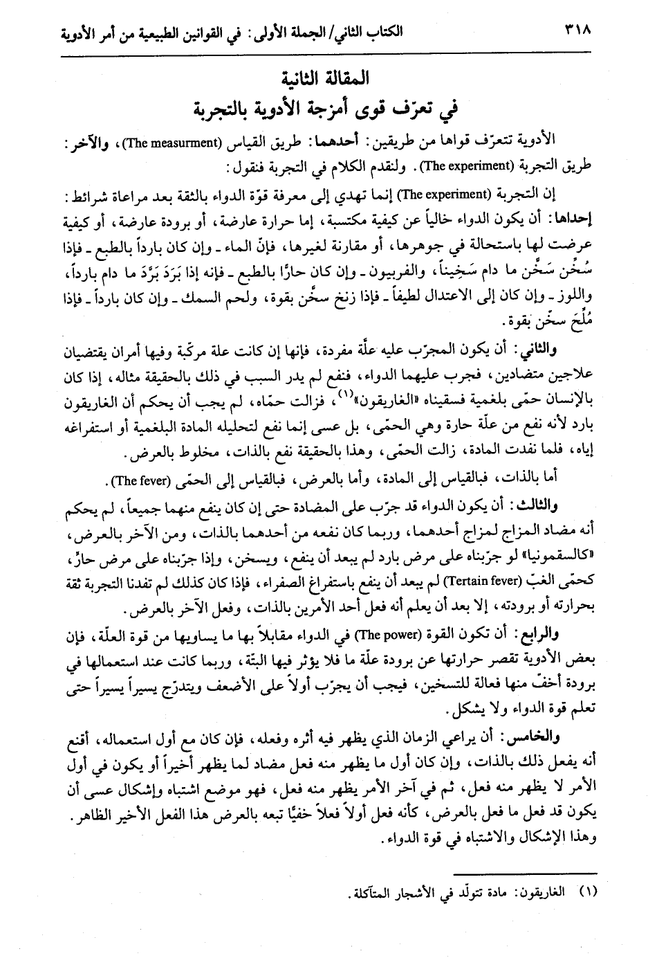الْمقَالة الثَّانِيَة فِي تعرف قوى أمزجه الْأَدْوِيَة بالتجرية تتعرّف قواها من طَرِيقين: أَحدهمَا: طَرِيق الْقيَاس وَالْآخر: طَرِيق التجربة. ولنقدم الْكَلَام فِي التجربة فَنَقُول: إِن التجربة إِنَّمَا تهدي إِلَى معرفَة قُوَّة الدَّوَاء بالثقة بعد مُرَاعَاة شَرَائِط: إِحْدَاهَا: أَن يكون الدَّوَاء خَالِيا عَن كَيْفيَّة مكتسبةِ إِمَّا حرارة عارضة أَو برودة عارضة أَو كَيْفيَّة عرضت لَهَا باستحالة فِي جوهرها أَو مُقَارنَة لغَيْرهَا فَإِن المَاء وان كَانَ بَارِدًا بالطبع فَإِذا سُخن سَخَّن مَا دَامَ سَخِيناً والفربيون وَأَن كَانَ حاراً بالطبع فَإِنَّهُ إِذا بَرَدَ برَدَ مَا دَامَ بَارِدًا واللوز وَأَن كَانَ إِلَى الِاعْتِدَال لطيفاً فَإِذا زنخ سخن بِقُوَّة وَلحم السّمك وَإِن كَانَ بَارِدًا فَإِذا ملحَ سخن بِقُوَّة. وَالثَّانِي: أَن يكون المجرب عَلَيْهِ علَة مُفْردَة فَإِنَّهَا إِن كَانَت عِلّة مركبة وفيهَا أَمْرَانِ يقتضيان علاجين متضادين فجرب عَلَيْهِمَا الدَّوَاء فنفع لم يدر السَّبَب فِي ذَلِك بِالْحَقِيقَةِ مِثَاله إِذا كَانَ بالإنسان حمى بلغمية فسقيناه الغاريقون فَزَالَتْ حماه لم يجب أَن يحكم أَن الغاريقون بَارِد لِأَنَّهُ نفع من عِلّة حارة وَهِي الْحمى بل عَسى إِنَّمَا نفع لتحليله الْمَادَّة البلغمية أَو استفراغه إِيَّاه فَلَمَّا نفدت الْمَادَّة زَالَت الْحمى وَهَذَا بِالْحَقِيقَةِ نفع بِالذَّاتِ مخلوط بِالْعرضِ. أما بِالذَّاتِ فبالقياس إِلَى المادق وَأما بِالْعرضِ فبالقياس إِلَى الْحمى. وَالثَّالِث: أَن يكون الدَّوَاء قد جرب على المضادة حَتَّى إِن كَانَ ينفع مِنْهُمَا جَمِيعًا لم يحكم أَنه مضاد المزاج لمزاج أَحدهمَا وَرُبمَا كَانَ نَفعه من أَحدهمَا بِالذَّاتِ وَمن الآخر بِالْعرضِ كالسقمونيا لَو جزبناه على مرض بَارِد لم يبعد أَن ينفع ويسخن وَإِذا جربناه على مرض حَار كَحمى الغب لم يبعد أَن ينفع باستفراغ الصَّفْرَاء فَإِذا كَانَ كَذَلِك لم تفدنا التجربة ثِقَة بحرارته أَو برودته إِلَّا بعد أَن يعلم أَنه فعل أحد الْأَمريْنِ بِالذَّاتِ وَفعل الآخر بِالْعرضِ. وَالرَّابِع: أَن تكون الْقُوَّة فِي الدَّوَاء مُقَابلا بهَا مَا يساويها من قُوَّة العلّة فَإِن بعض الْأَدْوِيَة تقصر حَرَارَتهَا عَن برودة عِلّة مَا فَلَا يُؤثر فِيهَا الْبَتَّةَ وَرُبمَا كَانَت عِنْد اسْتِعْمَالهَا فِي برودة أخفّ مِنْهَا فعالة للتسخين فَيجب أَن يجرب أَولا على الأضعف ويتدرج يَسِيرا يَسِيرا حَتَّى تعلم قُوَّة الدَّوَاء وَلَا يشكل. وَالْخَامِس: أَن يُرَاعى الزَّمَان الَّذِي يظْهر فِيهِ أَثَره وَفعله فَإِن كَانَ مَعَ أول اسْتِعْمَاله أقنع أَنه يفعل ذَلِك بِالذَّاتِ وَإِن كَانَ أول مَا يظْهر مِنْهُ فعل مضاد لما يظْهر أخيراً أَو يكون فِي أول الْأَمر لَا يظْهر مِنْهُ فعل ثمَّ فِي اً خر الْأَمر يظْهر مِنْهُ فعل فَهُوَ مَوضِع اشْتِبَاه وإشكال عَسى اْن يكون قد فعل مَا فعل بِالْعرضِ كَأَنَّهُ فعل أَولا فعلا خفِيا تبعه بِالْعرضِ هَذَا الْفِعْل الْأَخير الظَّاهِر. وَهَذَا الْإِشْكَال والاشتباه فِي قُوَّة الدَّوَاء.