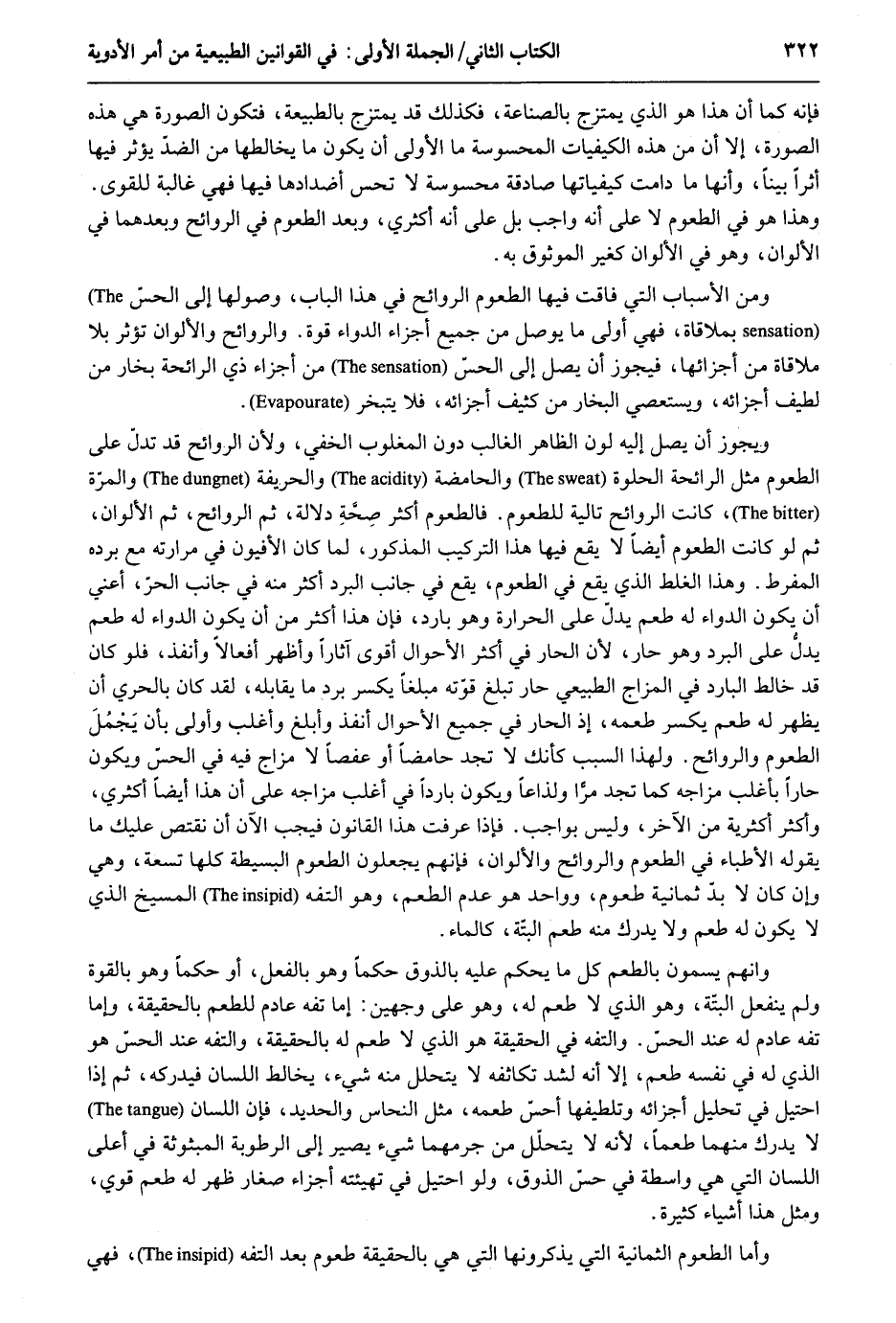 فَإِنَّهُ كَمَا أَن هَذَا هُوَ الَّذِي يمتزج بالصناعة فَكَذَلِك قد يمتزج بالطبيعة فَتكون الصُّورَة هِيَ هَذِه الصُّورَة إِلَّا أَن من هذد الكيفيات المحسوسة مَا الأولى أَن يكون مَا يخالطها من الضِّدّ يُؤثر فِيهَا أثرا بَينا وَأَنَّهَا مَا دَامَت كيفياتها صَادِقَة محسوسة لَا تحس أضدادها فِيهَا فَهِيَ غالبة للقوى. وَهَذَا هُوَ فِي الطعوم لَا على أَنه وَاجِب بل على أَنه أكثري وَبعد الطعوم فِي الروائح وبعدهما فِي الألوان وَهُوَ فِي الألوان كَغَيْر الموثوق بِهِ. وَمن الْأَسْبَاب الَّتِي فاقت فِيهَا الطعوم الروائح فِي هَذَا الْبَاب وصولها إِلَى الْحس بملاقاة فَهِيَ أولى مَا يُوصل من جَمِيع أَجزَاء الدَّوَاء قُوَّة. والروائح والألوان تُؤثر بِلَا ملاقاة من أَجْزَائِهَا فَيجوز أَن يصل إِلَى الْحس من أَجزَاء فِي الرَّائِحَة بخار من لطيف أَجْزَائِهِ ويستعصي البخار من كثيف أَجْزَائِهِ فَلَا يتبخر. وَيجوز أَن يصل إِلَيْهِ لون الظَّاهِر الْغَالِب دون المغلوب الْخَفي وَلِأَن الروائح قد تدل على الطعوم مثل الرَّائِحَة الحلوة والحامضة والحريفة والمرة كَانَت الروائح تالية للطعوم. فالطعوم أَكثر صِحَّةِ دلَالَة ثمَّ الروائح ثمَّ الألوان ثمَّ لَو كَانَت الطعوم أَيْضا لَا يَقع فِيهَا هَذَا التَّرْكِيب الْمَذْكُور لما كَانَ الأفيون فِي مرارته مَعَ برده المفرط. وَهَذَا الْغَلَط الَّذِي يَقع فِي الطعوم يَقع فِي جَانب الْبرد أَكثر مِنْهُ فِي جَانب الْحر أَعنِي أَن يكون الدَّوَاء لَهُ طعم يدل على الْحَرَارَة وَهُوَ بَارِد فَإِن هَذَا أَكثر من أَن يكون الدَّوَاء لَهُ طعم يدلُ على الْبرد وَهُوَ حَار لِأَن الْحَار فِي أَكثر الْأَحْوَال أقوى اً ثاراً وَأظْهر أفعالاً وأفذ فَلَو كَانَ قد خالط الْبَارِد فِي المزاج الطبيعي حَار. تبلغ قوّته مبلغا يكسر برد مَا يُقَابله لقد كَانَ بالحري أَن يظْهر لَهُ طعم يكسر طعمه إذالحار فِي جَمِيع الْأَحْوَال أنفذ وأبلغ وأغلب وَأولى بِأَن يَجْمُلَ الطعومٍ والروائح. وَلِهَذَا السَّبَب كَأَنَّك لَا تَجِد حامضاً أَو عفصاً لَا مزاج فِيهِ فِي الْحس وَيكون حاراً بأغلب مزاجه كَمَا تَجِد مرًّا ولذاعاً وَيكون بَارِدًا فِي أغلب مزاجه على أَن هَذَا أَيْضا أكثري وَأكْثر أكثرية من الآخر وَلَيْسَ بِوَاجِب. فَإِذا عرفت هَذَا القانون فَيجب الْآن أَن نقتص عَلَيْك مَا يَقُوله الْأَطِبَّاء فِي الطعوم والروائح والألوان فَإِنَّهُم يجْعَلُونَ الطعوم البسيطة كلهَا تِسْعَة وَهِي وَإِن كَانَ لَا بدّ ثَمَانِيَة طعوم وَوَاحِد هُوَ عدم الطّعْم وَهُوَ التفه المسيخ الَّذِي لَا يكون لَهُ طعم وَلَا يدْرك مِنْهُ طعم البتّة كَالْمَاءِ. وَإِنَّهُم يسمون بالطعم كل مَا يحكم عَلَيْهِ بالذوق حكما وَهُوَ بِالْفِعْلِ أَو حكما وَهُوَ بِالْقُوَّةِ وَلم ينفعل الْبَتَّةَ وَهُوَ الَّذِي لَا طعم لَهُ وَهُوَ على وَجْهَيْن: إِمَّا تفه عادم للطعم بِالْحَقِيقَةِ وَإِمَّا تفه عادم لَهُ عِنْد الْحس. والتفه فِي القيقة هُوَ الَّذِي لَا طعم لَهُ بِالْحَقِيقَةِ والتفه عِنْد الْحس هُوَ الَّذِي لَهُ فِي نَفسه طعم الا أَنه لشد تكاثفه لَا يتَحَلَّل مِنْهُ شَيْء يخالط اللسات فيدركه ثمَّ إِذا احتيل فِي تَحْلِيل أَجْزَائِهِ وتلطيفها أحس طعمه مثل النّحاس وَالْحَدِيد فَإِن اللِّسَان لَا يدْرك مِنْهُمَا طعماً لِأَنَّهُ لَا يتحلّل من جرمهما شَيْء يصير إِلَى الرُّطُوبَة المبثوثة فِي أَعلَى اللِّسَان الَّتِي هِيَ وَاسِطَة فِي حس الذَّوْق وَلَو احتيل فِي تهيئته أَجزَاء صغَار ظهر لَهُ طعم قوي وَمثل هَذَا أَشْيَاء كَثِيرَة. وَأما الطعوم الثَّمَانِية الَّتِي يذكرونها الَّتِي هِيَ بِالْحَقِيقَةِ طعوم بعد التفه فَهِيَ