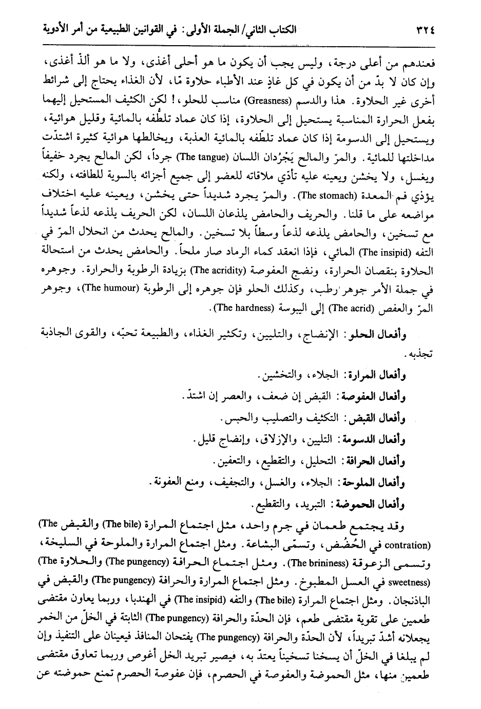 فعندهم من أَعلَى دَرَجَة وَلَيْسَ يجب أَن يكون مَا هُوَ أحلى أغذى وَلَا مَا هُوَ ألذ أغذى وَإِن كَانَ لَا بُد من أَن يكون فِي كل غاذ عِنْد الْأَطِبَّاء حلاوة مَا لِأَن الْغذَاء يحْتَاج إِلَى شَرَائِط أُخْرَى غير الْحَلَاوَة. هَذَا وَالدَّسم مُنَاسِب لحلو لَكِن الكثيف المستحيل إِلَيْهِمَا بِفعل الْحَرَارَة الْمُنَاسبَة يَسْتَحِيل إِلَى الْحَلَاوَة إِذا كَانَ عماد تلطفه بالمائية وَقَلِيل هوائية ويستحيل إِلَى الدسومة إِذا كَانَ عماد تلطّفه بالمائية العذبة ويخالطها هوائية كَثِيرَة اشتدّت مداخلتها للمائية. والمر والمالح يَجردان اللِّسَان جردا لَكِن المالج يجرد خَفِيفا وَيغسل وَلَا يخشن ويعينه عَلَيْهِ تأدي ملاقاته للعضو إِلَى جَمِيع أَجْزَائِهِ بِالسَّوِيَّةِ للطافته وَلكنه يُؤْذِي فَم الْمعدة. والمر يجرد شَدِيدا حَتَّى يخشن ويعينه عَلَيْهِ اخْتِلَاف موَاضعه على مَا قُلْنَا. والحريف والحامض يلذعان اللِّسَان لَكِن الحريف يلذعه لذعاً شَدِيدا مَعَ تسخين والحامض يلذعه لذعاً وسطا بِلَا تسخين. والمالح يحدث من انحلال المرّ فِي التفه المائي فَإِذا انْعَقَد كَمَاء الرماد صَار ملحاً. والحامض يحدث من اسْتِحَالَة الْحَلَاوَة بِنُقْصَان الْحَرَارَة ونضج العفوصة بِزِيَادَة الرُّطُوبَة والحرارة. وجوهره فِي جملَة الْأَمر جَوْهَر رطب وَكَذَلِكَ الحلو فَإِن جوهره إِلَى الرُّطُوبَة وجوهر المر والعفص إِلَى اليبوسة. وأفعال الحلو: الإنضاج والتليين وتكثير الْغذَاء والطبيعة تحبه والقوى الجاذبة تجذبه. وأفعال المرارة: الْجلاء والتخشين. وأفعال العفوصة: الْقَبْض إِن ضعف وَالْعصر إِن اشتدّ. وأفعال الْقَبْض: التكثيف والتصليب وَالْحَبْس. وأفعال الدسومة: التليين والإزلاق وإنضاج قَلِيل. وأفعال الحرافة: التَّحْلِيل والتقطيع والتعفين. وأفعال الملوحة: الْجلاء وَالْغسْل والتجفيف وَمنع العفونة. وأفعال الحموضة: التبريد والتقطيع. وَقد يجْتَمع طعمان فِي جرم وَاحِد مثل اجْتِمَاع المرارة وَالْقَبْض فِي الحضُض وَتسَمى البشاعة. وَمثل اجْتِمَاع المرارة والملوحة فِي السليخة وَتسَمى الزعوقة. وَمثل اجْتِمَاع الرافة والحلاوة فِي الْعَسَل الْمَطْبُوخ. وَمثل اجْتِمَاع المرارة والحرافة وَالْقَبْض فِي الباذنجان. وَمثل اجْتِمَاع المرارة والتفه فِي الهندبا وَرُبمَا يعاون مُقْتَضى طعمين على تَقْوِيَة مُقْتَضى طعم فَإِن الحدة والحرافة الثَّابِتَة فِي الْخلّ من الْخمر يجعلانه أشدّ تبريداً لِأَن الحدة والحرافة يفتحان المنافذ فيعينان على التَّنْفِيذ وَإِن لم يبلغَا فِي الْخلّ أَن يسخنا تسخيناً يعْتد بِهِ فَيصير تبريد الْخلّ أغوص وَرُبمَا تعاوق مُقْتَضى طعمين مِنْهَا مثل الحموضة والعفوصة فِي الحصرم فَإِن عفوصة الحصرم تمنع حموضته عَن