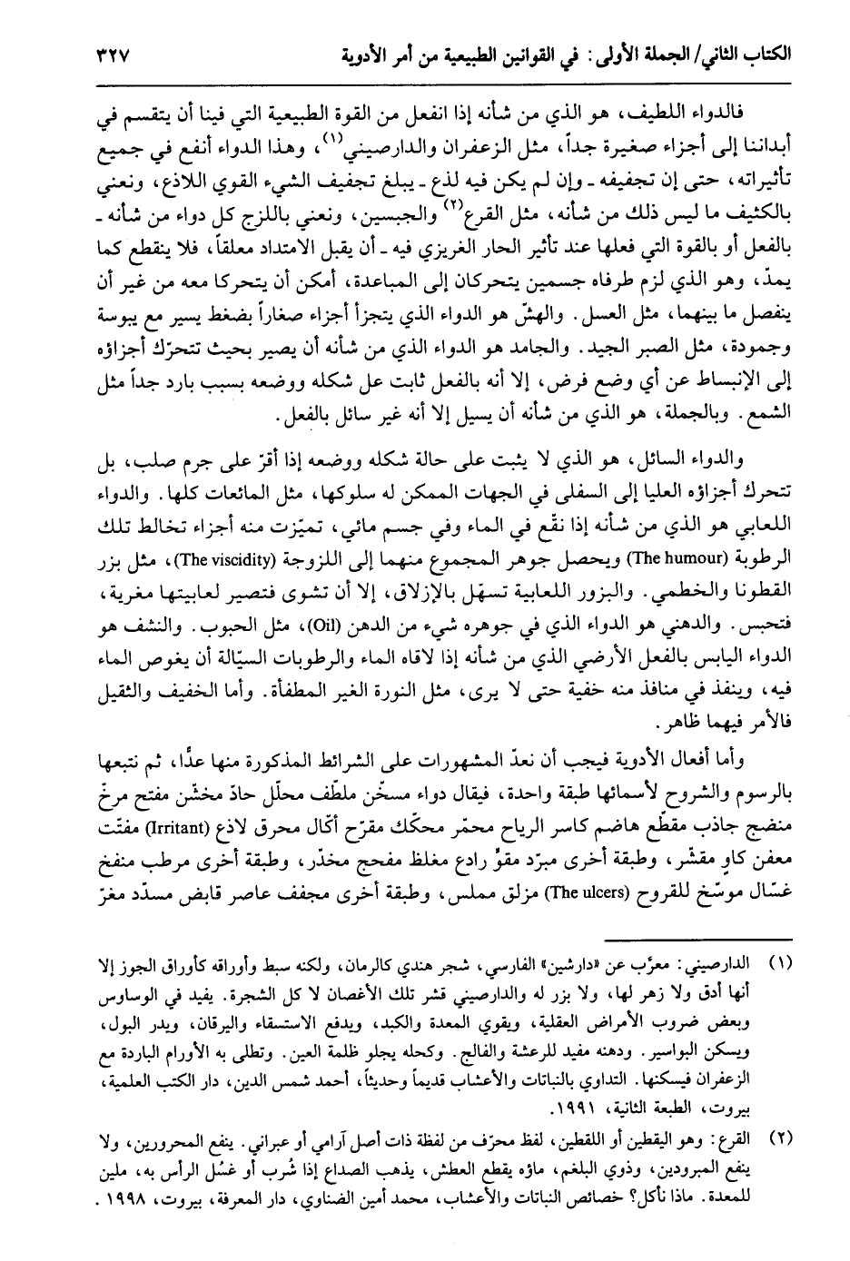 فالدواء اللَّطِيف هُوَ الَّذِي من شَأْنه إِذا انفعل من الْقُوَّة الطبيعية الَّتِي فِينَا أَن يتقسم فِي أبداننا إِلَى أَجزَاء صَغِيرَة جدا مثل الزَّعْفَرَان والدارصيني وَهَذَا الدَّوَاء أَنْفَع فِي جَمِيع تأثيراته حَتَّى إِن تجفيفه - وَإِن لم يكن فِيهِ لذع - يبلغ تجفيف الشَّيْء الْقوي اللاذع ونعني الكثيف مَا لَيْسَ ذَلِك من شَأْنه مثل القرع والجبسين ونعني باللزج كل دَوَاء من شَأْنه - الْفِعْل أَو بِالْقُوَّةِ الَّتِي فعلهَا عِنْد تَأْثِير الْحَار الغريزي فِيهِ - أَن يقبل الامتداد مُعَلّقا فَلَا يَنْقَطِع مَا يمدّ وَهُوَ الَّذِي لزم طرفاه جسمين يتحركان إِلَى المباعدة أمكن أَن يتحركا مَعَه من غير أَن ينْفَصل مَا بَينهمَا مثل الْعَسَل. والهشّ هُوَ الدَّوَاء الَّذِي يتَجَزَّأ أَجزَاء صغَارًا بضغط يسير مَعَ يبوسة وجمودة مثل الصَّبْر الْجيد. والجامد هُوَ الدَّوَاء الَّذِي من شَأْنه أَن يصير حَيْثُ تتحرك أجزاؤه إِلَى الإنبساط عَن أَي وضع فرض إِلَّا أَنه بِالْفِعْلِ ثَابت عل شكله وَضعه بِسَبَب بَارِد جدا مثل الشمع. وَبِالْجُمْلَةِ هُوَ الَّذِي من شَأْنه أَن يسيل إِلَّا أَنه غير سَائل بِالْفِعْلِ. والدواء السَّائِل هُوَ الَّذِي لَا يثبت على حَالَة شكله وَوَضعه إِذا أقرّ على جرم صلب بل تتحرك أجزاؤه الْعليا إِلَى السُّفْلى فِي الْجِهَات الْمُمكن لَهُ سلوكها مثل الْمَائِعَات كلهَا. والدواء اللعابي هُوَ الَّذِي من شَأْنه إِذا نقّع فِي المَاء وَفِي جسم مائي تميّزت مِنْهُ أَجزَاء تخالط تِلْكَ الرُّطُوبَة وَيحصل جَوْهَر الْمَجْمُوع مِنْهُمَا إِلَى اللزوجة مثل بزر القطونا والخطمي. والبزور اللعابية تسهّل بالإزلاق إِلَّا أَن تشوى فَتَصِير لعابيتها مغرية فتحبس. والدهني هُوَ الدَّوَاء الذَي فِي جوهره شَيْء من الدّهن مثل الْحُبُوب. والنشف هُوَ الدَّوَاء الْيَابِس بِالْفِعْلِ الأرضي الَّذِي من شَأْنه إِذا لاقاه المَاء والرطوبات السيالة أَن يغوص المَاء وَينفذ فِي منافذ مِنْهُ خُفْيَة حَتَّى لَا يرى مثل النورة الْغَيْر المطفأة. وَأما الْخَفِيف ثقيل فَالْأَمْر فيهمَا ظَاهر. وَأما أَفعَال الْأَدْوِيَة فَيجب أَن نعدّ المشهورات على الشَّرَائِط الْمَذْكُورَة مِنْهَا عدا ثمَّ لَهَا بالرسوم والشروح لأسمائها طبقَة وَاحِدَة فَيُقَال دَوَاء مسخّن ملطّف مُحَلل حادّ مخشن مفتح مرخ منضج جاذب مقطع هاضم كاسر الرِّيَاح محْضر محكّك مقرح أكال محرق لاذع مفتت معفن كاوٍ مقشر وطبقة أُخْرَى مبرّد مقو رادع مغلظ مفجع مخدر وطبقة أُخْرَى مرطب منفتح غسال موسّخ للقروح مزلق مملس وطبقة أُخْرَى مجفف عاصر قَابض مُسَدّد