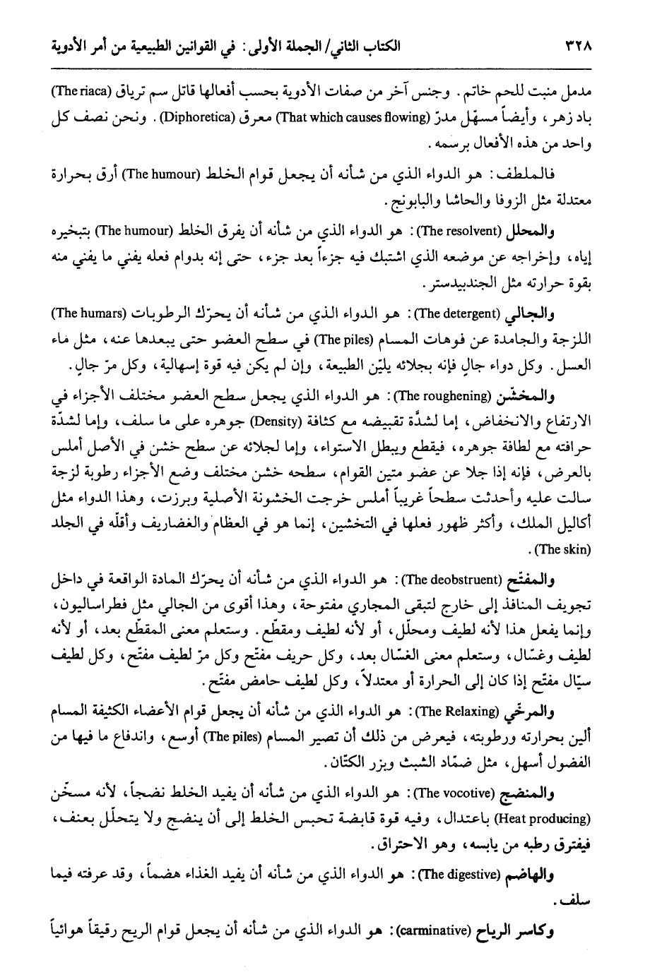 مدمل منبت للحم خَاتم. وجنس آخر من صِفَات الْأَدْوِيَة بِحَسب أفعالها قَاتل سم ترياق بادزهر وَأَيْضًا مسهل مدر معرق. وَنحن نصف كل وَاحِد من هَذِه الْأَفْعَال برسمه. فالملطف: هُوَ الدَّوَاء الَّذِي من شَأْنه أَن يَجْعَل قوام الْخَلْط أرق بحرارة معتدلة مثل الزوفا والمحلل: هُوَ الدَّوَاء الَّذِي من شَأْنه أَن يفرق الْخَلْط بتبخيره إِيَّاه وإخراجه عَن مَوْضِعه الَّذِي اشتبك فِيهِ جُزْءا بعد جُزْء حَتَّى إِنَّه بدوام فعله يفني مَا يفني مِنْهُ بِقُوَّة حرارته فَمثل الجندبيدستر. والجالي: هُوَ الدَّوَاء الَّذِي من شَأْنه أَن يحرّك الرطوبات اللزجة والجامدة عَن فوهات المسام فِي مسطح الْعُضْو حَتَّى يبعدها عَنهُ مثل مَاء الْعَسَل. وكل دَوَاء جالٍ فَإِنَّهُ بجلائه ويليّن الطبيعة وَإِن لم يكن فِيهِ قُوَّة إسهالية وكل مر جالٍ. والمخشن: هُوَ الدَّوَاء الَّذِي يَجْعَل سطح الْعُضْو مُخْتَلف الْأَجْزَاء فِي الِارْتفَاع والانخفاض إِمَّا لشدَّة تقبيضه مَعَ كَثَافَة جوهره على مَا سلف وَإِمَّا لشدّة حرافته مَعَ لطافة جوهره فَيقطع وَيبْطل الاسْتوَاء وَإِمَّا لجلائه عَن سطح خشن فِي الأَصْل أملس بِالْعرضِ فإذاه إِذا جلا عَن عُضْو متين القوام سطحه خشن مُخْتَلف وضع الْأَجْزَاء رُطُوبَة لزجة سَالَتْ عَلَيْهِ وأحدثت سطحاً غَرِيبا أملس خرجت الخشونة الْأَصْلِيَّة وبرزت وَهَذَا الدَّوَاء مثل أكاليل الْملك وَأكْثر ظُهُور فعلهَا فِي التخشين إِنَّمَا هُوَ فِي الْعِظَام والغضاريف وَأقله فِي الْجلد. والمفتّح: هُوَ الدَّوَاء الَّذِي من شَأْنه أَن يُحَرك الْمَادَّة الْوَاقِعَة فِي دَاخل تجويف المنافذ إِلَى خَارج لتبقى المجاري مَفْتُوحَة وَهَذَا أقوى من الجالي مثل فطراساليون وَإِنَّمَا يفعل هَذَا لِأَنَّهُ لطيف ومحلّل أَو لِأَنَّهُ لطيف ومقطّع. وستعلم معنى المقطع بعد أَو لِأَنَّهُ لطيف وغسّال وستعلم معنى الغسّال بعد وكل حريف مفتّح وكل مرّ لطيف مفتح وكل لطيف سيال مفتح إِذا كَانَ إِلَى الْحَرَارَة أَو معتدلاً وكل لطيف حامض مفتح. والمرخَي: هُوَ الدَّوَاء الَّذِي من شَأْنه أَن يَجْعَل قوام الْأَعْضَاء الكثيفة المسام أَلين بحرارته ورطوبته فَيعرض من ذَلِك أَن تصير المسام أوسع واندفاع مَا فِيهَا من الفضول أسهل مثل ضمّاد الشبث وبزر الْكَتَّان. والمنضج: هُوَ الدَّوَاء الَّذِي من شَأْنه أَن يُفِيد الْخَلْط نضجاً لِأَنَّهُ مسخّن باعتدال وَفِيه قُوَّة قابضة تحبس الْخَلْط إِلَى أَن ينضج وَلَا يتحلّل بعنف فيفترق رطبه من يابسه وَهُوَ الاحتراق. والهاضم: هُوَ الدَّوَاء الَّذِي من شَأْنه أَن يُفِيد الْغذَاء هضماً وَقد عَرفته فِيمَا سلف. وكاسر الرِّيَاح: هُوَ الدَّوَاء الَّذِي من شَأْنه أَن يَجْعَل قوام الرّيح رَقِيقا هوائياً