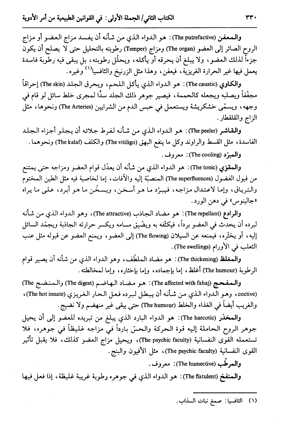 والمعفن: هُوَ الدَّوَاء الَّذِي من شَأْنه أَن يفْسد مزاج الْعُضْو أَو مزاج الرّوح الصائر إِلَى الْعُضْو ومزاج رطوبته بالتحليل حَتَّى لَا يصد أَن يكون جُزْءا لذَلِك الْعُضْو وَلَا يبلغ أَن يحرقه أَو يَأْكُلهُ ويحفل رطوبته بل يبْقى فِيهِ رُطُوبَة فَاسِدَة يعْمل فِيهَا غير الْحَرَارَة الغريزية فيعفن وَهَذَا مثل الزرنيج والثافسيا وَغَيره. والكاوي: هُوَ الدَّوَاء الَّذِي يَأْكُل اللَّحْم وَيحرق الْجلد إحراقاً مجففاً ويصلبه ويجعله كالحممة فَيصير جَوْهَر ذَلِك الْجلد سدا لمجرى خلط سَائل لَو قَامَ فِي وَجهه وَيُسمى خشكريشة وَيسْتَعْمل فِي حبس الدَّم من الشرايين وَنَحْوهَا مثل الزاج والقلقطار. والقاشر: هُوَ الدَّوَاء الَّذِي من شَأْنه لفرط جلائه أَن يجلو أَجزَاء الْجلد الْفَاسِدَة مثل الْقسْط والمبرٌ د: مَعْرُوف. والمقوي: هُوَ الدَّوَاء الَّذِي من شَأْنه أَن يعدل قوام الْعُضْو ومزاجه حَتَّى يمْتَنع من قبُول الفضول المنصبة إِلَيْهِ والآفات إِمَّا لخاصية فِيهِ مثل الطين الْمَخْتُوم والترياق وَإِمَّا لاعتدال مزاجه فيبرد مَا هُوَ أسخن ويسخن مَا هُوَ أبرد على مَا يرَاهُ جالينوس فِي دهن الْورْد. والرادع: هُوَ مضاد الجاذب وَهُوَ الدَّوَاء الَّذِي من شَأْنه لبرده أَن يحدث فِي الْعُضْو بردا فيكثفه بِهِ ويضيق مسامه وَيكسر حرارته الجاذبة ويجمد السَّائِل إِلَيْهِ أَو يخثره فيمنعه عَن السيلان إِلَى الْعُضْو وَيمْنَع الْعُضْو عَن قبُوله مثل عِنَب الثَّعْلَب فِي الأورام. والمغلظ: هُوَ مضاد الملطف وَهُوَ الدَّوَاء الَّذِي من شَأْنه أَن يصير قوام الرُّطُوبَة اغلظ إِمَّا بإجماده وَإِمَّا بإخثاره وَإِمَّا لمخالطته. والمفحج: هُوَ مضاد الهاضم والمنضج وَهُوَ الدَّوَاء الَّذِي من شَأْنه أَن يبطل لبرده فعل