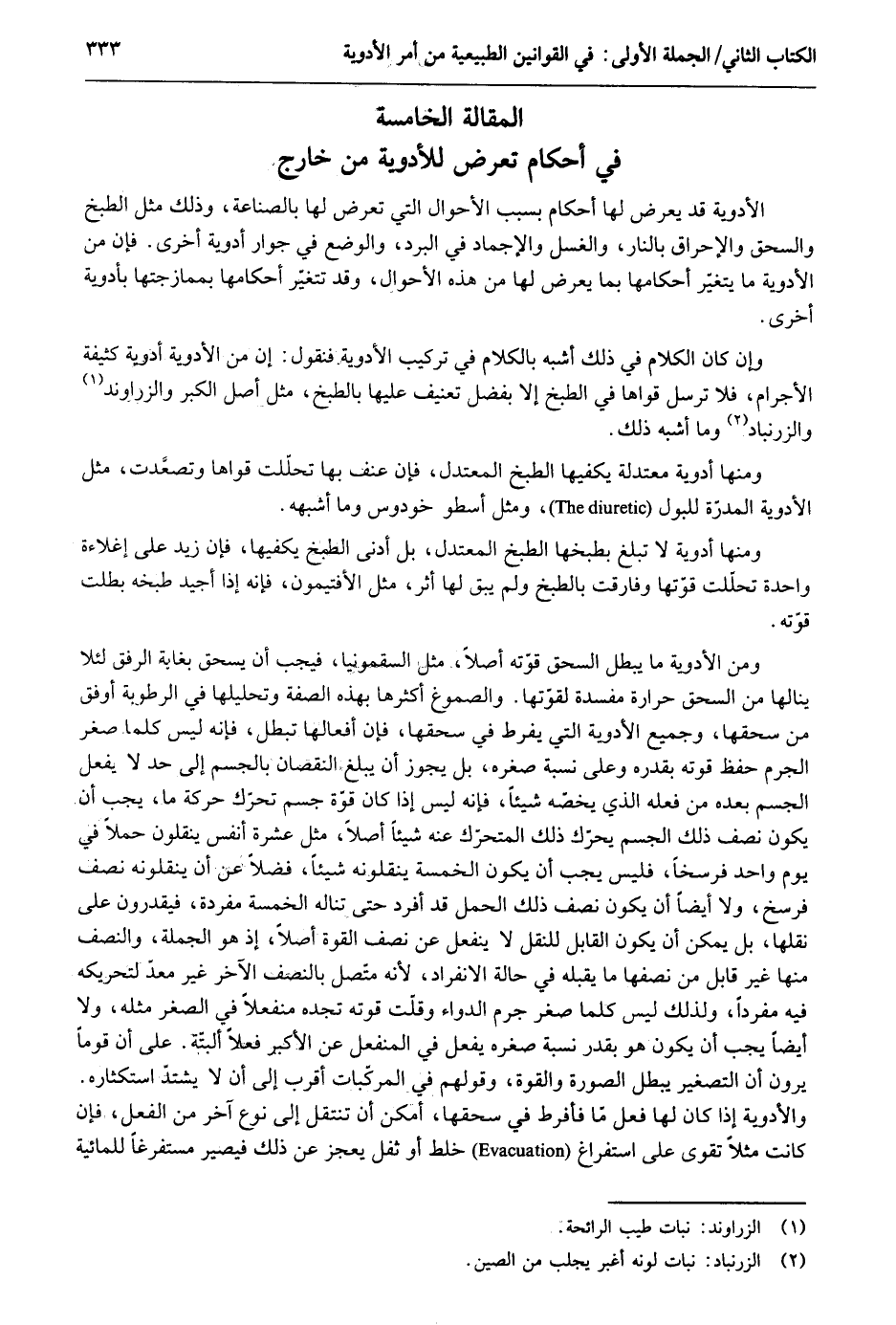 الْمقَالة الْخَامِسَة أَحْكَام تعرض للأدوية من خَارج الْأَدْوِيَة قد يعرض لَهَا أَحْكَام بِسَبَب الْأَحْوَال الَّتِي تعرض لَهَا بالصناعة وَذَلِكَ مثل الطَّبْخ والسحق والإحراق بالنَّار وَالْغسْل والإجماد فِي الْبرد والوضع فِي جوَار أدوية أُخْرَى. فَإِن من الْأَدْوِيَة مَا يتَغَيَّر أَحْكَامهَا بِمَا يعرض لَهَا من هَذِه الْأَحْوَال وَقد تَتَغَيَّر أَحْكَامهَا بممازجتها بأدوية أُخْرَى. وَإِن كَانَ الْكَلَام فِي ذَلِك أشبه بالْكلَام فِي تركيب الْأَدْوِيَة فَنَقُول: إِن من الْأَدْوِيَة أدوية كثيفة الأجرام فَلَا ترسل قواها فِي الطَّبْخ إِلَّا بِفضل تعنيف عَلَيْهَا بالطبخ مثل أصل الْكبر والزراوند والزرنباد وَمَا أشبه ذَلِك. وَمِنْهَا أدوية معتدلة يكفيها الطَّبْخ المعتدل فَإِن عنف بهَا تحللت قواها وتصعَدت مثل الْأَدْوِيَة المدرة للبول وَمثل أسطو خودوس وَمَا أشبهه. وَمِنْهَا أدوية لَا تبلغ بطبخها الطَّبْخ المعتدل بل أدنى الطَّبْخ يكفيها فَإِذا زيد على إغلاءة وَاحِدَة تحلّلت قوتها وَفَارَقت بالطبخ وَلم يبْق لَهَا أثر مثل الأفتيمون فَإِنَّهُ إِذا أجيد طبخه بطلت قوّته. وَمن الْأَدْوِيَة مَا يبطل السحق قوته أصلا مثل السقمونيا فَيجب أَن يسحق بغاية الرِّفْق لِئَلَّا ينالها من السحق حرارة مفْسدَة لقوتها. والصموغ أَكْثَرهَا بِهَذِهِ الصّفة وتحليلها فِي الرُّطُوبَة أوفق من سحقها وَجَمِيع الْأَدْوِيَة الَّتِي يفرط فِي سحقها فَإِن أفعالها تبطل فَإِنَّهُ لَيْسَ كلما صغر الجرم حفظ قوته بِقَدرِهِ وعَلى نِسْبَة صغره بل يجوز أَن يبلغ النُّقْصَان بالجسم إِلَى حد لَا يفعل الْجِسْم بعده من فعله الَّذِي يخصّه شَيْئا فَإِنَّهُ لَيْسَ إِذا كَانَ قوّة جسم تحرّك حَرَكَة مَاء يجب أَن يكون نصف ذَلِك الْجِسْم يحرّك ذَلِك المتحرّك عَنهُ شَيْئا أصلا مثل عشرَة أنفس ينقلون حملا فِي يَوْم وَاحِد فرسخاً فَلَيْسَ يجب أَن يكون الْخَمْسَة ينقلونه شَيْئا فضلا عَن أَن ينقلونه نصف فَرسَخ وَلَا أَيْضا أَن يكون نصف ذَلِك الْحل قد أفرد حَتَّى تناله الْخَمْسَة مُفْردَة فيقدرون على نقلهَا بل يُمكن أَن يكون الْقَابِل للنَّقْل لَا ينفعل عَن نصف الْقُوَّة أصلا إِذْ هُوَ الْجُمْلَة وَالنّصف مِنْهَا غير قَابل من نصفهَا مَا يقبله فِي حَالَة الإنفراد لِأَنَّهُ متّصل بِالنِّصْفِ الآخر غير معدّ لتحريكه فِيهِ مُفردا وَلذَلِك لَيْسَ كلما صغر جرم الدَّوَاء وَقلت قوته تَجدهُ منفعلاً فِي الصغر مثله وَلَا أَيْضا يجب أَن يكون هُوَ بِقدر نِسْبَة صغره يفعل فِي المنفعل عَن الْأَكْبَر فعلا الْبَتَّةَ. على أَن قوما يرَوْنَ أَن التصغير يبطل الصُّورَة وَالْقُوَّة وَقَوْلهمْ فِي المركّبات أقرب إِلَى أَن لَا يشتدّ استكثاره. والأدوية إِذا كَانَ لَهَا فعل مّا أفرط فِي سحقها أمكن أَن تنْتَقل إِلَى نوع آخر من الْفِعْل فَإِن كَانَت مثلا تقوى على استفراغ خلط أَو ثفل يعجز عَن ذَلِك فَيصير مستفرغاً للمائية