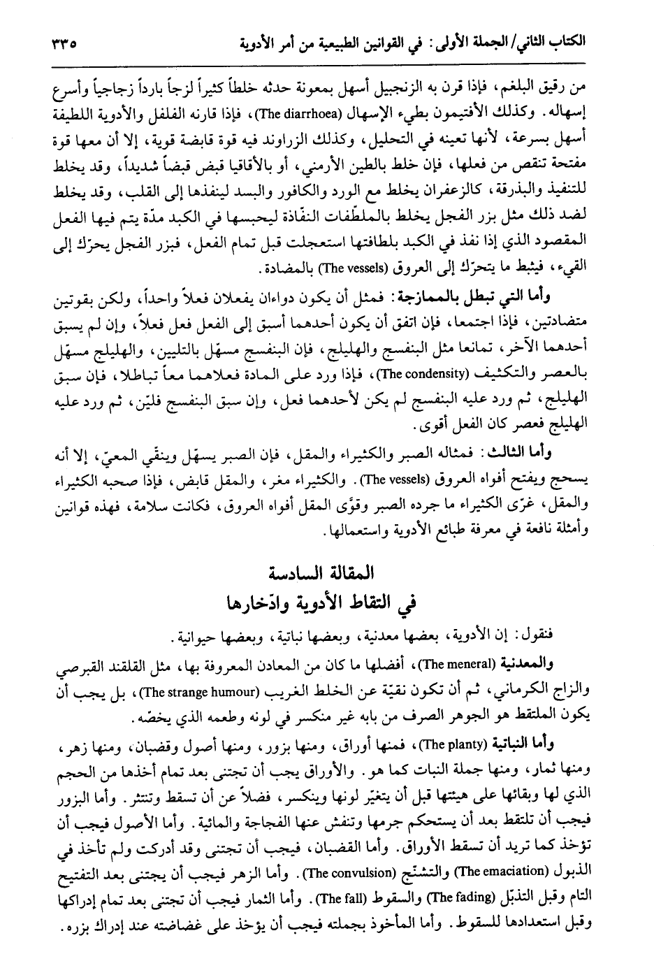 من رَقِيق البلغم فَإِذا قرن بِهِ الزنجبيل أسهل بمعونة حَدثهُ خلطاً كثيرا لزجاً بَارِدًا زجاجياً وأسرع إسهاله. وَكَذَلِكَ الأفتيمون بطيء الإسهال فَإِذا قارنه الفلفل والأدوية اللطيفة أسهل بِسُرْعَة لِأَنَّهَا تعينه فِي التَّحْلِيل وَكَذَلِكَ الزراوند فِيهِ قُوَّة قابضة قَوِيَّة إِلَّا أَن مَعهَا قُوَّة مفتحة تنقص من فعلهَا فَإِن خلط بالطين الأرمني أَو بالأقاقيا قبض قبضا شَدِيدا وَقد يخلط للتنفيذ والبذرقة كالزعفران يخلط مَعَ الْورْد والكافور والبسد لينفذها إِلَى الْقلب وَقد يخلط لضد ذَلِك مثل بزر الفجل يخلط بالملطفات النفاذة ليحبسها فِي الكبد مُدَّة يتم فِيهَا الْفِعْل الْمَقْصُود الَّذِي إِذا نفذ فِي الكبد بلطافتها استعجلت قبل تَمام الْفِعْل فبزر الفجل يُحَرك إِلَى الْقَيْء فيثبط مَا يَتَحَرَّك إِلَى الْعُرُوق بالمضادة. وَأما الَّتِي تبطل بالممازجة: فَمثل أَن يكون دواءان يفْعَلَانِ فعلا وَاحِدًا وَلَكِن بقوتين متضادتين فَإِذا اجْتمعَا فَإِن اتّفق أَن يكون أَحدهمَا أسبق إِلَى الْفِعْل فعل فعلا وَإِن لم يسْبق أَحدهمَا الآخر تمانعا مثل البنفسج والهليلج فَإِن البنفسج مسهّل بالتليين والهليلج مسقل بالعصر والتكثيف فَإِذا ورد على الْمَادَّة فعلاهما مَعًا تباطلا فَإِن سبق الهليلج ثمَّ ورد عَلَيْهِ البنفسج وَأما الثَّالِث: فمثاله الصَّبْر والكثيراء والمقل فَإِن الصَّبْر يسهّل وينقي المعيّ إِلَّا أَنه يسحج وَيفتح أَفْوَاه الْعُرُوق. والكثيراء مغر والمقل قَابض فَإِذا صَحبه الكثيراء والمقل غرّى الكثيراء مَا جرده الصَّبْر وقوَّى الْمقل أَفْوَاه الْعُرُوق فَكَانَت سَلامَة فَهَذِهِ قوانين وأمثلة نافعة فِي معرفَة طبائع الْأَدْوِيَة واستعمالها. الْمقَالة السَّادِسَة فِي الْتِقَاط الْأَدْوِيَة وادّخارها فَنَقُول: إِن الْأَدْوِيَة بَعْضهَا معدنية وَبَعضهَا نباتية وبعضْها حيوانية. والمعدنية أفضلهَا مَا كَانَ من الْمَعَادِن الْمَعْرُوفَة بهَا مثل القلقند القبرصي والزاج الْكرْمَانِي ثمَّ أَن تكون نقية عَن الْخَلْط الْغَرِيب بل يجب أَن يكون الْمُلْتَقط هُوَ الْجَوْهَر الصّرْف من بَابه غير منكسر فِي لَونه وطعمه الَّذِي يخصّه. وَأما النباتية فَمِنْهَا أوراق وَمِنْهَا بزور وَمِنْهَا أصُول وقضبان وَمِنْهَا زهر وَمِنْهَا ثمار وَمِنْهَا جملَة النَّبَات كَمَا هُوَ. والأوراق يجب أَن تجتنى بعد تَمام أَخذهَا من الحجم الَّذِي لَهَا وبقائها على هيئتها قبل أَن يتَغَيَّر لَوْنهَا وينكسر فضلا عَن أَن تسْقط وتنتثر. وَأما البزور فَيجب أَن تلْتَقط بعد أَن يستحكم جرمها وتنفش عَنْهَا الفجاجة والمائية. وَأما الْأُصُول فَيجب أَن تُؤْخَذ كَمَا تُرِيدُ أَن تسْقط الأوراق. وَأما القضبان فَيجب أَن تجتنى وَقد أدْركْت وَلم تَأْخُذ فِي الذبول والتشنج. وَأما الزهر فَيجب أَن يجتنى بعد التفتيح التَّام وَقبل التذبل والسقوط. وَأما الثِّمَار فَيجب أَن تجتنى بعد تَمام إِدْرَاكهَا وَقبل استعدادها للسقوط. وَأما الْمَأْخُوذ بجملته فَيجب أَن يُؤْخَذ على غضاضته عِنْد إِدْرَاك بزره.