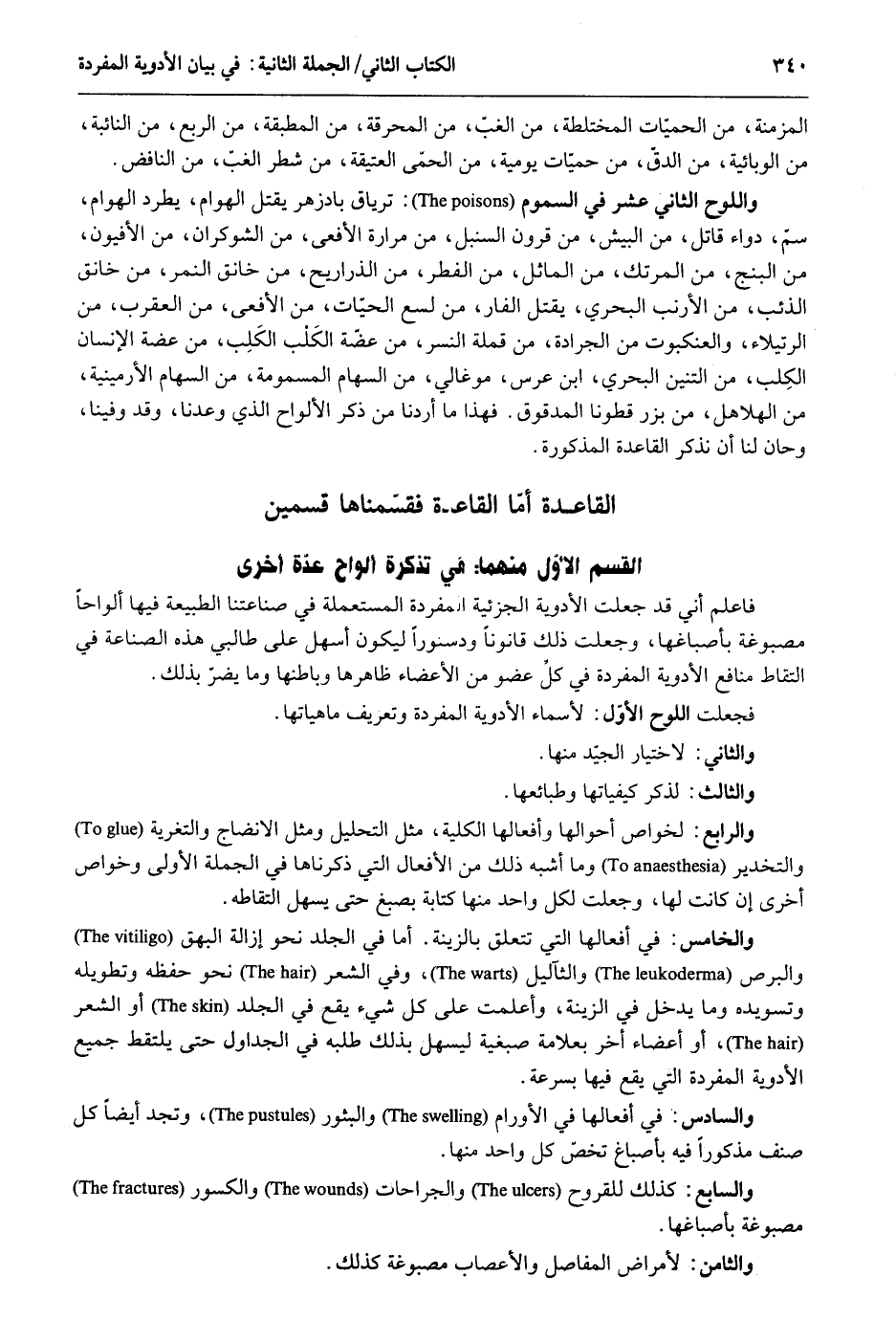 المزمنة من الْحَيَّات المختلطة من الغب من المحرقة من المطبقة من الرّبع من النائبة من الوبائية من الدق من حميّات يومية من الْحمى العتيقة من شطر الغب من النافض. اللَّوْح الثَّانِي عشر السمُوم ترياق بادزهر يقتل الْهَوَام يطرد الْهَوَام سم دَوَاء قَاتل من البيش من قُرُون السنبل من مرَارَة الأفعى من الشوكران من الأفيون من البنج من المرتك من الماثل من الْفطر من الذراريح من خانق النمر من خانق الذِّئْب من الأرنب البحري يقتل الفار من لسع الْحَيَّات من الأفعى من الْعَقْرَب من الرتيلاء وَالْعَنْكَبُوت من الجرادة من قملة النسْر من عضة الكَلْب الكَلِب من عضة الْإِنْسَان الكِلب من التنين البحري ابْن عرس موغالي من السِّهَام المسمومة من السِّهَام الأرمينية من الهلاهل من بزر قطونا المدقوق. فَهَذَا مَا أردنَا من ذكر الألواح الَّذِي وعدنا وَقد وَفينَا وحان لنا أَن نذْكر الْقَاعِدَة الْمَذْكُورَة. الْقَاعِدَة فقسَمناها قسمَيْنِ الْقسم الأول من الْقَاعِدَة فِي تذكرة أَلْوَاح عدَّة أُخْرَى فَاعْلَم أَنِّي قد جعلت الْأَدْوِيَة الْجُزْئِيَّة المفردة المستعملة فِي صناعتنا الطبيعة فِيهَا ألواحاً مصبوغة بأصباغها وَجعلت ذَلِك قانوناً ودستوراً ليَكُون أسهل على طالبي هَذِه الصِّنَاعَة فِي الْتِقَاط مَنَافِع الْأَدْوِيَة المفردة فِي كل عُضْو من الْأَعْضَاء ظَاهرهَا وباطنها وَمَا يضر بذلك. فَجعلت اللَّوْح الأول: لأسماء الْأَدْوِيَة المفردة وتعريف ماهياتها. وَالثَّانِي: لاختيار الْجيد مِنْهَا. وَالثَّالِث: لذكر كيفياتها وطبائعها. وَالرَّابِع: لخواص أحوالها وأفعالها الْكُلية مثل التَّحْلِيل وَمثل الإنضاج والتغرية والتخدير وَمَا أشبه ذَلِك من الْأَفْعَال الَّتِي ذَكرنَاهَا فِي الْجُمْلَة الأولى وخواص أُخْرَى إِن كَانَت لَهَا وَجعلت لكل وَاحِد وَالْخَامِس: فِي أفعالها الَّتِي تتَعَلَّق بالزينة. أما فِي الْجلد نَحْو إِزَالَة البهق والبرص والتآليل وَفِي الشّعْر نَحْو حفظه وتطويله وتسويده وَمَا يدْخل فِي الزِّينَة وأعلمت على كل شَيْء يَقع فِي الْجلد أَو الشّعْر أَو أَعْضَاء أخر بعلامة صبغية ليسهل بذلك طلبه فِي الجداول حَتَّى يلتقط جَمِيع الْأَدْوِيَة المفردة الَّتِي يَقع فِيهَا بِسُرْعَة. وَالسَّادِس: فِي أفعالها فِي الأورام والبثور وتجد أَيْضا كل صنف مَذْكُورا فِيهِ بأصباغ تخصّ كل وَاحِد مِنْهَا. وَالسَّابِع: كَذَلِك للقروح والجراحات والكسور مصبوغة بأصباغها. وَالثَّامِن: لأمراض المفاصل والأعصاب مصبوغة كَذَلِك.