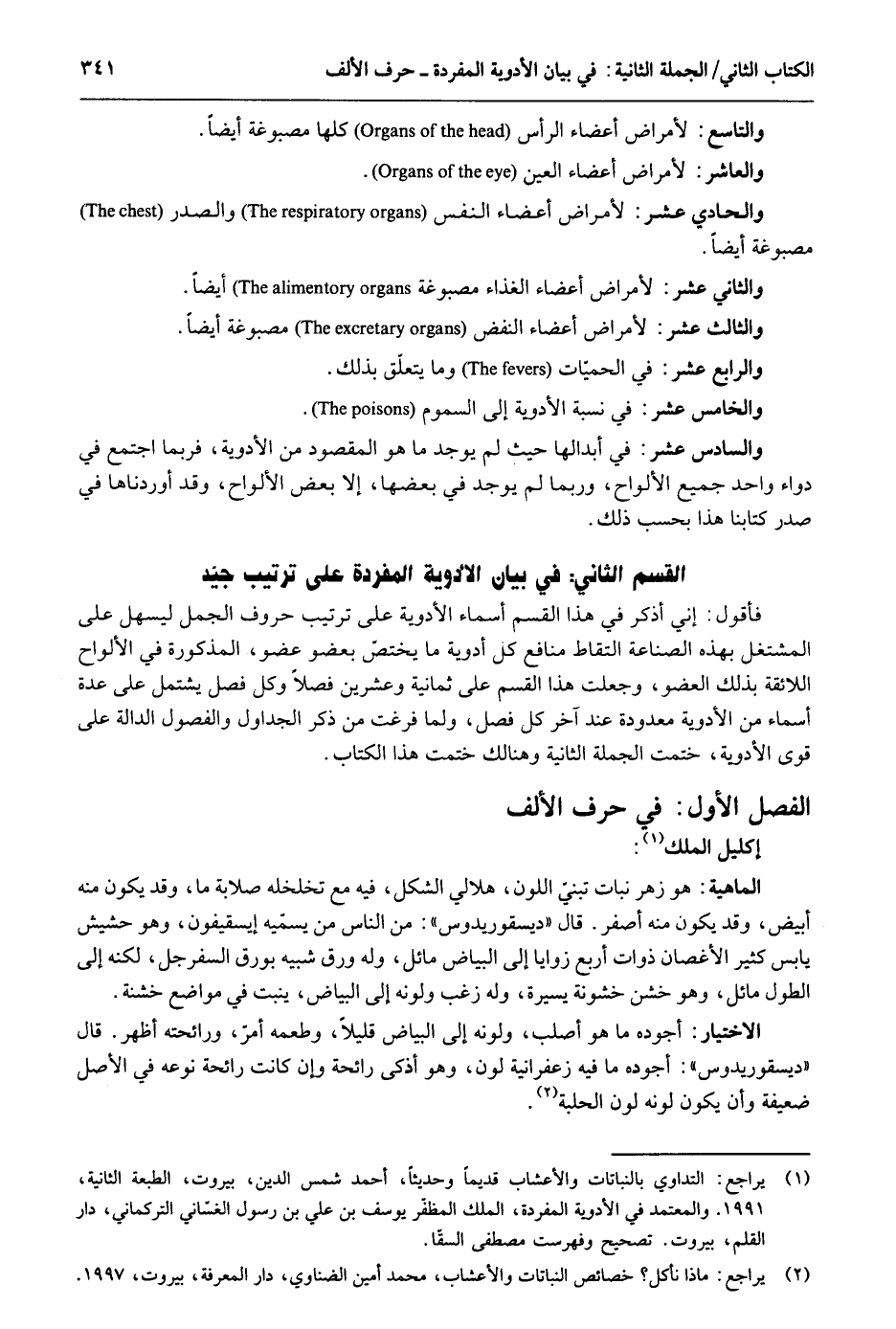 وَالتَّاسِع: لأمراض أَعْضَاء الرَّأْس كلهَا مصبوغة أَيْضا. والعاشر: لأمراض أَعْضَاء الْعين. وَالْحَادِي عشر: لأمراض أَعْضَاء النَّفس والصدر مصبوغة أَيْضا. وَالثَّانِي عشر: لأمراض أَعْضَاء الْغذَاء مصبوغة أَيْضا. وَالثَّالِث عشر: لأمراض أَعْضَاء النفض مصبوغة أَيْضا. وَالرَّابِع عشر: فِي الحميّات وَمَا يتعلّق بذلك. وَالسَّادِس عشر: فِي أبدالها حَيْثُ لم يُوجد مَا هُوَ الْمَقْصُود من الْأَدْوِيَة فَرُبمَا اجْتمع قي دَوَاء وَاحِد جَمِيع الألواح وَرُبمَا لم يُوجد فِي بَعْضهَا إِلَّا بعض الألواح وَقد أوردناها فِي صدر كتَابنَا هَذَا بِحَسب ذَلِك. الْقسم الثَّانِي الْأَدْوِيَة المفردة على تَرْتِيب جيد فَأَقُول: إِنِّي أذكر فِي هَذَا الْقسم أَسمَاء الأدويهّ على تَرْتِيب حُرُوف الْجمل ليسهل على المشتغل بِهَذِهِ الصِّنَاعَة الْتِقَاط مَنَافِع كل أدوية مَا يخْتَص بعضو عُضْو الْمَذْكُورَة فِي الألواح اللائقة بِتِلْكَ الْعُضْو وَجعلت هَذَا الْقسم على ثَمَانِيَة وَعشْرين فصلا وكل فصل يشْتَمل على عدَّة أَسمَاء من الْأَدْوِيَة مَعْدُودَة عِنْد آخر كل فصل وَلما فرغت من ذكر الجداول والفصول الدَّالَّة على قوى الْأَدْوِيَة ختمت الْجُمْلَة الثَّانِيَة وهنالك ختمت هَذَا الْكتاب. الْفَصْل الأول حرف الْألف إكليل الْملك. الْمَاهِيّة: هُوَ زهر نَبَات تبني اللَّوْن هلالي الشكل فِيهِ مَعَ تخلخله صلابة مَا وَقد يكون مِنْهُ أَبيض وَقد يكون مِنْهُ أصفر. قَالَ ديسقوريدوس: من النَّاس من يُسَمِّيه إيسقيفون وَهُوَ حشيش يَابِس كثير الأغصان ذَوَات أَربع زَوَايَا إِلَى الْبيَاض مائل وَله ورق شَبيه بورق السفرجل لكنه إِلَى الطول مائل وَهُوَ خشن خشونة يسيرَة وَله زغب ولونه إِلَى الْبيَاض ينْبت فِي مَوَاضِع خشنة. الِاخْتِيَار: أجوده مَا هُوَ أَصْلَب ولونه إِلَى الْبيَاض قَلِيلا وطعمه أمرّ ورائحته أظهر. قَالَ ديسقوريدوس: أجوده مَا فِيهِ زعفرانية لون وَهُوَ أذكى رَائِحَة وَأَن كَانَت رَائِحَة نَوعه فِي الأَصْل ضَعِيفَة وَأَن يكون لَونه لون الحلبة.