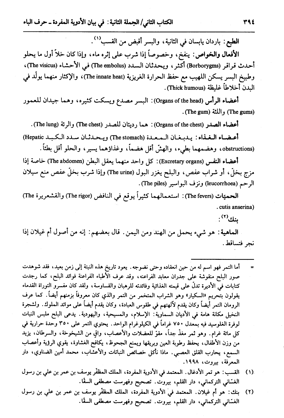 الطَّبْع: باردان يابسان فِي الثَّانِيَة والبسر أَقبض من القسب. الْأَفْعَال والخواص: ينْفخ وخصوصاً إِذا شرب على إثره مَاء وَإِذا كَانَ خلا أول مَا يحلو أحدث قراقر أَكثر ويحدثان السدد فِي الأحشاء وطبيخ الْبُسْر يسكن اللهيب مَعَ حفظ الْحَرَارَة الغريزية والإكثار مِنْهُمَا يُولد فِي الْبدن أخلاطاً غَلِيظَة. أَعْضَاء الرَّأْس: الْبُسْر مصدع ويسكت كَثِيره وهما جيدان للعمور واللثة. أَعْضَاء الصَّدْر: هما رديئان للصدر والرئة. أَعْضَاء الْغذَاء: يدبغان الْمعدة ويحدثان سدد الكبد وهضمهما بطيء والهش أقل هضماً وغذاؤهما يسير والحلو أقل بطئاً. أَعْضَاء النَّفس: كل وَاحِد مِنْهُمَا يعقل الْبَطن خَاصَّة إِذا مرج بخل أَو شراب عفص والبلح يغزر الْبَوْل وَإِذا شرب بخل عفص منع سيلان الرَّحِم ونزف البواسير. الحميات: استعمالهما كثيرا يُوقع فِي النافض والقشعريرة. بنك: الْمَاهِيّة: هُوَ شَيْء يحمل من الْهِنْد وَمن الْيمن. قَالَ بَعضهم: إِنَّه من أصُول أم غيلَان إِذا نجر فتساقط.