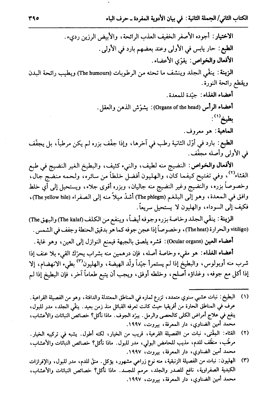 الأختيار: أجوده الْأَصْفَر الْخَفِيف العذب الرَّائِحَة رالأبيض الرزين رَدِيء. الطَّبْع: حَار يَابِس فِي الأولى وَعند بَعضهم بَارِد فِي الأولى. الْأَفْعَال والخواص: يُقَوي الْأَعْضَاء. الزِّينَة: ينقي الْجلد وينشف مَا تَحْتَهُ من الرطوبات ويطيب رَائِحَة الْبدن وَيقطع رَائِحَة النورة. أَعْضَاء الْغذَاء: جَيِّدَة للمعدة. أَعْضَاء الرَّأْس: يشوش الدّهن وَالْعقل. بطيخ: الْمَاهِيّة: هُوَ مَعْرُوف. الطَّبْع: بَارِد فِي أول الثَّانِيَة رطب فِي اً خرها وَإِذا جفف بزره لم يكن مرطباً بل يجفف فِي الأولى وَأَصله مجفف. الأفعالى والخواص: النضيج مِنْهُ لطيف والنيء كثيف والبطيخ الْغَيْر النضيج فِي طبع القثاء وَفِي تفتيح كَيْفَمَا كَانَ والهليون أفضل خليطاً من سائره ولحمه منضج جال وخصوصاً بزره والنضيج وَغير النضيج مِنْهُ جاليان وبزره أقوى جلاء ويستحيل إِلَى أَي خلط وَافق فِي الْمعدة وَهُوَ إِلَى البلغم أشدّ ميلًا مِنْهُ إِلَى الصَّفْرَاء فَكيف إِلَى السَّوْدَاء والهليون لَا يَسْتَحِيل سَرِيعا. الزِّينَة: ينقي الْجلد وخاصة بزره وجوفه أَيْضا وينفع من الكلف والبهق والحرارة وخصوصاً إِذا عجن جَوْفه كَمَا هُوَ بدقيق الْحِنْطَة وجفف فِي الشَّمْس. أَعْضَاء الْعين: قشره يلصق بالجبهة فَيمْنَع النَّوَازِل إِلَى الْعين وَهُوَ غَايَة. أَعْضَاء الْغذَاء: هُوَ مقيء وخاصة أَصله فَإِن دِرْهَمَيْنِ مِنْهُ بشراب يُحَرك الْقَيْء بِلَا عنف إِذا شرب مِنْهُ أوبولوس والبطيخ إِذا لم يستمرأ جيّداً ولد الهيضة والهليون بطيء الإنهضام إِلَّا إِذا أكل مَعَ جَوْفه وغذاؤه أصلح وخلطه أوفق وَيجب أَن يتبع طَعَاما آخر فَإِن البطيخٍ إِذا لم