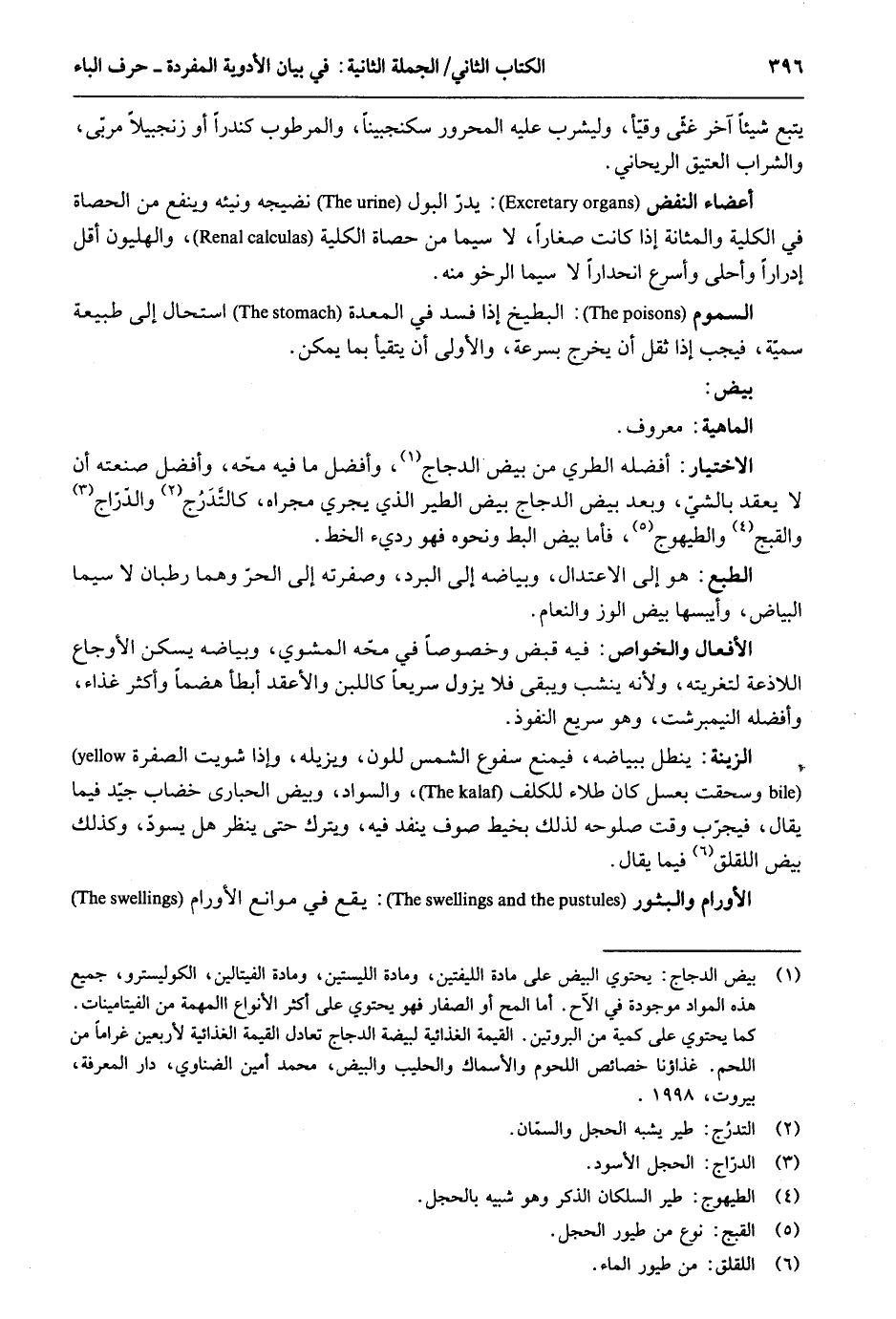 يتبع شَيْئا آخر غثى وقيأ وليشرب عَلَيْهِ المحرور سكنجبيناً والمرطوب كندراً أَو زنجبيلاً مربى وَالشرَاب الْعَتِيق الريحاني. أَعْضَاء النفض: يدر الْبَوْل نضيجه ونيه وينفع من الْحَصَاة فِي الْكُلية والمثانة إِذا كَانت صغَارًا لَا سِيمَا من حَصَاة الْكُلية والهليون أقك إدراراً وَأحلى وأسرع انحداراً لَا سِيمَا الرخو مِنْهُ. السمُوم: الْبِطِّيخ إِذا فسد فِي الْمعدة اسْتَحَالَ إِلَى طبيعة سميّة فَيجب إِذا ثفل أَن يخرج بِسُرْعَة وَالْأولَى أَن يتقيأ بِمَا يُمكن. بيض: الْمَاهِيّة: مَعْرُوف. الِاخْتِيَار: أفضله الطري من بيض الدَّجَاج وَأفضل مَا فِيهِ محّه وَأفضل صَنعته أَن لَا يعْقد بالشي وَبعد بيض الدَّجَاج بيض الطير الَّذِي يجْرِي مجْرَاه كالتدرج والدّرّاج والقبج والطيهوج فَأَما بيض البط وَنَحْوه فَهُوَ رَدِيء الْخط. الطَّبْع: هُوَ إِلَى الِاعْتِدَال وبياضه إِلَى الْبرد وصفرته إِلَى الْحر وهما رطبان لَا سِيمَا الْبيَاض وأيبسها بيض الوز والنعام. الْأَفْعَال والخواص: فِيهِ قبض وخصوصاً فِي مخه المشوي وبياضه يسكن الأوجاع اللاذعة لتغريته وَلِأَنَّهُ ينشب وَيبقى فَلَا يَزُول سَرِيعا كاللبن والأعقد أَبْطَأَ هضماً وَأكْثر غذَاء وأفضله النيمبرشت وَهُوَ سريع النّفُوذ. الزِّينَة: ينطل ببياضه فَيمْنَع سفوع الشَّمْس للون ويزيله وَإِذا شويت الصُّفْرَة وسحقت بِعَسَل كَانَ طلاء للكلف والسواد وبيض الْحُبَارَى خضاب جيد فِيمَا يُقَال فيجرب وَقت صلوحه لذَلِك بخيط صوف ينْفد فِيهِ وَيتْرك حَتَّى ينظر هَل يسودّ وَكَذَلِكَ بيض اللقلق فِيمَا يُقَال. الأورام والبثور: يَقع فِي مَوَانِع الأورام