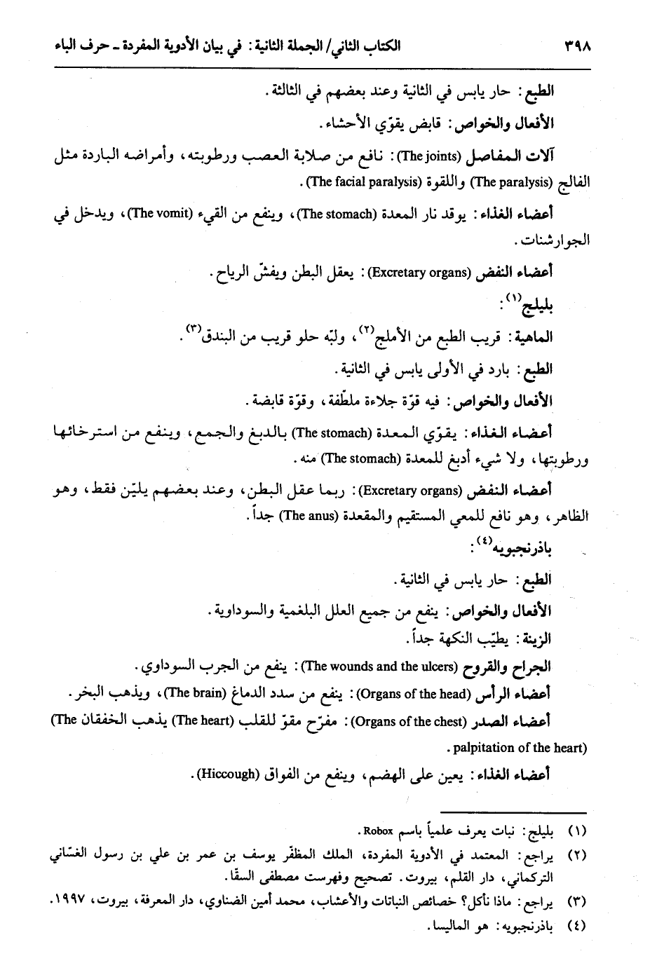 الطَّبْع: حَار يَابِس فِي الثَّانِيَة وَعند بَعضهم فِي الثَّالِثَة. الْأَفْعَال والخواص: قَابض يُقَوي الأحشاء. أَعْضَاء الْغذَاء: يُوقد نَار المعمدة وينفع من الْقَيْء وَيدخل فِي الجوارشنات. أَعْضَاء النفض: يعقل الْبَطن ويفش الرِّيَاح. يليلج: الْمَاهِيّة: قريب الطَّبْع من الأملج الأ ولبه حُلْو قريب من البندق. الطَّبْع: بَارِد فِي الأولى يَابِس فِي الثَّانِيَة. الْأَفْعَال والخواص: فِيهِ قُوَّة جلاءة ملطفة وقوّة قابضة. أَعْضَاء الْغذَاء: يُقَوي الْمعدة بالدبغ وَالْجمع وينفع من استرخائها ورطوبتها وَلَا شَيْء أدبغ للمعدة مِنْهُ. أَعْضَاء النفض: رُبمَا عقل الْبَطن وَعند بَعضهم يلين فَقَط وَهُوَ الظَّاهِر وَهُوَ نَافِع للمعي الْمُسْتَقيم والمقعدة جدا. باذرنجبويه: الطَّبْع: حَار يَابِس فِي الثَّانِيَة. الْأَفْعَال والخواص: ينفع من جَمِيع الْعِلَل البلغمية والسوداوية. الزِّينَة: يطيب النكهة جدا. أَعْضَاء الرَّأْس: ينفع من سدد الدِّمَاغ وَيذْهب البخر. أَعْضَاء الصَّدْر: مفرح مقو للقلب يذهب الخفقان. أَعْضَاء الْغذَاء: يعين على الهضم وينفع من الفواق.
