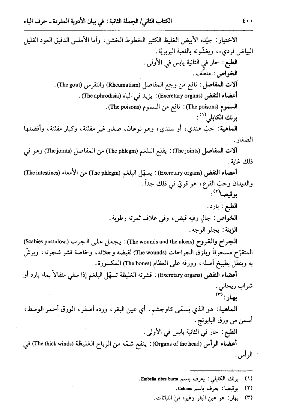 الِاخْتِيَار: جيده الْأَبْيَض الغليظ الْكثير الخطوط الخشن وَأما الأملس الدَّقِيق الْعود الْقَلِيل الْبيَاض فرديء ويغشّونه باللعبة البربرية. الطَّبْع: حَار فِي الثَّانِيَة يَابِس فِي الأولى. الْخَواص: ملطف. آلَات المفاصل: نَافِع من وجع المفاصل والنقرس. السمُوم: نَافِع من السمُوم. برنك الكابلي: الْمَاهِيّة: حبّ هندي أَو سندي وَهُوَ نَوْعَانِ صغَار غير مفننة وكبار مفنّنة وأفضلها الصغار. آلَات المفاصل: يقْلع البلغم من المفاصل وَهُوَ فِي ذَلِك غَايَة. أَعْضَاء النفض: يسهّل البلغم من الأمعاء والديدان وَحب القرع هُوَ قويّ فِي ذَلِك جدا. بوقيصا: الطَّبْع: بَارِد. الْخَواص: جال وَفِيه قبض وَفِي غلاف ثَمَرَته رُطُوبَة. الزِّينَة: يجلو الْوَجْه. الْجراح والقروح: يَجْعَل على الجرب المتقرح مسحوقاً وَيلْزق الْجِرَاحَات لقبضه وجلائه وخاصة قشر شجرته ويرش بِهِ وينطل بطبيخ أَصله وورقه على الْعِظَام الْمَكْسُورَة. أَعْضَاء النفض: قشرته الغليظة تسهل البلغم إِذا سقِِي مِثْقَالا بِمَاء بَارِد أَو شراب ريحاني. بهار: الْمَاهِيّة: هُوَ الَّذِي يُسمى كاوجشم أَي عين الْبَقر وردة أصفر الْوَرق أَحْمَر الْوسط أسمن من ورق البابونج. الطَّبْع: حَار فِي الثَّانِيَة يَابِس فِي الأولى. أَعْضَاء الرَّأْس: ينفع شمه من الرِّيَاح الغليظة فِي الرَّأْس.