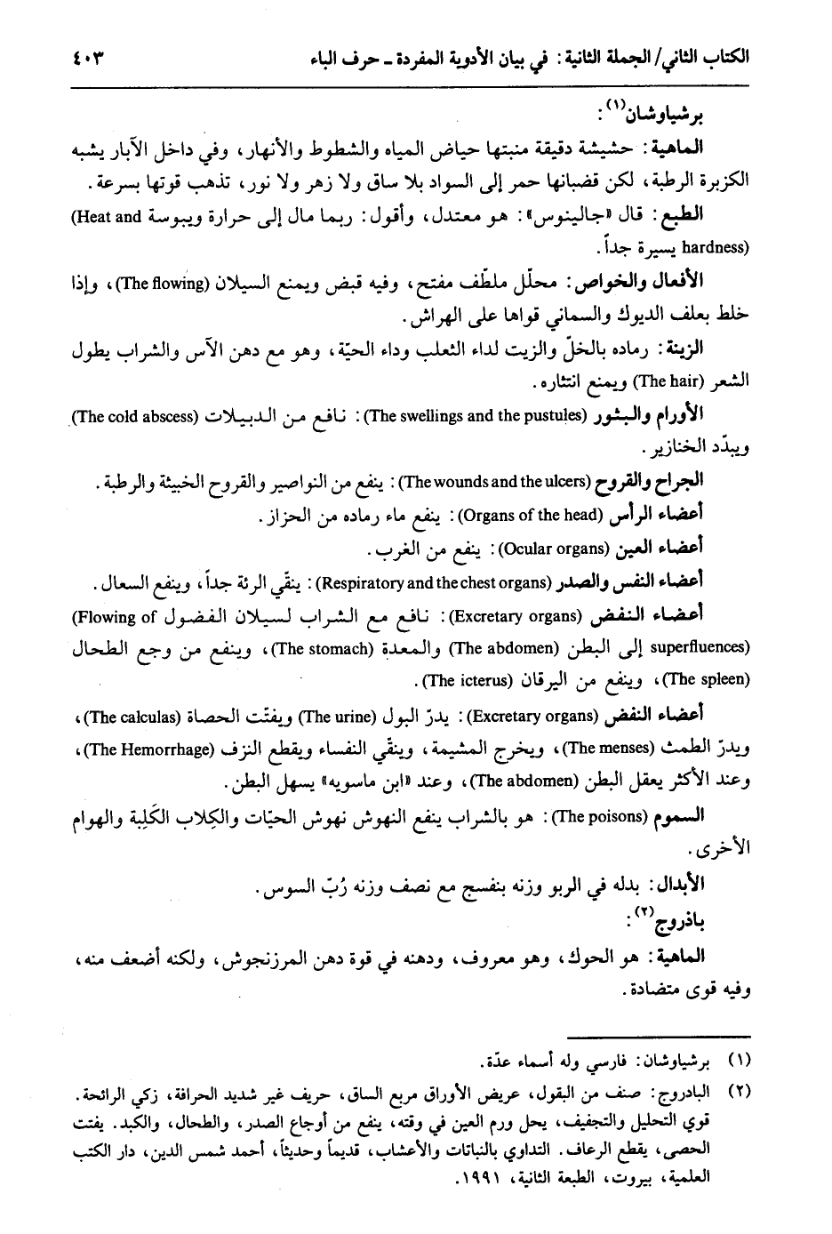 برشياوشان: الْمَاهِيّة: حشيشة دقيقة منبتها حِيَاض الْمِيَاه والشطوط والأنهار وَفِي دَاخل الْآبَار يشبه الكزبرة الرّطبَة لَكِن قضبانها حمر إِلَى السوَاد بِلَا سَاق وَلَا زهر وَلَا نور تذْهب قوتها بِسُرْعَة. الطَّبْع: قَالَ جالينوس: هُوَ معتدل وَأَقُول رُبمَا مَال إِلَى حرارة ويبوسة يسيرَة جدا. الْأَفْعَال والخواص: مُحَلل ملطّف مفتح وَفِيه قبض وَيمْنَع السيلان وَإِذا خلط بعلف الديوك والسماني قواها على الهواش. الزِّينَة: رماده بالخل وَالزَّيْت لداء الثَّعْلَب وداء الْحَيَّة وَهُوَ مَعَ دهن الآس وَالشرَاب يطول الشّعْر وَيمْنَع انتثاره. الأورام والبثور: نَافِع من الدبيلات ويبدد الْخَنَازِير. الْجراح والقروح: ينفع من النواصير والقروح الخبيثة والرطبة. أَعْضَاء الرَّأْس: ينفع مَاء رماده من الحزاز. أَعْضَاء الْعين: ينفع من الغرب. أَعْضَاء النَّفس والصدر: ينقي الرئة جدا وينفع السعال. أَعْضَاء النفض: نَافِع مَعَ الشَّرَاب لسيلان الفضول إِلَى الْبَطن والمعدة وينفع من وجع الطحال وينفع من اليرقان. أَعْضَاء النفض: يدرّ الْبَوْل ويفتّت الْحَصَاة ويدر الطمث وَيخرج المشيمة وينقي النُّفَسَاء وَيقطع النزف وَعند الْأَكْثَر يعقل الْبَطن وَعند ابْن ماسويه يسهل الْبَطن. السمُوم: هُوَ بِالشرابِ ينفع النهوش نهوش الْحَيَّات والكِلاب الكَلِبة والهوام الْأُخْرَى. باذروج: الْمَاهِيّة: هُوَ الحوك وَهُوَ مَعْرُوف ودهنه فِي قُوَّة دهن المرزنجوش وَلكنه أَضْعَف مِنْهُ وَفِيه قوى متضادة.
