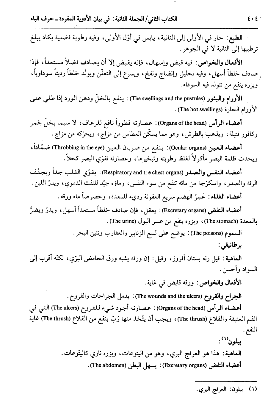الطَّبْع: حَار فِي الأولى إِلَى الثَّانِيَة يَابِس فِي أول الأولى وَفِيه رُطُوبَة فضلية يكَاد يبلغ ترطيبها إِلَى الثَّانِيَة لَا فِي الْجَوْهَر. الْأَفْعَال والخواص: فِيهِ قبض وإسهال فَإِنَّهُ يقبض إِلَّا أَن يُصَادف فضلا مستعداً فَإِذا صَادف خلطاً أسهل وَفِيه تَحْلِيل وإنضاج وَنفخ ويسرع إِلَى التعفن ويولد خلطاً رديئاً سوداوياً وبزره ينفع من تتولد فِيهِ السَّوْدَاء. الأورام والبثور: ينفع بالخل ودهن الْورْد إِذا طلي على الأورام الحارة. أعضلء الرَّأْس: عصارته قطوراً نَافِع للرعاف لَا سِيمَا بخل خمر وكافور فَتِيلَة وَيذْهب بالطرش وَهُوَ مِمَّا يسكن العطاس من مزاج ويحركه من مزاج. أَعْضَاء الْعين: ينفع من ضَرْبَان الْعين ضماداً وَيحدث ظلمَة الْبَصَر مَأْكُولا لغلظ رطوبته وتبخيرها وعصارته تقَوِّي الْبَصَر كحلاً. أَعْضَاء النَّفس والصدر: يُقَوي الْقلب جدا ويخفف الرئة والصدر واسكرجة من مَائه ينفع من أَعْضَاء الْغذَاء: عَسِرُ الهضم سريع العفونة رَدِيء للمعدة وخصوصاً مَاء ورقة. أَعْضَاء النفض: يعقل فَإِن صَادف خلطاً مستعداً أسهل ويدر ويضر بالمعدة وبزره ينفع من عسر البولد. السمُوم: يوضع على لسع الزنابير والعقارب وتنين الْبَحْر. برطانيقي: الْمَاهِيّة: قيل أَنه بُسْتَان أفروز وَقيل أَن ورقه يشبه ورق الحامض الْبري لكنه أقرب إِلَى السوَاد وَأحسن. الْأَفْعَال والخواص: ورقه قَابض فِي غَايَة. الْجرْح والقروح: يدمل الْجِرَاحَات والقروح. أَعْضَاء الرَّأْس: عصارته أَجود شَيْء للقروح الَّتِي فِي الْفَم العتيقة والقلاع وَيجب أَن يتَّخذ مِنْهَا رب ينفع من القلاع غَايَة النَّفْع. بيلون: الْمَاهِيّة: هَذَا هُوَ العرفج الْبري وَهُوَ من اليتوعات وبزره نَارِي كاليتوعات. أَعْضَاء النفض: يسهل الْبَطن.