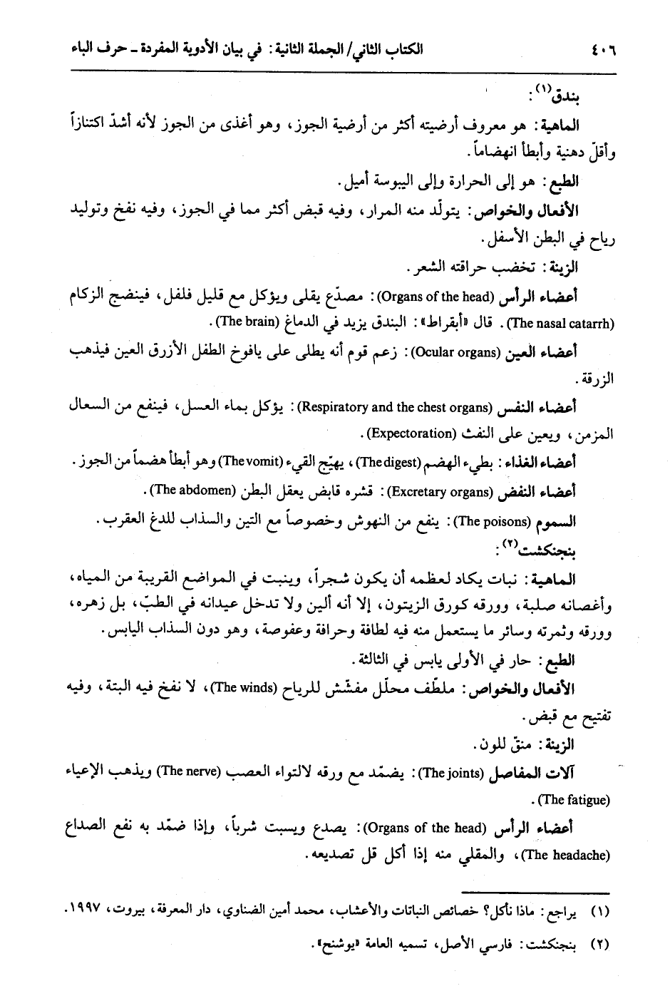 بندق: الْمَاهِيّة: هُوَ مَعْرُوف أرضيته أَكثر من أرضية الْجَوْز وَهُوَ أغذى من الْجَوْز لِأَنَّهُ أشدّ اكتنازاً وأقلة دهنية وَأَبْطَأ انهضاماً. الطَّبْع: هُوَ إِلَى الْحَرَارَة وَإِلَى اليبوسة أميل. الْأَفْعَال والخواص: يتوتد مِنْهُ المرار وَفِيه قبض أَكثر مِمَّا فِي الْجَوْز وَفِيه نفخ وتوليد ريَاح فِي الْبَطن الْأَسْفَل. الزِّينَة: تخضب حراقته الشّعْر. أَعْضَاء الرَّأْس: مصدع يقلى ويؤكل مَعَ قَلِيل فلفل فينضج الزُّكَام. قَالَ أبقراط: البندق يزِيد فِي الدِّمَاغ. أعضاه النَّفس: يُؤْكَل بِمَاء الْعَسَل فينفع من السعال المزمن ويعين على النفث. أعضاه الْغذَاء: بطيء الهضم يهيج الْقَيْء وَهُوَ أَبْطَأَ هضماً من الْجَوْز. أَعْضَاء النفض: قشره قَابض يعقل الْبَطن. السمُوم: ينفع من النهوش وخصوصاً مَعَ التِّين والسذاب للدغ الْعَقْرَب. بنجنكشت: الْمَاهِيّة: نَبَات يكَاد لعظمه أَن يكون شَجرا وينبت فِي الْمَوَاضِع الْقَرِيبَة من الْمِيَاه وأغصانه صلبة وورقه كورق الزَّيْتُون إِلَّا أَنه أَلين وَلَا تدخل عيدانه فِي الطبّ بل زهره وورقه وثمرته وَسَائِر مَا يسْتَعْمل مِنْهُ فِيهِ لطافة وحرافة وعفوصة وَهُوَ دون السذاب الْيَابِس. الطَّبْع: حَار فِي الأولى يَابِس فِي الثَّالِثَة. الْأَفْعَال والخواص: ملطف مُحَلل مفشش للرياح لَا نفخ فِيهِ الْبَتَّةَ وَفِيه تفتيح مَعَ قبض. الزِّينَة: منق للون. آلَات المفاصل: يضمّد مَعَ ورقه لإلتواء العصب وَيذْهب الاعياء. أَعْضَاء الرَّأْس: يصدع ويسبت شرباً وَإِذا ضمد بِهِ نفع الصداع والمقلي مِنْهُ إِذا أكل قل تصديعه.