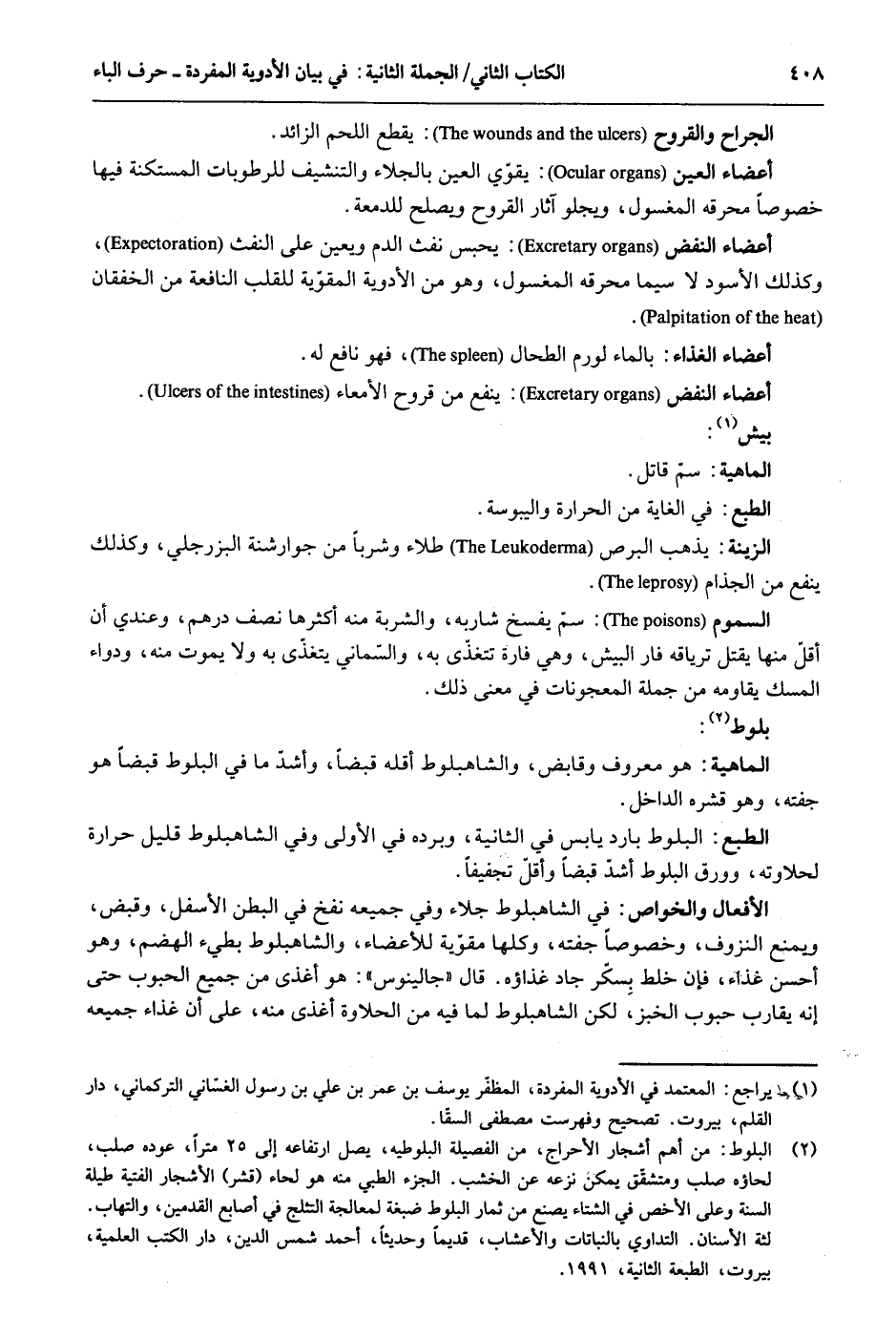 الْجراح والقروح: يقطع اللَّحْم الزَّائِد. أَعْضَاء الْعين: يُقَوي الْعين بالجلاء والتنشيف للرطوبات المستكنة فِيهَا خُصُوصا محرقه المغسول ويجلو آثَار القروح وَيصْلح للدمعة. أَعْضَاء النفض: يحبس نفث الدَّم ويعين على النفث وَكَذَلِكَ الْأسود لَا سِيمَا محرقه المغسول أَعْضَاء الْغذَاء: بِالْمَاءِ لورم الطحال فَهُوَ نَافِع لَهُ. أَعْضَاء النفض: ينفع من قُرُوح الأمعاء. بيش: الْمَاهِيّة: سم قَاتل. الطَّبْع: فِي الْغَايَة من الْحَرَارَة واليبوسة. الزينه: يذهب البرص طلاء وشرباً من جوارشنة البزرجلي وَكَذَلِكَ ينفع من الجذام. السمُوم: سمّ يفسح شَاربه والشربة مِنْهُ أَكْثَرهَا نصف دِرْهَم وَعِنْدِي أَن أقل مِنْهَا يقتل ترياقه فار البيش وَهِي فارة تتغذى بِهِ والسماني يتغذى بِهِ وَلَا يَمُوت مِنْهُ ودواء الْمسك يقاومه من جملَة المعجونات فِي معنى ذَلِك. بلوط: الْمَاهِيّة: هُوَ مَعْرُوف وقابض والشاهبلوط أَقَله قبضا وَأَشد مَا فِي البلوط قبضا هُوَ جفته وَهُوَ قشره الدَّاخِل. الطَّبْع: البلوط بَارِد يَابِس فِي الثَّانِيَة وبرده فِي الأولى وَفِي الشاهبلوط قَلِيل حرارة لحلاوته وورق البلوط أشدّ قبضا وَأَقل تجفيفاً. الْأَفْعَال والخواص: فِي الشاهبلوط جلاء وَفِي جَمِيعه نفخ فِي الْبَطن الْأَسْفَل وَقبض وَيمْنَع النزوف وخصوصاً جفته وَكلهَا منوية للأعضاء والشاهبلوط بطيء الهضم وَهُوَ أحسن غذَاء فَإِن خلط بِسكّر جاد غذاؤه. قَالَ جالينوس: هُوَ أغذى من جَمِيع الْحُبُوب حَتَّى إِنَّه يُقَارب حبوب الْخبز لَكِن الشاهبلوط لما فِيهِ من الْحَلَاوَة أغذى مِنْهُ على أَن غذَاء جَمِيعه