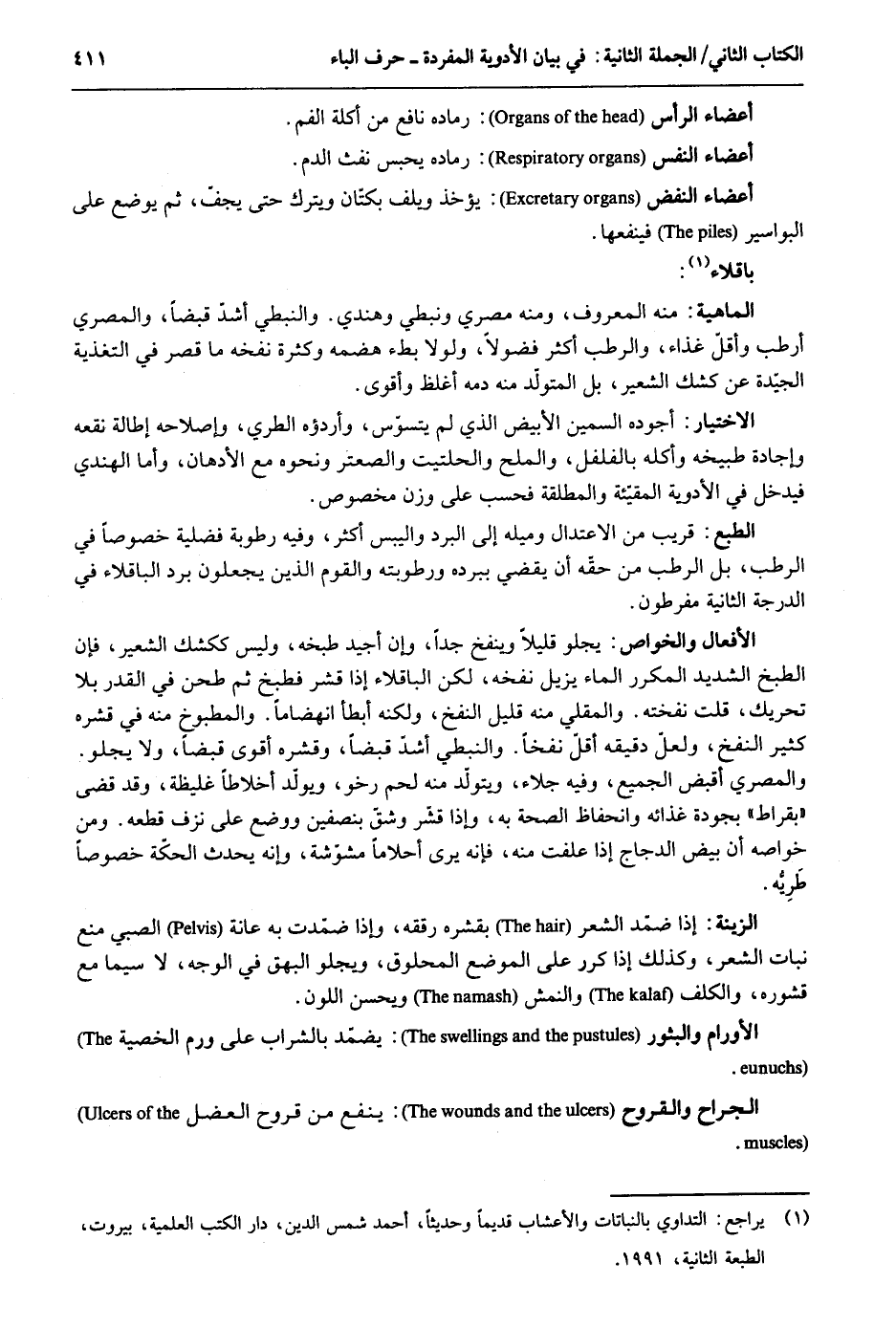 أَعْضَاء الرَّأْس: رماده نَافِع من أَكلَة الْفَم. أَعْضَاء النَّفس: رماده يحبس نفث الدَّم. أَعْضَاء النفض: يُؤْخَذ ويلف بكتان وَيتْرك حَتَّى يجِف ثمَّ يوضع على البواسير فينفعها. باقلاء: الْمَاهِيّة: مِنْهُ الْمَعْرُوف وَمِنْه مصري ونبطي وهندي. والنبطي أَشد قبضا والمصري أرطب وَأَقل غذَاء وَالرّطب أَكثر فضولاً وَلَوْلَا بطء هضمه وَكَثْرَة نفخه مَا قصر فِي التغذية الجيدة عَن الإختيار: أجوده السمين الْأَبْيَض الَّذِي لم يتسوس وأردؤه الطري وإصلاحه إطالة نقعه وإجادة طبيخه وَأكله بالفلفل وَالْملح والحلتيت والصعتر وَنَحْوه مَعَ الأدهان وَأما الْهِنْدِيّ فَيدْخل فِي الْأَدْوِيَة المقيئة والمطلقة فَحسب على وزن مَخْصُوص. الطَّبْع: قريب من الِاعْتِدَال وميله إِلَى الْبرد واليبس أَكثر وَفِيه رُطُوبَة فضلية خُصُوصا فِي الرطب بل الرطب من حَقه أَن يقْضِي بِبرْدِهِ ورطوبته وَالْقَوْم الَّذين يجْعَلُونَ برد الباقلا فِي الرجة الثَّانِيَة مفرطون. الْأَفْعَال والخواص: يجلو قَلِيلا وينفخ جدا وَإِن أجيد طبخه وَلَيْسَ ككشك الشّعير فَإِن الطَّبْخ الشَّديد المكرر المَاء يزِيل نفخه لَكِن الباقلاء إِذا قشر فطبخ ثمَّ طحن فِي الْقدر بِلَا تَحْرِيك قلت نفخته. والمقلي مِنْهُ قَلِيل النفخ وَلكنه أَبْطَأَ انهضاماً. والمطبوخ مِنْهُ فِي قشره كثير النفخ وَلَعَلَّ دقيقه أقل نقخاً. والنبطي أَشد قبضا وقشره أقوى قبضا وَلَا يجلو. والمصري أَقبض الْجَمِيع وَفِيه جلاء ويتولد مِنْهُ لحم رخو ويولد أخلاطاً غَلِيظَة وَقد قضى بقراط بجودة غذائه وانحفاظ الصِّحَّة بِهِ وَإِذا قشر وشق بنصفين وَوضع على نزف قطعه. وَمن خواصه أَن بيض الدَّجَاج إِذا علفت مِنْهُ فَإِنَّهُ يرى أحلاماً مشوّشة وَإنَّهُ يحدث الحكة خُصُوصا طَرِيه. الزِّينَة: إِذا ضمّد الشّعْر بقشره رققه وَإِذا ضمد بِهِ عانة الصَّبِي منع نَبَات الشّعْر وَكَذَلِكَ إِذا كرر على الْموضع المحلوق ويجلو البهق فِي الْوَجْه لَا سِيمَا مَعَ قشوره والكلف والنمش وَيحسن اللَّوْن. الأورام والبثور: يضمد بِالشرابِ على ورم الخصية. الْجراح والقروح: ينفع من قُرُوح العضل.