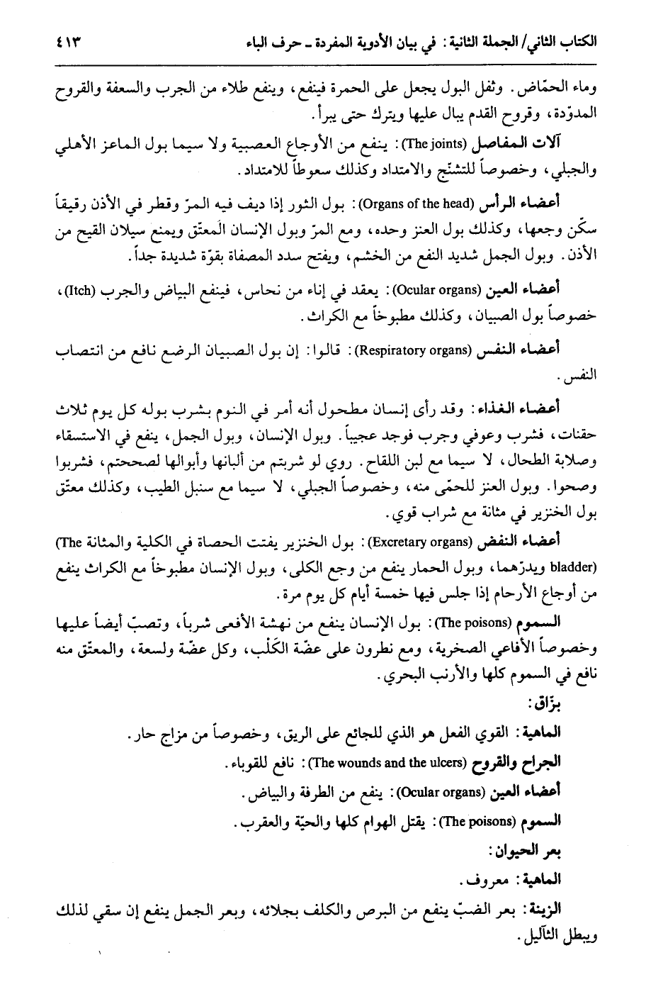 وَمَاء الحماض. ثفل الْبَوْل يَجْعَل على الْحمرَة فينفع وينفع طلاء من الجرب والسعفة والقروح المدوّدة وقروح الْقدَم يبال عَلَيْهَا وَيتْرك حَتَّى يبرأ. آلَات المفاصل: ينفع من الأوجاع العصبية وَلَا سِيمَا بَوْل الماعز الأهلى والجبلي وخصوصاً للتشنج والامتداد وَكَذَلِكَ سعوطاً للإمتداد. أَعْضَاء الرَّأْس: بَوْل الثور إِذا ديف فِيهِ المر وقطر فِي الْأذن رَقِيقا سكن وجعها وَكَذَلِكَ بَوْل العنز وَحده وَمَعَ المرّ وَبَوْل الْإِنْسَان المعتّق وَيمْنَع سيلان الْقَيْح من الْأذن. وَبَوْل الْجمل شَدِيد النَّفْع من الخشم وَيفتح سدد المصفاة بِقُوَّة شَدِيدَة جدا. أَعْضَاء الْعين: يعْقد فِي إِنَاء من نُحَاس فينفع الْبيَاض والجرب خُصُوصا بَوْل الصّبيان وَكَذَلِكَ مطبوخاً مَعَ الكراث. أَعْضَاء النَّفس: قَالُوا: إِن بَوْل الصّبيان الرضع نَافِع من انتصاب النَّفس. أَعْضَاء الْغذَاء: وَقد رأى إِنْسَان مطحول أَنه أَمر فِي النّوم بِشرب بَوْله كل يَوْم ثَلَاث حقّنات فَشرب وعوفي وجرب فَوجدَ عجيباً. وَبَوْل الْإِنْسَان وَبَوْل الْجمل ينفع فِي الاسْتِسْقَاء وصلابة الطحال لَا سِيمَا مَعَ لبن اللقَاح. رُوِيَ لَو شربتم من أَلْبَانهَا وأبوالد لصححتم فَشَرِبُوا وصحوا. وَبَوْل العنز للحمى مِنْهُ وخصّوصاً الْجبلي لَا سِيمَا مَعَ سنبل الطّيب وَكَذَلِكَ معتّق بَوْل الْخِنْزِير فِي مثانة مَعَ شراب قوي. أَعْضَاء النفض: بَوْل الْخِنْزِير يفتت الْحَصَاة فِي الْكُلية والمثانة ويدرهما وَبَوْل الْحمار ينفع من وجع الكلى وَبَوْل الْإِنْسَان مطبوخاً مَعَ الكراث ينفع من أوجاع الْأَرْحَام إِذا جلس فِيهَا خَمْسَة أَيَّام كل يَوْم مرّة. السمُوم: بَوْل الْإِنْسَان ينفع من نهشة الأفعى شرباً وتصدت أَيْضا عَلَيْهَا وخصوصاً الإفاعي الصخرية وَمَعَ نطرون على عضّة الكَلْب وكل عضة ولسعة وَالْمُعتق مِنْهُ نَافِع فِي السمُوم كلهَا والأرنب البحري. بزاق: الْمَاهِيّة: الْقوي الْفِعْل هُوَ الَّذِي للجائع على الرِّيق وخصوصاً من مزاج حَار. الْجراح والقروح: نَافِع للقوباء. أَعْضَاء الْعين: ينفع من الطرفة وَالْبَيَاض. السمُوم: يقل الْهَوَام كلهَا والحية وَالْعَقْرَب. بعر الْحَيَوَان: الزِّينَة: بعر الضَّب ينفع من البرص والكلف بجلائه وبعر الْجمل ينفع إِن سقِِي لذَلِك وَيبْطل الثآليل.