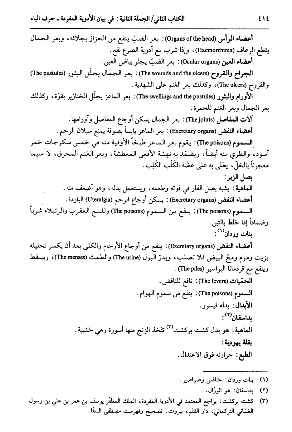 أَعْضَاء الرَّأْس: بعر الضَّب ينفع مَعَ الحزاز بجلائه وبعر الْجمال يقطع الرعاف وَإِذا شرب مَعَ أدوية الصرع نفع. أَعْضَاء الْعين: بعر الضبّ يجلو بَيَاض الْعين. الْجراح والقروح: بعر الْجمال يحلل البثور والقروح وَكَذَلِكَ بعر الْغنم على الشهدية. الأورام والبثور: بعر الماعز يحلّل الْخَنَازِير بِقُوَّة وَكَذَلِكَ بعر الْجمال وبعر الْغنم للحمرة. آلَات المفاصل: بعر الْجمال يسكن أوجاع المفاصل وأورامها. أَعْضَاء النفض: بعر الماعز يَابسا بصوفة يمْنَع سيلان الرَّحِم. السمُوم: يقوم بعر الماعز طبخاً الْأُوقِيَّة مِنْهُ فِي خمس سكرجات خمر أسود والطري مِنْهُ أَيْضا ويضمد بِهِ نهشة الأفعى المعطشة وبعر الْغنم المحرق لَا سِيمَا معجوناً بالخل يطلى بِهِ على عضة الكَلْب الكَلِب. بصل الزير: الْمَاهِيّة: يشبه بصل الفار فِي قوته وطعمه وَيسْتَعْمل بدله وَهُوَ أَضْعَف مِنْهُ. السمُوم: ينفع من السمُوم وللسع الْعَقْرَب والرتيلاء شرباً وضماداً إِذا خلط بِالتِّينِ. بَنَات وردان: أَعْضَاء النفض: ينفع من أوجاع الْأَرْحَام والكلى بعد أَن يكسر تَحْلِيله بِزَيْت وموم ومحّ الْبيض فَلَا تصلب ويدر الْبَوْل والطمث وَيسْقط وينفع مَعَ قردمانا البواسير. الحميات: نَافِع للنافض. السمُوم: ينفع من سموم الْهَوَام. الأبدال: بدله قيسور. بداسفان: الْمَاهِيّة: هُوَ بدل كشت بركشت تتَّخذ الزنج مِنْهَا أسورة وَهِي خشبية. بقلة يَهُودِيَّة: الطَّبْع: حرارته فَوق الِاعْتِدَال.