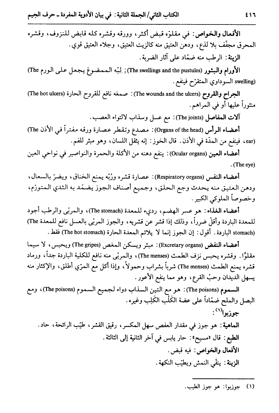 الْأَفْعَال والخواص: فِي مقلوّه قبض أَكثر وورقه وقشره كُله قَابض للنزوف وقشره المحرق مجفف بِلَا لذع ودهن الْعَتِيق مِنْهُ كالزيت الْعَتِيق وجلاء الْعَتِيق قوي. الزِّينَة: الرطب مِنْهُ ضمّاد على آثَار الضَّرْبَة. الأورام والبثور: لبه الممضوغ يَجْعَل على الورم السوداوي المتقرح فينفع. الْجراح والقروح: صمغه نَافِع للقروح الحارة منثوراً عَلَيْهَا أَو فِي المراهم. آلَات المفاصل: مَعَ عسل وسذاب لالتواء العصب. أَعْضَاء الرَّأْس: مصدع وتقطر عصارة ورقه مفتراً فِي الْأذن فينفع من الْمدَّة فِي الْأذن. قَالَت الخوز: أَنه يثقل اللِّسَان وَهُوَ مبثر للفم. أَعْضَاء الْعين: ينفع دهنه من الْأكلَة والحمرة والنواصير فِي نواحي الْعين. أَعْضَاء النَّفس: عصارة قشره وربه يمْنَع الخناق ويضر بالسعال ودهن الْعَتِيق مِنْهُ يحدث وجع أَعْضَاء الْغذَاء: هُوَ عسر الهضم رَدِيء للمعدة والمربى وَالرّطب أَجود للمعدة الْبَارِدَة وَأَقل ضَرَرا وَذَلِكَ إِذا قشر عَن قشريه والجوز المربى بالعسل نَافِع للمعدة الْبَارِدَة. أَقُول: إِن الْجَوْز إِنَّمَا لَا يلائم الْمعدة الحارة فَقَط. أَعْضَاء النفض: مبثر ويسكن المغص وَيحبس لَا سِيمَا مقلوا. وقشره يحبس نزف الطمث والمربى مِنْهُ نَافِع للكلية الْبَارِدَة جدا ورماد قشره يمْنَع الطمث شرباً بشراب وحمولاً وَإِذا أكل مَعَ المري أطلق والإكثار مِنْهُ يسهل الديدان وَحب القرع وَهُوَ مِمَّا ينفع الْأَعْوَر. السمُوم: هُوَ مَعَ التِّين السذاب دَوَاء لجَمِيع السمُوم وَمَعَ البصل وَالْملح ضماداً على عضة الْكَلْب الكَلِب وَغَيره. جوزبوا: الْمَاهِيّة: هُوَ جوز فِي مِقْدَار العفص سهل المكسر رَقِيق القشر طيب الرَّائِحَة حاد. الطَّبْع: قَالَ مسيح: حَار يَابِس فِي اً خر الثَّانِيَة إِلَى الثَّالِثَة. الْأَفْعَال والخواص: فِيهِ قبض. الزِّينَة: ينقّي النمش ويطيّب النكهة.