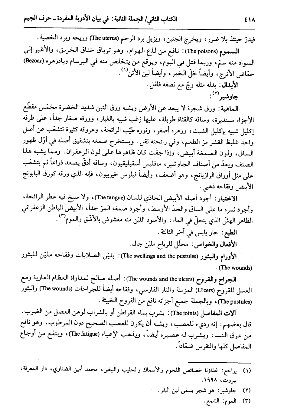 فيدر حِينَئِذٍ بِلَا ضَرَر وَيخرج الْجَنِين ويزيل برد الرَّحِم وريحه وَبرد الخصية. السمُوم: نَافِع من لذع الْهَوَام وَهُوَ ترياق خناق الخريق والأغبر إِلَى السوَاد مِنْهُ سم وَرُبمَا قتل فِي الْيَوْم ويوقع من يتَخَلَّص مِنْهُ فِي البرسام وبادزهره حماض الأترج وَأَيْضًا خل الْخمر وَأَيْضًا لبن الأبدال: بدله مثله وَج مَعَ نصفه فلفل. جاوشير: الْمَاهِيّة: ورق شَجَرَة لَا يبعد عَن الأَرْض وَيُشبه ورق التِّين شَدِيد الخضرة مخمس مقطع الْأَجْزَاء مستديرة وَسَاقه كالقثاة طَوِيلَة عَلَيْهَا زغب شَبيه بالغبار وورقه صغَار جدا على طرفه إكليل شَبيه بإكليل الشبث وزهره أصفر ونوره طيب الرَّائِحَة وعروقه كَثِيرَة تتشعب عَن أصل وَاحِد غليظ القشر مر الطّعْم وَفِي رَائِحَته ثفل. ويستخرج صمغه بتشقيق أَصله فِي أول ظُهُور السَّاق ولون الصمغة أَبيض وَإِذا جَفتْ كَانَ ظَاهرهَا على لون الزَّعْفَرَان. وَمِمَّا يشبه هَذَا الصِّنْف ويعد من أَصْنَاف الجاوشير مافليس استقيليقيون وَسَاقه أدق يصعد ذِرَاعا ثمَّ يتشعب على مثل أوراق الرازيانج وَهُوَ أَضْعَف وَأَيْضًا فيلوس خيربيون فَإِنَّهُ الَّذِي ورقه كورق البابونج الْأَبْيَض وفقاحه ذهبي. الِاخْتِيَار: أَجود أَصله الْأَبْيَض الحاذي للسان وَلَا سبخ فِيهِ عطر الرَّائِحَة وأجود ثمره مَا على السَّاق وَالْحَد الْأَوْسَط وأجود صمغه المرّ جدا الْأَبْيَض الْبَاطِن الزَّعْفَرَانِي الظَّاهِر الهش الَّذِي ينحلّ فِي المَاء وَالْأسود اللين مِنْهُ مغشوش بالأشّق والموم. الطَّبْع: حَار يَابِس فِي آخر الثَّالِثَة. الأورام والبثور: يلين الصلابات وفقاحه ملين للبثور. الْجراح والقروح: أَصله صَالح لمداواة الْعِظَام الْعَارِية وَمَعَ الْعَسَل للقروح المرمنة وَالنَّار الْفَارِسِي وفقاحه أَيْضا للجراحات والبثور وَبِالْجُمْلَةِ جَمِيع أَجْزَائِهِ نَافِع من القروح الخبيثة. آلَات المفاصل: يشرب بِمَاء القراطن أَو بِالشرابِ لوهن العضل من الضَّرْب. قَالَ بَعضهم: إِنَّه رَدِيء للعصب وَيُشبه أَن يكون للعصب الصَّحِيح دون المرطوب وَهُوَ نَافِع من عرق النسا وَيشْرب لَهُ عصيره أَيْضا وَيذْهب الإعياء وينفع من أوجاع المفاصل كلهَا والنقرس ضماداً.