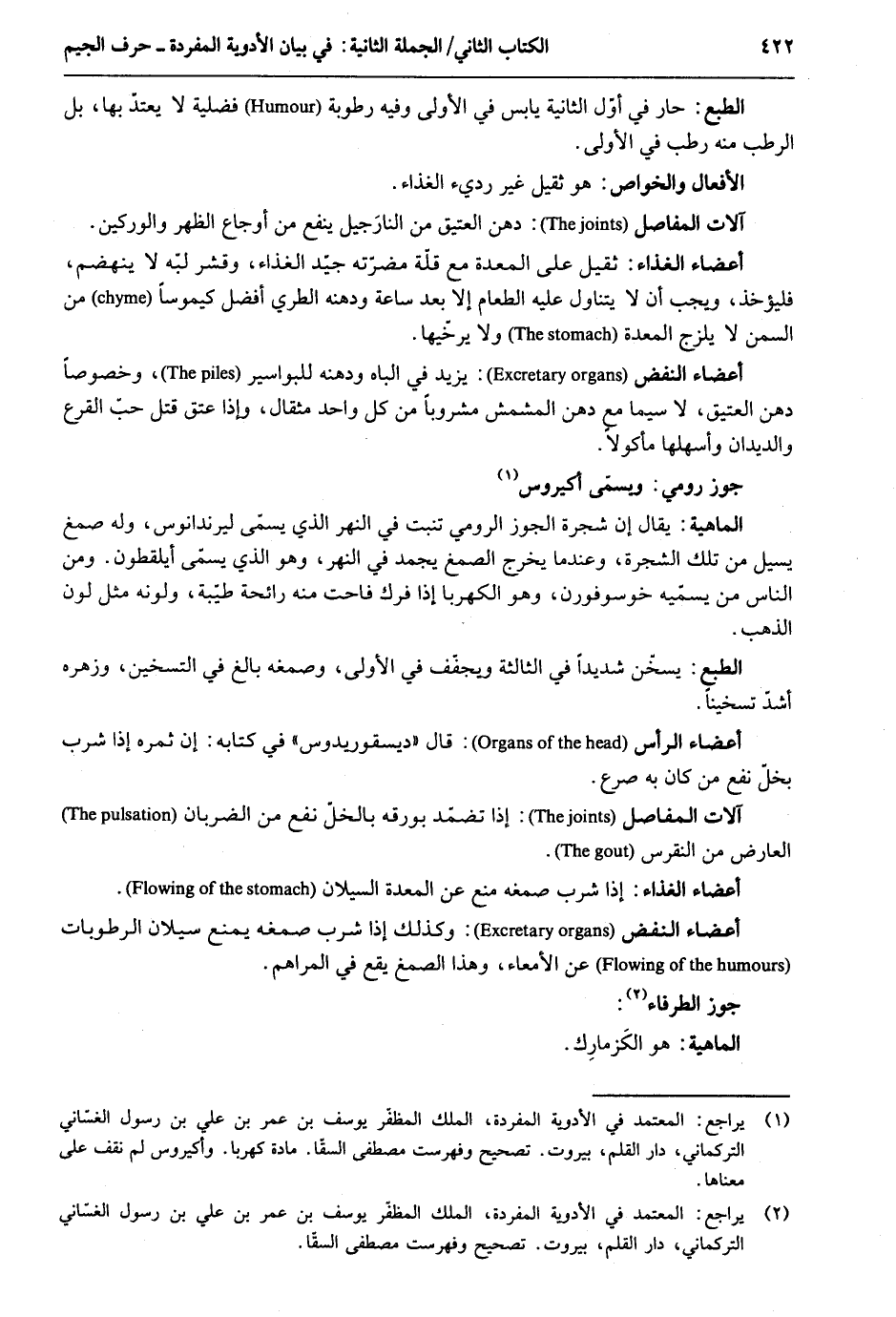 الطَّبْع: حَار فِي أول الثَّانِيَة يَابِس فِي الأولى وَفِيه رُطُوبَة فضلية لَا يعتدّ بهَا بل الرطب مِنْهُ رطب فِي الأولى. الْأَفْعَال والخواص: هُوَ ثقيل غير رَدِيء الْغذَاء. آلَات المفاصل: دهن الْعَتِيق من النارَجيل ينفع من أوجاع الظّهْر والوركين. أَعْضَاء الْغذَاء: ثقيل على الْمعدة مَعَ قلّة مضرّته جيد الْغذَاء وقشر لبه لَا ينهضم فليؤخذ وَيجب أَن لَا يتَنَاوَل عَلَيْهِ الطَّعَام إِلَّا بعد سَاعَة ودهنه الطري أفضل كيموساً من السّمن لَا يلزج الْمعدة وَلَا يرخيها. أَعْضَاء النفض: يزِيد فِي الباه ودهنه للبواسير وخصوصاً دهن الْعَتِيق لَا سِيمَا مَعَ دهن جوز رومي: وَيُسمى أكيروس الْمَاهِيّة: يُقَال أَن شَجَرَة الْجَوْز الرُّومِي تنْبت فِي النَّهر الَّذِي يُسمى ليرندانوس وَله صمغ يسيل من تِلْكَ الشَّجَرَة وعندما يخرج الصمغ يجمد فِي النَّهر وَهُوَ الَّذِي يُسمى أيلقطون. وَمن النَّاس من يسْقِيه خوسوفورن وَهُوَ الكهربا إِذا فرك فاحت مِنْهُ رَائِحَة طيبَة ولونه مثل لون الذَّهَب. الطَّبْع: يسخّن شَدِيدا فِي الثَّالِثَة ويجفف فِي الأولى وصمغه بَالغ فِي التسخين وزهره أشدّ تسخيناً. أَعْضَاء الرَّأْس: قَالَ ديسقوريدوس فِي كِتَابه: إِن ثمره إِذا شرب بخل نفع من كَانَ بِهِ صرع. آلَات المفاصل: إِذا تضمد بورقه بالخل نفع من الضربان الْعَارِض من النقرس. أَعْضَاء الْغذَاء: إِذا شرب صمغه منع عَن الْمعدة السيلان. أَعْضَاء النفض: وَكَذَلِكَ إِذا شرب صمغه يمْنَع سيلان الرطوبات عَن الأمعاء وَهَذَا الصمغ يَقع فِي المراهم. جوز الطرفاء: الْمَاهِيّة: هُوَ الكَزمازِك.