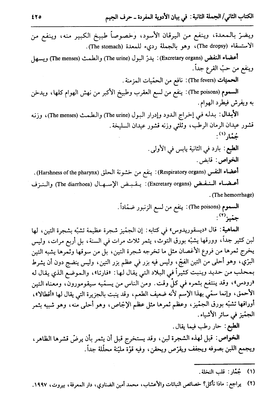 ويضر بالمعدة وينفع من اليرقان الْأسود وخصوصاً طبيخ الْكَبِير مِنْهُ وينفع من الأستسقاء وَهُوَ بِالْجُمْلَةِ رَدِيء. للمعدة. أَعْضَاء النفض: يدر الْبَوْل والطمث ويسهل وينفع من حب القرع جدا. الحميات: نَافِع من الحميات المزمنة. السمُوم: ينفع من لسع الْعَقْرَب وطبيخ الْأَكْبَر من نهش الْهَوَام كلهَا ويدخن بِهِ ويفرش فيطرد الْهَوَام. الأبدال: بدله فِي إِخْرَاج الدُّود وإدرار الْبَوْل والطمث وَزنه قشور عيدَان الرُّمَّان الرطب وثلثي وَزنه قثور عيدَان السليخة. جمار: الطَّبْع: بَارِد فِي الئانية يَابِس فِي الأولى. الْخَواص: قَابض. أَعْضَاء النَّفس: ينفع من خشونة الْحلق. أَعْضَاء النفض: يقبض الإسهال والنزف. السمُوم: ينفع من لسع الزنبور ضماداً. جميز: الْمَاهِيّة: قَالَ ديسقوريدوس فِي كِتَابه: إِن الجميز شَجَرَة عَظِيمَة تشبه بشجرة التِّين لَهَا لبن كثير جدا وورقها يشبه بورق التوث يُثمر ثَلَاث مَرَّات فِي السّنة بل أَربع مَرَّات وَلَيْسَ يخرج ثَمَرهَا من فروع الأغصان مثل مَا تخرجه شَجَرَة التِّين بل من سوقها وَثَمَرهَا يشبه التِّين الْبري وَهُوَ أحلى من التِّين الْفَج وَلَيْسَ فِيهِ بزر فِي عظم بزر التِّين وَلَيْسَ ينضج دون أَن يشرط بمحلب من حَدِيد وينبت كثيرا فِي الْبِلَاد الَّتِي يُقَال لَهَا ة فارتا والموضع الَّذِي يُقَال لَهُ رودس وَقد ينْتَفع بثمره فِي كل وَقت. وَمن النَّاس من يسمّيه سيقومورون وَمَعْنَاهُ التِّين الأحمق وَإِنَّمَا سمي بِهَذَا الإسم لِأَنَّهُ ضَعِيف الطّعْم وَقد ينْبت بالجزيرة الَّتِي يُقَال لَهَا أقطالا أوراقها تشبه بورق الجميز وَعظم ثَمَرهَا مثل عظم الأجّاص وَهُوَ أحلى مِنْهُ وَهُوَ شَبيه بثمر الجميز فِي سَائِر الْأَشْيَاء. الطَّبْع: حَار رطب فِيمَا يُقَال. الْخَواص: قيل لهَذِهِ الشَّجَرَة لبن وَقد يسْتَخْرج قبل أَن يُثمر بِأَن يرض قشرها الظَّاهِر وَيجمع اللَّبن بصوفه ويجفف ويقرص ويحقن وَفِيه قوّة ملينة محللة جدا.