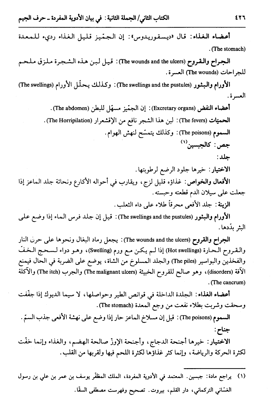 أَعْضَاء الْغذَاء: قَالَ ديسقوريدوس: إِن الجمّيز قطيل الْغذَاء رَدِيء للمعدة. الْجراح والقروح: قيل لبن هَذِه الشَّجَرَة ملزقة ملحمة للجراحات الْعسرَة. الأورام والبثور: وَكَذَلِكَ يحلل الأورام الْعسرَة. أَعْضَاء النفض: إِن الجميزمسهّل للبطن. الحميّات: لبن هَذَا الشّجر نَافِع من الإقشعرار. السمُوم: وَكَذَلِكَ يتمسح لنهش الْهَوَام. جص: كالجبسين. جلد. الِاخْتِيَار: خَيرهَا جُلُود الرضع لرطوبتها. الْأَفْعَال والخواص: غذاؤه قَلِيل لزج وَيُقَارب فِي أَحْوَاله الأكارع ونحاتة جلد الماعز إِذا جعلت على سيلان الدَّم قطعته وحبسته. الزِّينَة: جلد الأفعى محرقاً طلاء على داِء الثَّعْلَب. الأورام والبثور: قيل إِن جلد فرس المَاء إِذا وضع على البثر بددها. الْجراح والقروح: يَجْعَل رماد البغال وَنَحْوهَا على حرق النَّار والقروح الحارة إِذا لم يكن مَعَ ورم وَهُوَ دَوَاء لسحج الْخُف والفخذين والبواسير وَالْجَلد المسلوخ من الشَّاة يوضع على الضَّرْبَة فِي الْحَال فَيمْنَع الآفة وَهُوَ صَالح للقروح الخبيثة والجرب والآكلة. أَعْضَاء الْغذَاء: الْجلْدَة الدَّاخِلَة فِي قوانص الطير وحواصلها لَا سِيمَا الديوك إِذا جقفت وسحقت وشربت بطلاء نَفَعت من وجع الْمعدة. السمُوم: قيل إِن مسلاخ الماعز حَار إِذا وضع على نهشة الأفعى جذب السمّ. جنَاح. الِاخْتِيَار: خَيرهَا أَجْنِحَة الدَّجَاج وَأَجْنِحَة الأوز صَالِحَة الهضم والغذاء وَإِنَّمَا خفت لِكَثْرَة الْحَرَكَة والرياضة وَإِمَّا كثر غذاؤها لِكَثْرَة اللَّحْم فِيهَا ولقربها من الْقلب.