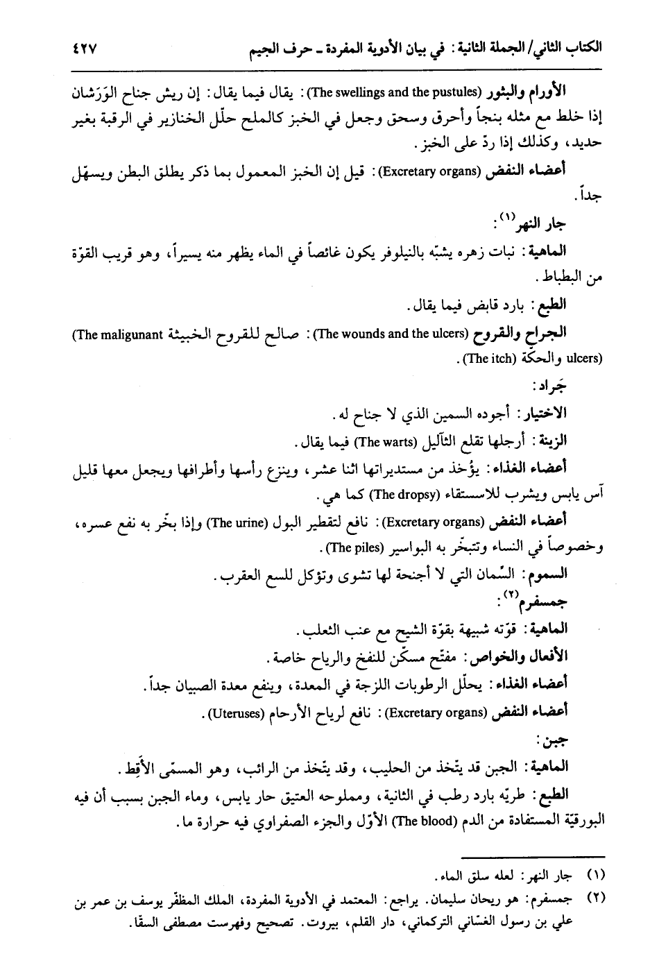 الأورام والبثور: يُقَال فِيمَا يُقَال: إِن ريش جنَاح الوَرَشان إِذا خلط مَعَ مثله بنجاً وأحرق أَعْضَاء النفض: قيل إِن الْخبز الْمَعْمُول بِمَا ذكر يُطلق الْبَطن ويسهل جدا. جَار النَّهر: الْمَاهِيّة: نَبَات زهره يشبه بالنيلوفر يكون غائصاً فِي المَاء يظْهر مِنْهُ يَسِيرا وَهُوَ قريب الْقُوَّة من البطباط. الطَّبْع: بَارِد قَابض فِيمَا يُقَال. الْجراح والقروح: صَالح للقروح الخبيثة والحكّة. جَراد. الِاخْتِيَار: أجوده السمين الَّذِي لَا جنَاح لَهُ. الزِّينَة: أرجلها تقلع الثآليل فِيمَا يُقَال. أَعْضَاء الْغذَاء: يؤُخذ من مستديراتها اثْنَا عشر وَينْزع رَأسهَا وأطرافها وَيجْعَل مَعهَا قَلِيل آس يَابِس وَيشْرب للاسستقاء كَمَا هِيَ. أَعْضَاء النفض: نَافِع لتقطير الْبَوْل وَإِذا بخّر بِهِ نفع عسره وخصوصاً فِي النِّسَاء وتتبخر بِهِ البواسير. السمُوم: السمان الَّتِي لَا أَجْنِحَة لَهَا تشوى وتؤكل للسع الْعَقْرَب. الْمَاهِيّة: قوّته شَبيهَة بقوّة الشيح مَعَ عِنَب الثَّعْلَب. الْأَفْعَال والخِواص: مفتح مسكن للنفخ والرياح خَاصَّة. أَعْضَاء الْغذَاء: يحلل الرطوبات اللزجة فِي الْمعدة وينفع معدة الصّبيان جدا. أَعْضَاء النفض: نَافِع لرياح الْأَرْحَام. جبن: الْمَاهِيّة: الْجُبْن قد يتّخذ من الحليب وَقد يتّخذ من الرائب وَهُوَ الْمُسَمّى الا قِط. الطَّبْع: طريه بَارِد رطب فِي الثَّانِيَة ومملوحه الْعَتِيق حَار يأبس وَمَاء الْجُبْن بِسَبَب أَن فِيهِ البورقية المستفادة من الدَّم الأوّل والجزء الصفراوي فِيهِ حرارة.