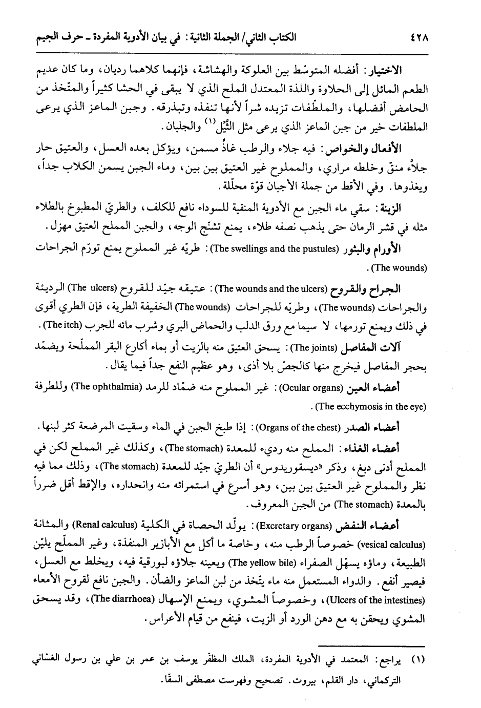 الِاخْتِيَار: أفضله المتوسّط بَين العلوكة والهشاشة فَإِنَّهُمَا كلاعما رديان وَمَا كَانَ عديم الطّعْم المائل إِلَى الْحَلَاوَة واللذة المعتدل الْملح الَّذِي لَا يبْقى فِي الحشا كثيرا والمتّخذ من الحامض أفضلهَا والملطّفات تزيده شرا لِأَنَّهَا تنفذه وتبذرقه. وَجبن الماعز الَّذِي يرْعَى الملطفات خير من جبن الماعز الَّذِي يرْعَى مثل الثيل والجلبان. الْأَفْعَال والخواص: فِيهِ جلاء وَالرّطب غاذ مسمن ويؤكل بعده الْعَسَل والعتيق حَار جلاء منق وخلطه مراري والمملوح الْغَيْر الْعَتِيق بَين بَين وَمَاء الْجُبْن يسمن الْكلاب جدا ويغذوها. وَفِي الزِّينَة: سقِِي مَاء الْجُبْن مَعَ الْأَدْوِيَة المنقية للسوداء نَافِع للكلف والطري الْمَطْبُوخ بالطلاء مثله فِي قشر الرُّمَّان حَتَّى يذهب نصفه طلاء يمْنَع تشنج الْوَجْه والجبن المملح الْعَتِيق مهزل. الأورام والبثور: طريه الْغَيْر المملوح يمْنَع تورم الْجِرَاحَات. الْجراح والقروح: عتيقه جيد للقروح الرَّديئَة والجراحات وطريه للجراحات الْخَفِيفَة الطرية فَإِن الطري أقوى فِي ذَلِك وَيمْنَع تورمها لَا سِيمَا مَعَ ورق الدلب والحماض الْبري وَشرب مَائه للجرب. آلَات المفاصل: يسحق الْعَتِيق مِنْهُ بالزيت أَو بِمَاء أكارع الْبَقر المملحة ويضمد بِحجر المفاصل فَيخرج مِنْهَا كالجص بِلَا أَذَى وَهُوَ عَظِيم النَّفْع جدا فِيمَا يُقَال. أَعْضَاء الْعين: غير الدملوح مِنْهُ ضماد للرمد وللطرفة. أَعْضَاء الصَّدْر: إِذا طبخ الْجُبْن فِي المَاء وسقيت الْمُرضعَة أَكثر لَبنهَا. أَعْضَاء الْغذَاء المملح مِنْهُ رَدِيء للمعدة وَكَذَلِكَ غير المملح لَكِن فِي المملح أدنى دبغ وَذكر ديسقوريدوس أَن الطريّ جيد للمعدة وَذَلِكَ مِمَّا فِيهِ نظر والمملوح غير الْعَتِيق بَين بَين وَهُوَ أسْرع فِي استمرائه مِنْهُ وانحداره والإقط أقل ضَرَرا بالمعدة من الْجُبْن الْمَعْرُوف. أَعْضَاء النفض: يُولد الْحَصَاة فِي الْكُلية والمثانة خُصُوصا الرطب مِنْهُ وخاصة مَا أكل مَعَ الأبازير المنفذة وَغير المملح يلين الطبيعة وماؤه يسهّل الصَّفْرَاء ويعينه جلاؤه لبورقية فِيهِ ويخلط مَعَ الْعَسَل فَيصير أَنْفَع. والدواء الْمُسْتَعْمل مِنْهُ مَاء يتّخذ من لبن الماعز والضان. والجبن نَافِع لقروح الأمعاء وخصوصاً المشوي وَيمْنَع الإسهال وَقد يسحق المشوي ويحقن بِهِ مَعَ دهن الْورْد أَو الزَّيْت فينفع من قيام الأعراس.