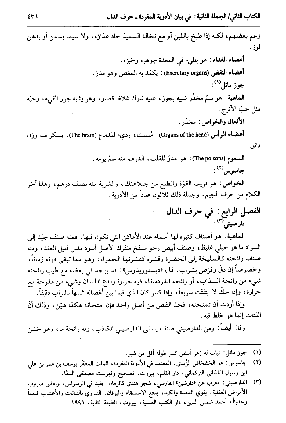 زعم بَعضهم لكنه إِذا طبخ بِاللَّبنِ أَو مَعَ نخالة السميذ جاد غذاؤه وَلَا سِيمَا بِسمن أَو بدهن لوز. أَعْضَاء الْغذَاء: هُوَ بطيء فِي الْمعدة جوهوه وخبزه. أَعْضَاء النفض: يكمد بِهِ المغص وَهُوَ مدر. جوز مائل: الْمَاهِيّة: هُوَ سم مخدر شَبيه بجوز عَلَيْهِ شوك غِلَاظ قصار وَهُوَ يشبه جوز الْقَيْء وحبّه مثل حب الأترج. الْأَفْعَال والخواص: مخدر. أَعْضَاء الرَّأْس: مُسبت رَدِيء للدماغ يسكر مِنْهُ وزن دانق. السمُوم: هُوَ عَدو للقلب المرهم مِنْهُ سمُ يَوْمه. جاسوس: الْخَواص: هُوَ قريب الْقُوَّة والطبع من جبلاهنك والشربة مِنْهُ نصف دِرْهَم وَهَذَا آخر الْكَلَام من حرف الْجِيم وَجُمْلَة ذَلِك ثَلَاثُونَ عددا من الْأَدْوِيَة. حرف الدَّال دارصيني: الْمَاهِيّة: هُوَ أَصْنَاف كَثِيرَة لَهَا أَسمَاء عِنْد الْأَمَاكِن الَّتِي تكون فِيهَا فَمِنْهُ صنف جيد إِلَى السوَاد مَا هُوَ جبلي غليظ وصنف أَبيض رخو منتفخ منفرك الأَصْل أسود ملس قَلِيل العقد وَمِنْه صنف رَائِحَته كالسليخة إِلَى الخضرة وقشره كقشرتها الْحَمْرَاء وَهُوَ مِمَّا تبقى قوته زَمَانا وخصوصاً إِن دق وقرص بشراب. قَالَ ديسقوريدوس: قد يُوجد فِي بعضه مَعَ طيب رَائِحَته شَيْء من رَائِحَة السذاب أَو رَائِحَة القردمانا فِيهِ حرارة ولذع اللِّسَان وَشَيْء من ملوحة مَعَ حرارة وَإِذا حك لَا يتفتت سَرِيعا وَإِذا كسر كَانَ الَّذِي فِيمَا بَين أغصانه شَبِيها بِالتُّرَابِ دَقِيقًا. وَإِذا أردْت أَن تمتحنه فَخذ الفص من أصل وَاحِد فَإِن امتحانه هَكَذَا هَين وَذَلِكَ أَن الفتات إِنَّمَا هُوَ خلط فِيهِ. وَقَالَ أَيْضا: وَمن الدَّار صيني صنف يُسمى الدَّار صيني الْكَاذِب وَله رَائِحَة مَا وَهُوَ خشن