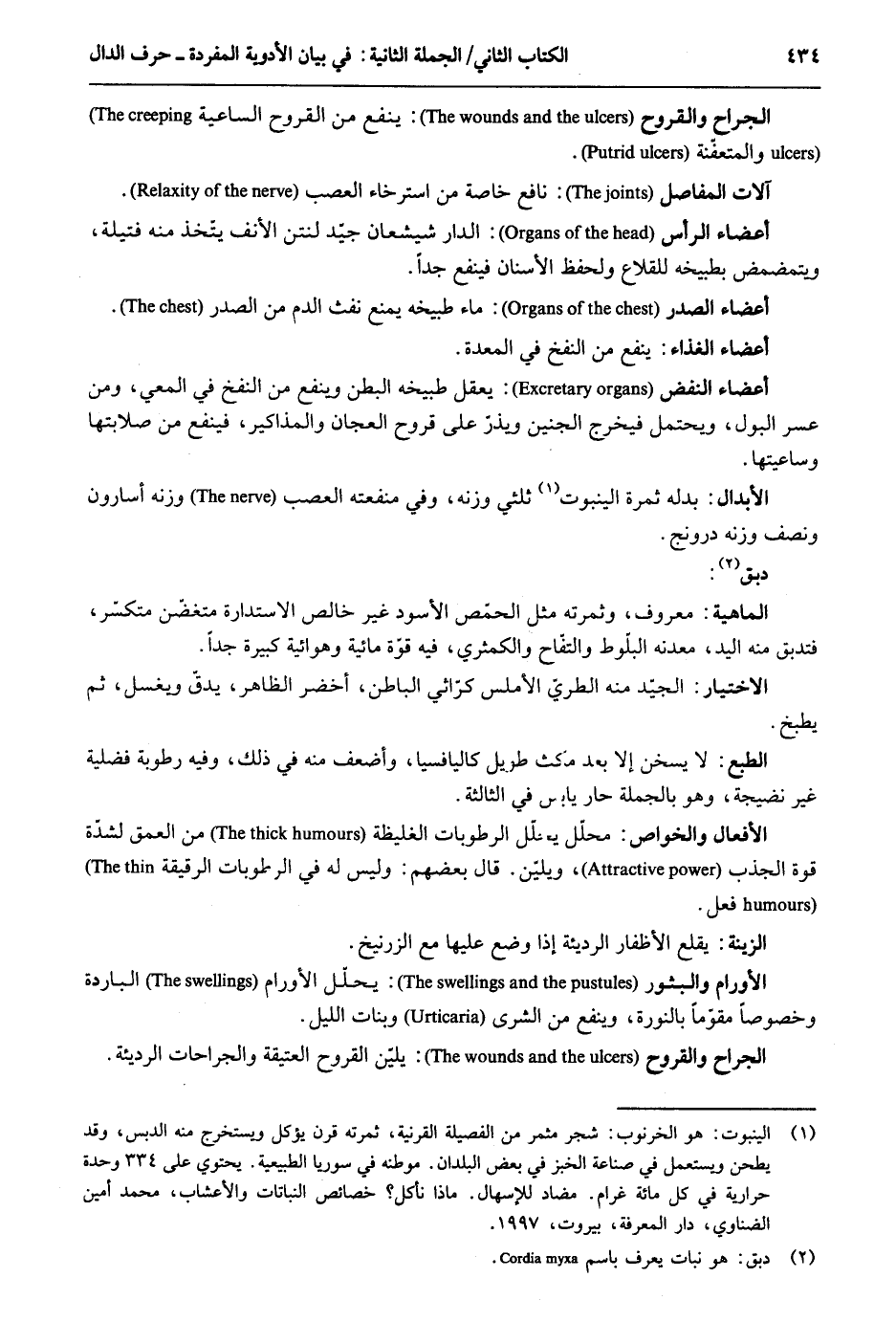 الْجراح والقروح: ينفع من القروح الساعية والمتعقنة. آلَات المفاصل: نَافِع خَاصَّة من استرخاء العصب. أَعْضَاء الرَّأْس: الدَّار شيشعان جيد لنتن الْأنف يتَّخذ مِنْهُ فَتِيلَة ويتمضمض بطبيخه للقلاع ولحفظ الْأَسْنَان فينفع جدا. أعضاءالصدر: مَاء طبيخه يمْنَع نفث الدَّم من الصَّدْر. أَعْضَاء الْغذَاء: ينفع من النفخ فِي الْمعدة. أَعْضَاء النفض: يعقل طبيخه الْبَطن وينفع من النفخ فِي المعي وَمن عسر الْبَوْل وَيحْتَمل فَيخرج الْجَنِين ويذر على قُرُوح العجان والمذاكير فينفع من صلابتها وساعيتها. الأبدال: بدله ثَمَرَة الينبوث ثُلثي وَزنه وَفِي منفعَته العصب وَزنه أسارون وَنصف وَزنه درونج. الْمَاهِيّة: مَعْرُوف وثمرته مثل الحمص الْأسود غير خَالص الاستدارة متغضّن متكسر فتدبق مِنْهُ الْيَد معدنه البلوط والتفّاح والكمثري فِيهِ قوّة مائية وهوائية كَبِيرَة جدا. الِاخْتِيَار: الْجيد مِنْهُ الطري الأملس كراثي الْبَاطِن أَخْضَر الظَّاهِر يدق وَيغسل ثمَّ يطْبخ. الطَّبْع: لَا يسخن إِلَّا بعد مكث طَوِيل كاليافسيا وأضعف مِنْهُ فِي ذَلِك وَفِيه رُطُوبَة فضلية غير نضيجة وَهُوَ بِالْجُمْلَةِ حَار يَابِس فِي الثَّالِثَة. الْأَفْعَال والخواص: مُحَلل يحلل الرطوبات الغليظة من العمق لشدَّة قُوَّة الجذب ويليّن. قَالَ بَعضهم: وَلَيْسَ لَهُ فِي الرطوبات الرقيقة فعل. الزِّينَة: يقْلع الْأَظْفَار الرَّديئَة إِذا وضع عَلَيْهَا مَعَ الزرنيخ. الأورام والبثور: يحلّل الأورام الْبَارِدَة وخصوصاً مقوّماً بالنورة وينفع من الشرى وَبَنَات اللَّيْل الْجراح والقروح: يليّن القروح العتيقة والجراحات الرَّديئَة.