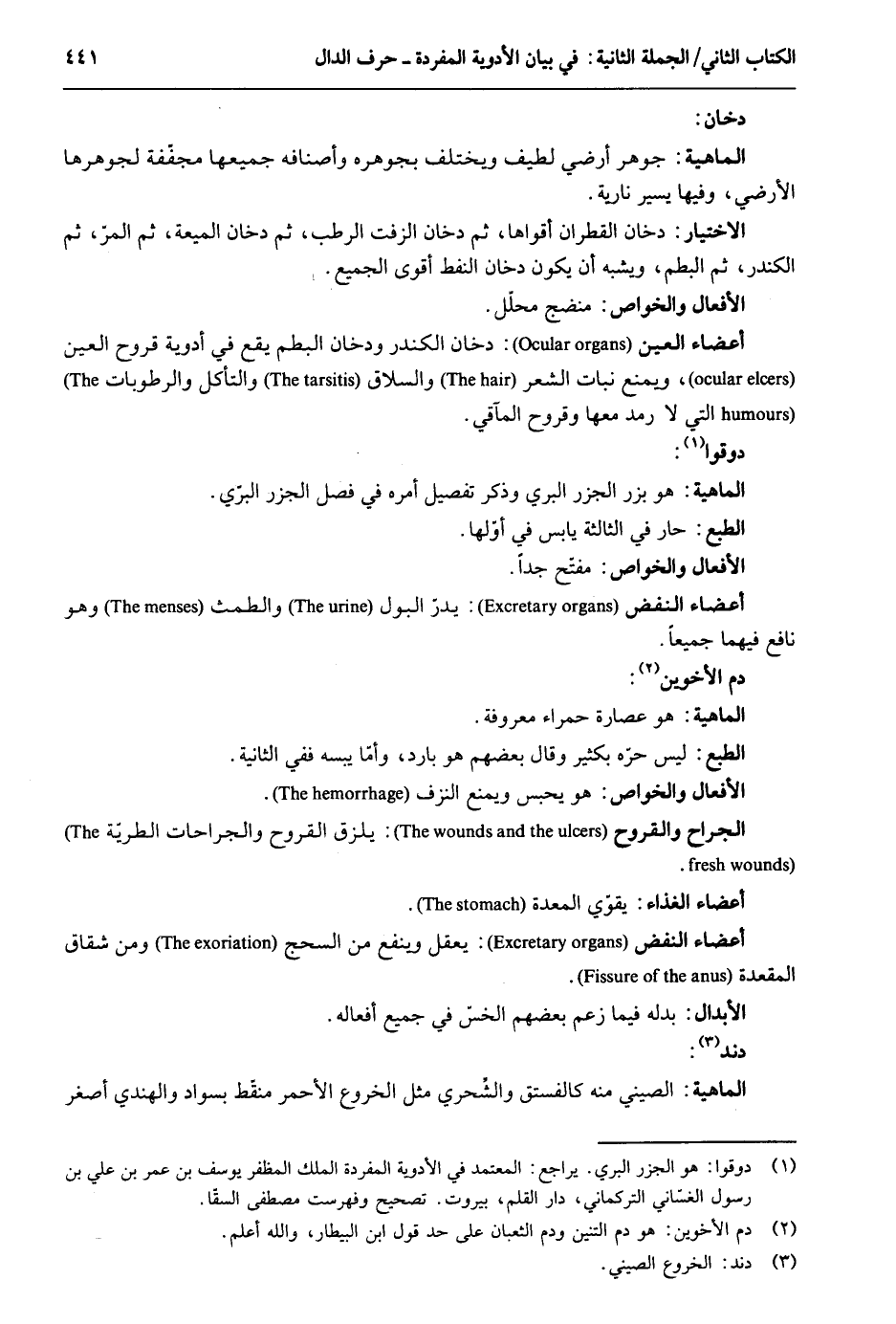دُخان: الْمَاهِيّة: جوهو أرضي لطيف وَيخْتَلف بجوهوه وأصنافه جَمِيعهَا مجففة لجوهرها الأرضي وفيهَا يسير نارية. الِاخْتِيَار: دُخان القطران أقواها ثمَّ دُخان الزفت الرطب ثمَّ دُخان الميعة ثمَّ المر ثمَّ الكندر ثمَّ البطم وَيُشبه أَن يكون دُخان النفط أقوى الْجَمِيع. الْأَفْعَال والخواص: منضج مُحَلل. أَعْضَاء الْعين: دُخان الكندر ودخان البطم يَقع فِي أدوية قُرُوح الْعين وَيمْنَع نَبَات الشّعْر والسلاق والتأكل والرطوبات الَّتِي لَا رمد مَعهَا وقروح المآقي. دوقوا: الطَّبْع: حَار فِي الثَّالِثَة يَابِس فِي أَولهَا. الْأَفْعَال والخواص: مفتح جدا. أَعْضَاء النفض: يدر الْبَوْل والطمث وَهُوَ نَافِع فيهمَا جَمِيعًا. دم الآخوين: الْمَاهِيّة: هُوَ عصارة حَمْرَاء مَعْرُوفَة. الطَّبْع: لَيْسَ حرّه بِكَثِير وَقَالَ بَعضهم هُوَ بَارِد وَأما يبسه فَفِي الثَّانِيَة. الْأَفْعَال والخواص: هُوَ يحبس وَيمْنَع النزف. الْجراح والقروح: يلزق القروح والجراحات الطرية. أَعْضَاء الْغذَاء: يُقَوي الْمعدة. أَعْضَاء النفض: يعقل وينفع من السحج وَمن شقَاق المقعدة. الأبدال: بدله فِيمَا زعم بَعضهم الخس فِي جَمِيع أَفعاله. دند: الْمَاهِيّة: الصيني مِنْهُ كالفستق والشّحري مثل الخروع الْأَحْمَر منقط بسواد والهندي أَصْغَر