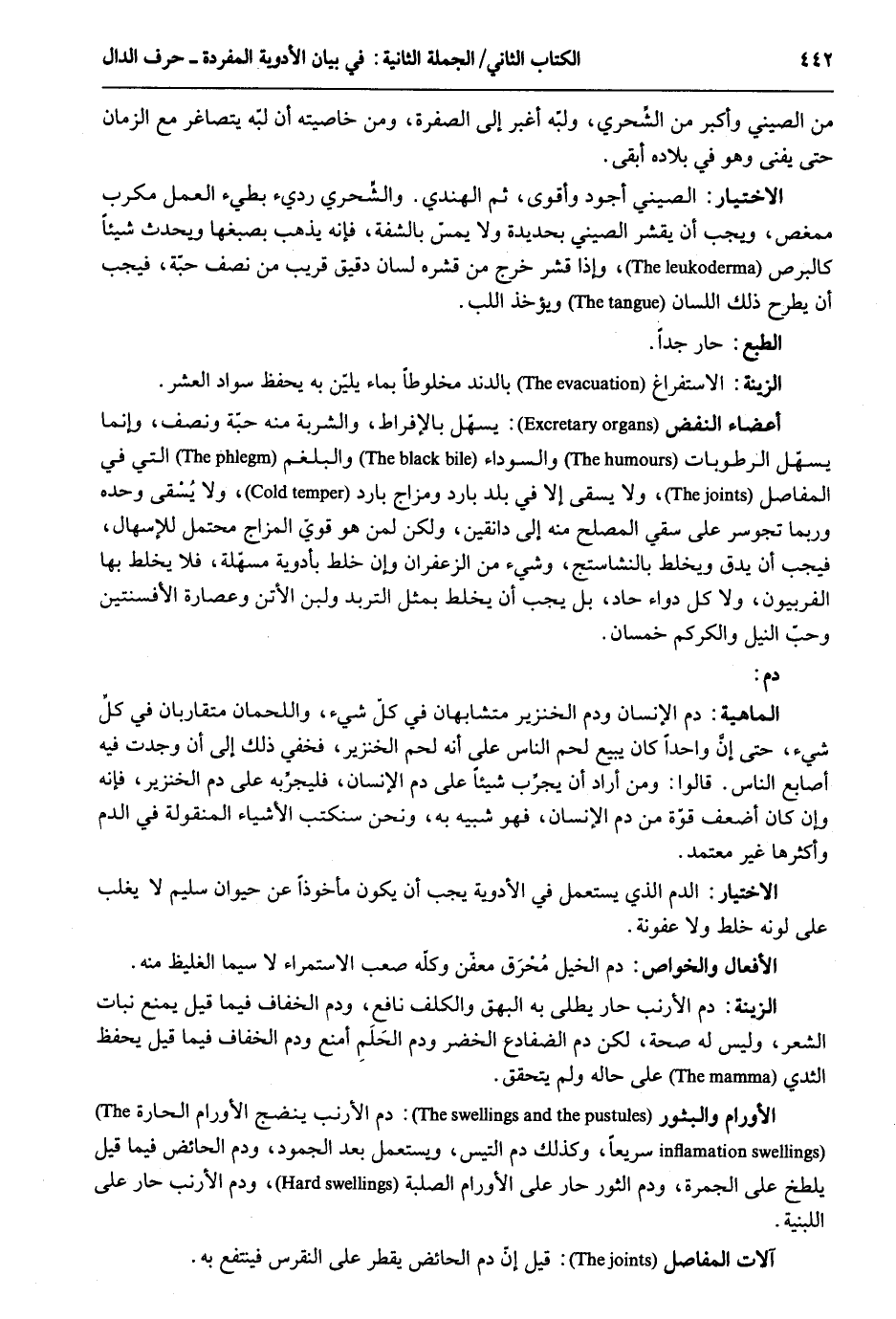 من الصيني وأكبر من الشحري ولبه أغبر إِلَى الصُّفْرَة وَمن خاصيته أَن لبه يتصاغر مَعَ الزَّمَان حَتَّى الِاخْتِيَار: الصيني أَجود وَأقوى ثمَّ الْهِنْدِيّ. والشحري رَدِيء بطيء الْعَمَل مكرب ممغص وَيجب أَن يقشر الصيني بحديدة وَلَا يمسّ بالشفة فَإِنَّهُ يذهب بصبغها وَيحدث شَيْئا كالبرص وَإِذا قشر خرج من قشره لِسَان دَقِيق قريب من نصف حَبَّة فَيجب أَن يطْرَح ذَلِك اللِّسَان وَيُؤْخَذ اللب. الطَّبْع: حَار جدا. الزِّينَة: الاستفراغ بالدند مخلوطاً بِمَاء يلين بِهِ يحفظ سَواد الْعشْر. أَعْضَاء النفض: يسهّل بالإفراط والشربة مِنْهُ حَبَّة وَنصف وَإِنَّمَا يسهل الرطوبات السَّوْدَاء والبلغم الَّتِي فِي المفاصل وَلَا يُسمى إِلَّا فِي بلد بَارِد ومزاج بَارِد وَلَا يسقى وَحده وَرُبمَا تجوسر على سقِِي المصلح مِنْهُ إِلَى دانقين وَلَكِن لمن هُوَ قوي المزاج مُحْتَمل الإسهال فَيجب أَن يدق ويخلط بالنشاستج وَشَيْء من الزَّعْفَرَان وَإِن خلط بأدويهْ مسهلة فَلَا يخلط بهَا الفربيون وَلَا كل دَوَاء حاد بل يجب أَن يخلط بِمثل التربد وَلبن الأتن وعصارة الأفسنتين وَحب النّيل والكركم خمسان. دم: الْمَاهِيّة: دم الْإِنْسَان وَدم الْخِنْزِير متشابهان فِي كل شَيْء واللحمان متقاربان فِي كل شَيْء حَتَّى إنَ وَاحِدًا كَانَ يَبِيع لحم النَّاس على أَنه لحم الْخِنْزِير فخفي ذَلِك إِلَى أَن وجدت فِيهِ أَصَابِع النَّاس. قَالُوا: وَمن أَرَادَ أَن يجرب شَيْئا على دم الْإِنْسَان فليجربه على الْخِنْزِير فَإِنَّهُ وَإِن كَانَ أَضْعَف قُوَّة من دم الْإِنْسَان فَهُوَ شَبيه بِهِ وَنحن سنكتب الْأَشْيَاء المنقولة فِي الدَّم وأكثرها غير مُعْتَمد. الِاخْتِيَار: الدَّم الَّذِي يسْتَعْمل فِي الْأَدْوِيَة يجب أَن يكون مأخوذاً عَن حَيَوَان سليم لَا يغلب على لَونه خلط وَلَا عفونة. الْأَفْعَال والخواص: دم الْخَيل مُحْرَق معفن وَكله صَعب الإستمراء لَا سِيمَا الغليظ مِنْهُ. الزِّينَة: دم الأرنب حَار يطلى بِهِ البهق والكلف نَافِع وَدم الْخفاف فِيمَا قيل يمْنَع نَبَات الشّعْر وَلَيْسَ لَهُ صِحَة لَكِن دم الضفاح الْخضر وَدم الحلَمِ أمنع وَدم الْخفاف فِيمَا قيل يحفظ الثدي على حَاله وَلم يتَحَقَّق. الأورام والبثور: دم الأرنب ينضج الأورام الحارة سَرِيعا وَكَذَلِكَ دم التيس وَيسْتَعْمل بعد الجمود وَدم الْحَائِض فِيمَا قيل يلطخ على الْجَمْرَة وَدم الثور حَار على الأورام الصلبة وَدم الأرنب حاراً على اللبنية. آلَات المفاصل: قيل أنّ دم الْحَائِض يقطر على النقرس فينتفع بِهِ.