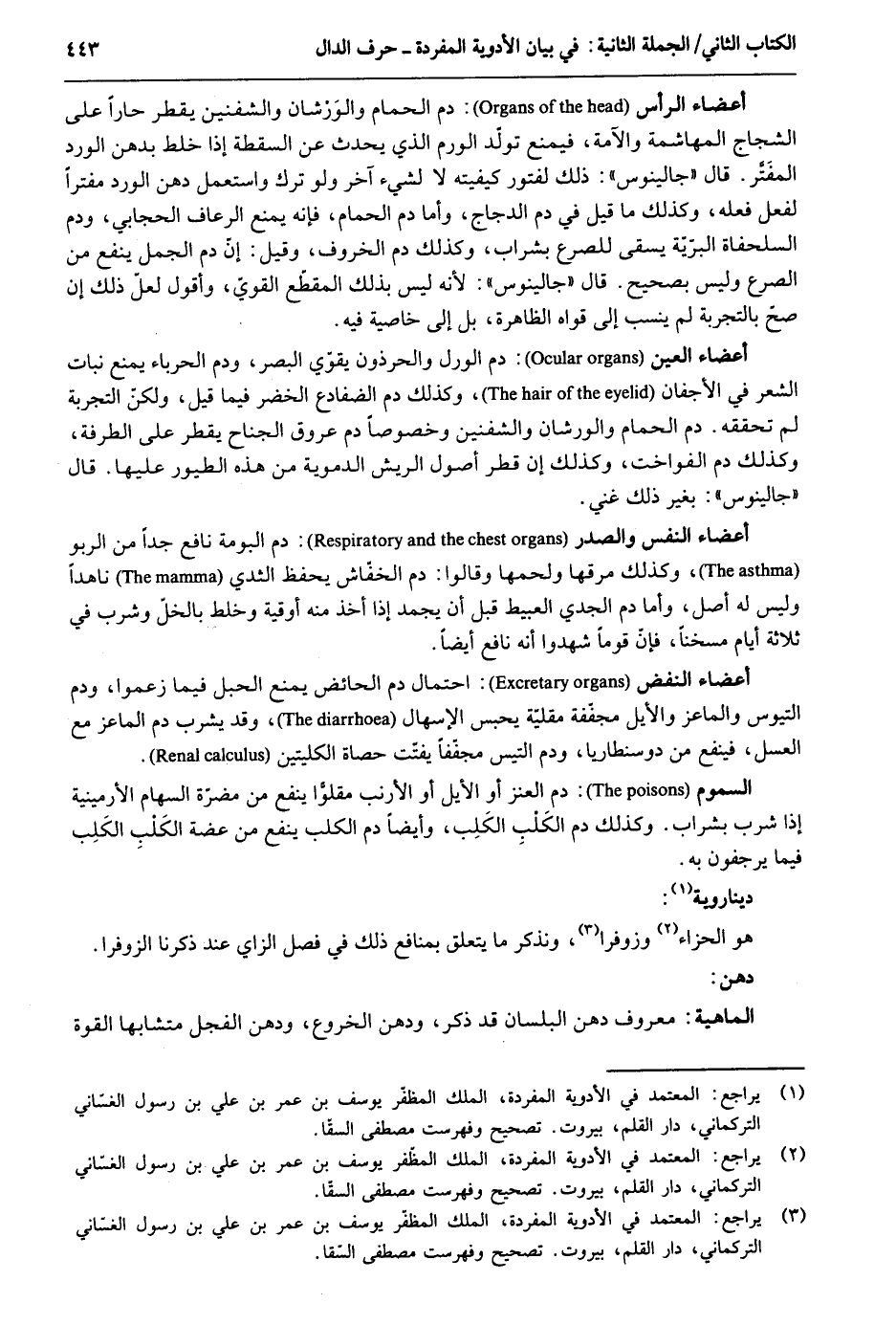 أَعْضَاء الرَّأْس: دم الْحمام والوَرْشان والشفنين يقطر حاراً على الشجاج المهاشمة والآمة فَيمْنَع تولد الورم الَّذِي يحدث عَن السقطة إِذا خلط بدهن الْورْد المفتئر. قَالَ جالينوس: ذَلِك لفتور كيفيته لَا لشَيْء آخر وَلَو ترك وَاسْتعْمل دهن الْورْد مفتراً لفعل فعله وَكَذَلِكَ مَا قيل فِي دم الدَّجَاج وَأما دم الْحمام فَإِنَّهُ يمْنَع الرعاف الحجابي وَدم السلحفاة الْبَريَّة يسقى للصرع بشراب وَكَذَلِكَ دم الخروف وَقيل: إِن دم الْجمل ينفع من الصرع وَلَيْسَ بِصَحِيح. قَالَ جالينوس: لِأَنَّهُ لَيْسَ بذلك المقطع القويّ وَأَقُول لَعَلَّ ذَلِك إِن صحّ بالتجربة لم ينْسب إِلَى قواه الظَّاهِرَة بل إِلَى خاصية فِيهِ. أَعْضَاء الْعين: دم الورل والحرذون يُقَوي الْبَصَر وَدم الحرباء يمْنَع نَبَات الشّعْر فِي الأجفان وَكَذَلِكَ دم الضفادع الْخضر فِيمَا قيل وَلَكِن التجربة لم تحَققه. دم الْحمام والورشان والشفنين وخصوصاً دم عروق الْجنَاح يقطر على الطرفة وَكَذَلِكَ دم الفواخت وَكَذَلِكَ إِن قطر أصُول الريش الدموية من هَذِه الطُّيُور عَلَيْهَا قَالَ جالينوس: بِغَيْر ذَلِك غنى. أَعْضَاء النَّفس والصدر: دم البومة نَافِع جدا من الربو وَكَذَلِكَ مرقها ودمها وَقَالُوا: دم الخقاش يحفظ الثدي ناهداً وَلَيْسَ لَهُ أصل وَأما دم الجدي العبيط قبل أَن يجمد إِذا أَخذ مِنْهُ أُوقِيَّة وخلط بالخل وَشرب فِي ثَلَاثَة أَيَّام مسخناً فَإِن قوما شهدُوا أَنه نَافِع أَيْضا. أَعْضَاء النفض: احْتِمَال دم الْحَائِض يمْنَع الْحَبل فِيمَا زَعَمُوا وَدم التيوس والماعز والأيل مجففة مقلتة يحبس الإسهال وَقد يشرب دم الماعز مَعَ الْعَسَل فينفع من دوسنطاريا وَدم التيس مجففاً يفتّت حَصَاة الكليتين. السمُوم: دم العنز أَو الأيل أَو الأرنب مقلوا ينفع من مضرَّة السِّهَام الأرمينية إِذا شرب بشراب. وَكَذَلِكَ دم الكَلْبِ الكَلِب وَأَيْضًا دم الْكَلْب ينفع من عضة الكَلْبِ الكَلِب فِيمَا يرجفون بِهِ. ديناروية: هُوَ الحزاء وزوفرا وَنَذْكُر مَا يتَعَلَّق بمنافع ذَلِك فِي فصل الزَّاي عِنْد ذكرنَا الزوفرا. دهن: الْمَاهِيّة: مَعْرُوف دهن البلسان قد ذكر ودهن الخروع ودهن الفجل متشابها الْقُوَّة