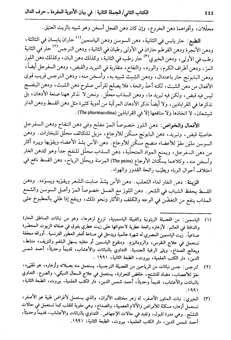 محللان وأقواهما دهن الخروع وَإِن كَانَ دهن الفجل أسخن وَهُوَ شَبيه بالزيت الْعَتِيق. الطَّبْع: حَار يَابِس فِي الثَّانِيَة دهن السوسن ودهن الياسمين حاران يابسان فِي الثَّالِثَة ودهن الأنجرة ودهن القرطم حاران فِي الأولى رطبان فِي الثَّانِيَة ودهن النرجس حَار فِي الثَّانِيَة رطب فِي الأولى ودهن الخيري حَار رطب فِي الثَّانِيَة وَكَذَلِكَ دهن البان وَكَذَلِكَ دهن اللوز المر ودهن أَطْرَاف الْكَرم والورد والتفاح مُتَقَارِبَة فِي التبريد وَالْقَبْض ودهن السفرجل أَيْضا ودهن البابونج حَار باعتدال ودهن الشِبث شَبيه بِهِ وأسخن مِنْهُ ودهن النرجس قريب القوى الْأَفْعَال من دهن الشبث لكنه أحدَ رَائِحَة فَلَا يصلح للرأس صلوح دهن الشبث ودهن البنفسج لَيْسَ فِيهِ قبض وَلَكِن فِيهِ تبريد مَا ودهن السذاب مُحَلل. وَنحن لَا نذْكر هَهُنَا صَنْعَة الأدهان بل نذكرها فِي القراباذين وَلَا أَيْضا نذْكر الأدهان المركبة من أدوية كَثِيرَة مثل دهن الْقسْط ودهن الدَّار شيشعان لَا اتخاذها وَلَا مَنَافِعهَا إِلَّا فِي القراباذين. الْأَفْعَال والخوص: دهن اللوز خصوصأ المر مفتح وَفِي دهن التفاح ودهن السفرجل خاصية قبض وتبريد دهن البابونج مسكن للأوجاع مزيل للتكاثف مُحَلل للبخارات. ودهن السوسن ملين مقوّ للأعضاء منضج مسكن للأوجاع دهن الآس يشد الْأَعْضَاء ويقويها ويبرد أَكثر من دهن السفرجل وَيمْنَع الْموَاد المتحلبة دهن السذاب مُحَلل للنفخ جدا وَهُوَ كدهن الْغَار وأسخن مِنْهُ وَكِلَاهُمَا يسكنان الأوجاع المزمنة ويحلل الرِّيَاح دهن الْقسْط نَافِع فِي اخْتِلَاف أَحْوَال الوباء ويطيب رَائِحَة الْقُدُور والهواء. الزِّينَة: دهن الْغَار لداء الثَّعْلَب. دهن الآس يشد منابت الشّعْر ويقويه ويسوده. ودهن الْقسْط يحفظ الشَّبَاب فِي الشّعْر دهن اللوز مَعَ الْعَسَل خُصُوصا المر وأصل السوسن والشمع الْمُذَاب ينفع من التغضن فِي الْوَجْه والكلف والْآثَار وَنَحْو ذَلِك وينفع إِذا طلي بالمطبوخ على