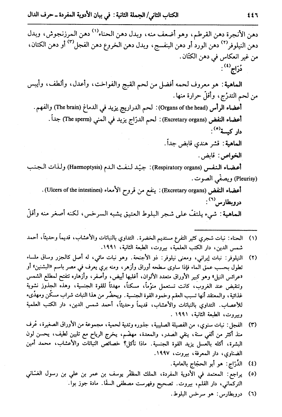 دهن الأنجرة ودهن القرطم يطلقان. ودهن الْورْد قد يُطلق إِذا وجد مَادَّة تحْتَاج إِلَى إزلاق وَقد يحبس الإسهال المراري. ودهن الخروع يسهل وَيخرج حبّ القرع دهن اللوز جيد لأوجاع الكلى وَحصر الْبَوْل والحصاة ولأوجاع المثانة وَالرحم واختناق الرَّحِم. ودهن السوسن يسهل الْولادَة ويسكن أوجاع الرَّحِم شرباً واحتقاناً وَفِي جَمِيع ذَلِك. دهن الحلبة نَافِع أَيْضا ولصلابة الرَّحِم ودبيلاته وعسر الْولادَة. ودهن الخروع ينفع من أورام المقعدة وانضمام الرَّحِم وانقلابه. الحميات: دهن البابونج فِي الحميات المتطاولة خير من دهن الْورْد ودهن الشبث جيد للنافض. الأبدال: دهن البلسان بدله مر سيال أَو وَزنه دهن الدادي مَعَ نصف وَزنه دهن النارجيل وَربع وَزنه زيتاً عتيقاً وَبدل دهن الْغَار اِلزفت الرطب وَبدل دهن السوسن دهن الْغَار وَبدل دهن الأنجرة دهن القرطم وَهُوَ أَضْعَف مِنْهُ وَبدل دهن الْحِنَّاء دهن المرزنجوش وَبدل دهن النيلوفر دهن الْورْد أَو دهن البنفسج وَبدل دهن الخروع دهن الفجل أَو دهن الْكَتَّان من غير انعكاس فِي دهن الْكَتَّان. دُراج: الْمَاهِيّة: هُوَ مَعْرُوف لَحْمه أفضل من دم القبج. والفواخت وَأَعْدل وألطف وأيبس من لحم أَعْضَاء الرَّأْس: لحم الدراريج يزِيد فِي الدِّمَاغ والفهم. أَعْضَاء النفض: لحم الدراج يزِيد فِي الْمَنِيّ جدا. دَار كيسة: الْمَاهِيّة: قشر هندي قَابض جدا. الْخَواص: قا بض. أَعْضَاء النَّفس: جيد لنفث الدَّم ولذات الْجنب ويصفّي الصَّوْت. أَعْضَاء النفض: ينفع من قُرُوح الأمعاء. در وبطارس: الْمَاهِيّة: شَيْء يلتف على شجر البلوط الْعَتِيق يشبه السرخس لكنه أَصْغَر مِنْهُ وَأَقل