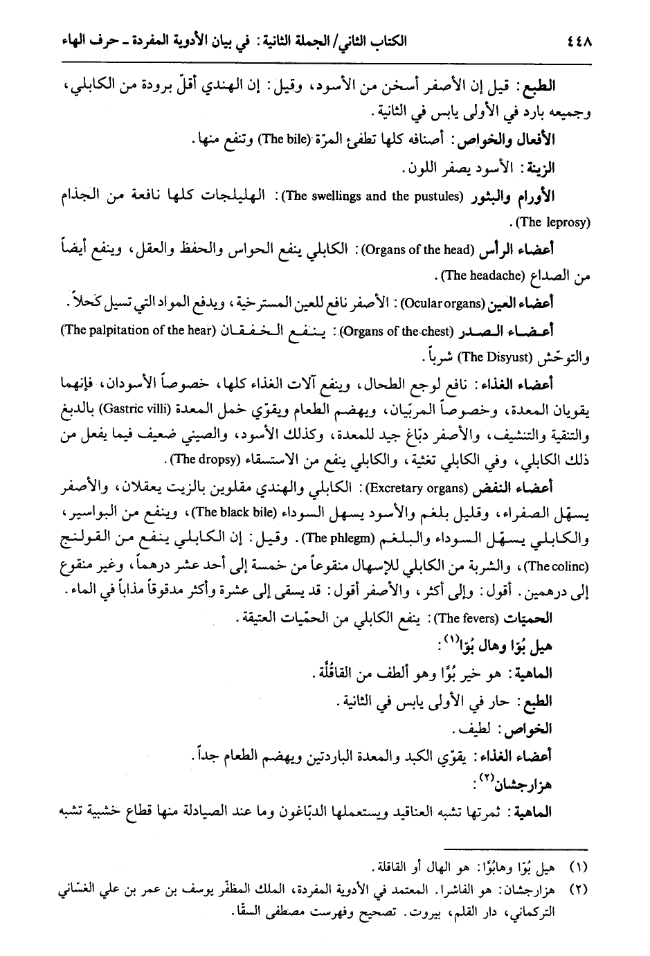 الطَّبْع: قيل إِن الْأَصْفَر أسخن من الْأسود وَقيل: إِن الْهِنْدِيّ أقل برودة من الكابلي وجميعه بَارِد فِي الأولى يَابِس فِي الثَّانِيَة. الْأَفْعَال والخواص: أصنافه كلهَا تطفىء الْمرة وَتَنْفَع مِنْهَا. الزِّينَة: الْأسود يصفر اللَّوْن. الأوررام والبثور: الهليلجات كلهَا نافعة من الجذام. أَعْضَاء الرَّأْس: الكابلي ينفع الْحَواس وَالْحِفْظ وَالْعقل وينفع أَيْضا من الصداع. أَعْضَاء الْعين: الْأَصْفَر نَافِع للعين المسترخية وَيمْنَع الْموَاد الَّتِي تسيل كحلاً. أَعْضَاء الصَّدْر: ينفع الخفقان والتوحش شرباً. أَعْضَاء الْغذَاء: نَافِع لوجع الطحال وينفع آلَات الْغذَاء كلهَا خُصُوصا الأسودان فَإِنَّهُمَا يقويان الْمعدة وخصوصاً المربّيان ويهضم الطَّعَام وَيُقَوِّي خمل الْمعدة بالدبغ والتنقية والتنشيف والأصفر دباغ جيد للمعدة وَكَذَلِكَ الْأسود والصيني ضَعِيف فِيمَا يفعل من ذَلِك الكابلي وَفِي الكابلي تغثية والكابلي ينفع من الإستسقاء. أَعْضَاء النفض: الكابلي والهندي مقلوين بالزيت يعقلان والأصفر يسهل الصَّفْرَاء وَقَلِيل بلغم وَالْأسود يسهل السَّوْدَاء وينفع من البواسير والكابلي يسهل السَّوْدَاء والبلغم. وَقيل: إِن الكابلي ينفع من القولنج والشربة من الكابلي للإسهال منقوعاً من خَمْسَة إِلَى أحد عشر درهما وَغير منقوع إِلَى دِرْهَمَيْنِ. أَقُول: وَإِلَى أَكثر والأصفر أَقُول: قد يُسمى إِلَى عشرَة وَأكْثر مدقوقاً مذاباً فِي المَاء. الحميات: ينفع الكابلي من الحميات العتيقة. هيل بُوّا وهال بوا: الْمَاهِيّة: هُوَ خير بوَا وَهُوَ ألطف من القاقلة. الطَّبْع: حَار فِي الأولى يَابِس فِي الثَّانِيَة. الْخَواص: لطيف. أَعْضَاء الْغذَاء: يُقَوي الكبد والمعدة الباردتين ويهضم الطَّعَام جدا. الْمَاهِيّة: ثَمَرَتهَا تشبه العناقيد ويستعملها الدبّاغون وَمَا عِنْد الصيادلة مِنْهَا قطاع خشبية تشبه