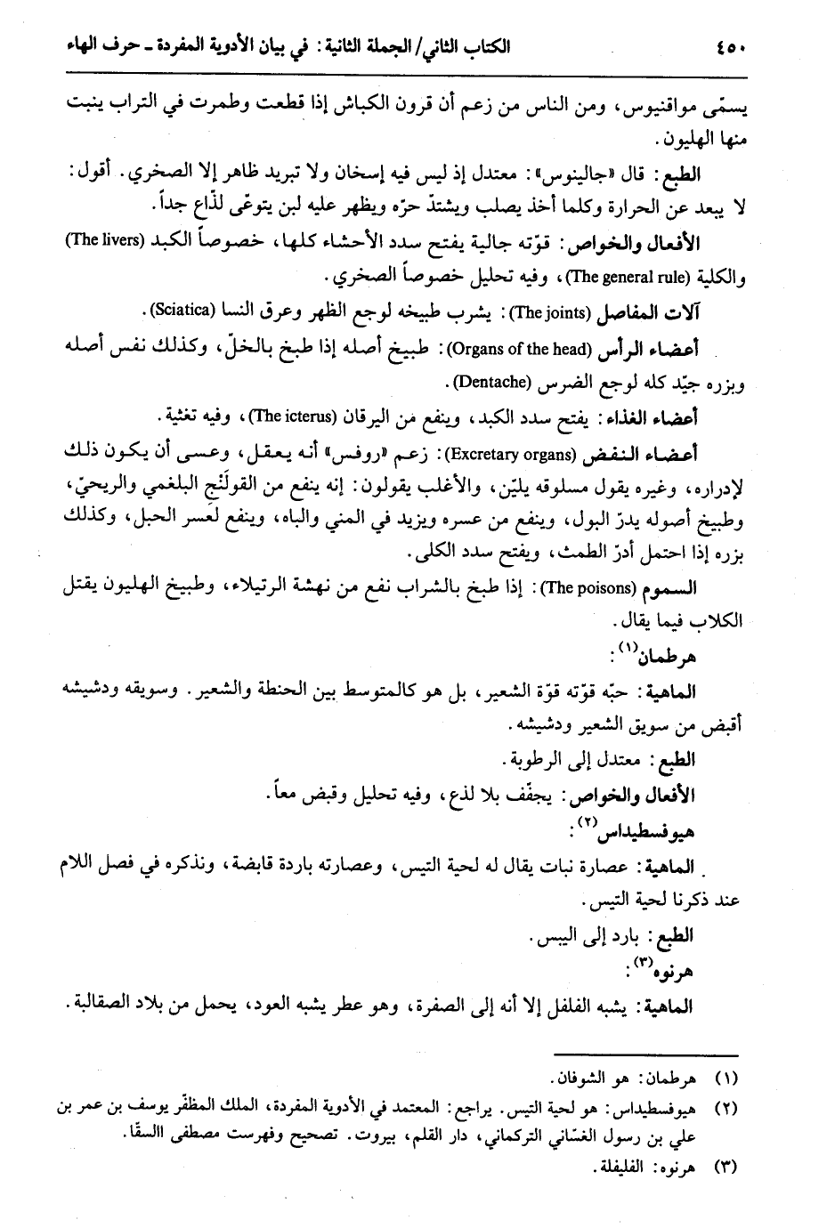 يُسمى مواقنيوس وَمن النَّاس من زعم أَن قُرُون الكباش إِذا قطعت وطمرت فِي التُّرَاب ينْبت مِنْهَا الهليون. الطَّبْع: قَالَ جالينوس: معتدل إِذْ لَيْسَ فِيهِ إسخان وَلَا تبريد ظَاهر إِلَّا الصخري. أَقُول: لَا يبعد عَن الْحَرَارَة وَكلما أَخذ يصلب ويشتد حره وَيظْهر عَلَيْهِ لبن يتوعيّ لذّاع جدا. الْأَفْعَال والخواص: قوته جالية يفتح سدد الآحشاء كلهَا خُصُوصا الكبدو الْكُلية وَفِيه تَحْلِيل خُصُوصا الصخري. آلَات المفاصل: يشرب طبيخه لوجع االظهر وعرق النِّسَاء. أَعْضَاء الرَّأْس: طبيخ أَصله إِذا طبخ بالخلّ وَكَذَلِكَ نفس أَصله وبزره جيّد كُله لوجع الضرس. أَعْضَاء الْغذَاء: يفتح سدد الكبد وينفع من اليرقان وَفِيه تغثية. أَعْضَاء النفض: زعم روفس أَنه يعقل وَعَسَى أَن يكون ذَلِك لإدراره وَغَيره يَقُول مسلوقه يلين والأغلب يَقُولُونَ: إِنَّه ينفع من القولَنْجِ البلغمي والريحي وطبيخ أُصُوله يدر الْبَوْل وينفع من عسره وَيزِيد فِي الْمَنِيّ والباه وينفع لعسر الْحَبل وَكَذَلِكَ بزره إِذا احْتمل أدر الطمث وَيفتح سدد الكلى. السمُوم: إِذا طبخ بِالشرابِ نفع من نهشة الرتيلاء وطبيخ الهليون يقتل الْكلاب فِيمَا يُقَال. هرطمان: الْمَاهِيّة: حبه قوّته قُوَّة الشّعير بل هُوَ كالمتوسط بَين الْحِنْطَة وَالشعِير وسويقه ودشيشه أَقبض من سويق الشّعير ودشيشه. الْأَفْعَال والخواص: يجفف بِلَا لذع وَفِيه تَحْلِيل وَقبض مَعًا. هيوفسطيداس. الْمَاهِيّة: عصارة نَبَات يُقَال لَهُ لحية التيس وعصارته بَارِدَة قابضة ونذكره فِي فصل اللَّام عِنْد ذكرنَا لحية التيس. الطَّبْع: بَارِد إِلَى اليبس. هرنوه: الْمَاهِيّة: يشبه الفلفل إِلَّا أَنه إِلَى الصُّفْرَة وَهُوَ عطر يشبه الْعود يحمل من بِلَاد الصقالبة.