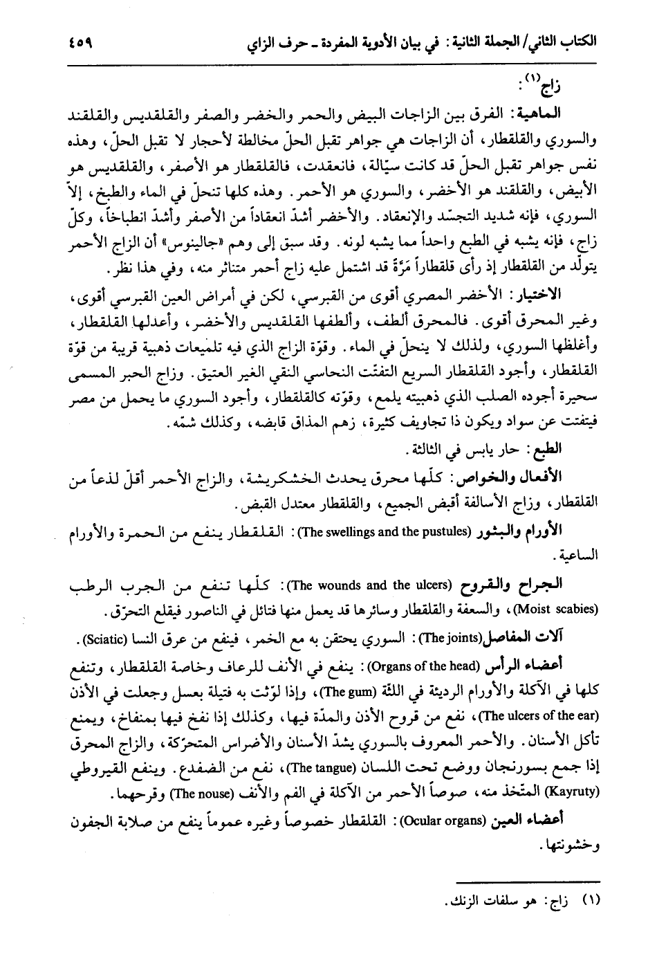 زاج: الْمَاهِيّة: الْفرق بَين الزاجات الْبيض والحمر والخضرول الصفر والقلقديس والقلقند والسوري والقلقطار أَن الزاجات هِيَ جواه تقبل الحلٌ مُخَالطَة لأحجار لَا تقبل الْحل وَهَذِه نفس جَوَاهِر تقبل الْحل قد كَانَت سيالة فانعقدتّ فالقلقطار هُوَ الْأَصْفَر والقلقديس هُوَ الْأَبْيَض والقلقند هُوَ الْأَخْضَر والسوري هُوَ الْأَحْمَر. وَهَذِه كلهَا تنْحَل فِي المَاء والطبخ إلآ إلسوري فَإِنَّهُ شَدِيد التجسد والإنعقاد. الْأَخْضَر أَشد انعقاداً من الْأَصْفَر وَأَشد انطباخاً وكلّ زاج فَإِنَّهُ يشبه فِي الطَّبْع وَاحِدًا مِمَّا يشبه لَونه. وَقد سبق إِلَى وهم جالينوس أَن الزاج الْأَحْمَر يتولّد من القلقطار إِذْ رأى قلطاراً مرّة قد اشْتَمَل عَلَيْهِ زاج أَحْمَر متناثر مِنْهُ وَفِي هَذَا نظر. الِاخْتِيَار: الْأَخْضَر الْمصْرِيّ أقوى من القبرسي لَكِن فِي أمراض الْعين القبرسي وَغير المحرق أقوى. فالمحرق ألطف وألطفها القلقديس والأخضر وأعدلها القلقطار وأغلظها السوري وَلذَلِك لَا ينْحل فِي المَاء. وقوّة الزاج الَّذِي فِيهِ تلميعات ذهبية قريبَة من قوّة القلقطار وأجود القلقطار السَّرِيع التفتت النحاسي النقي الْغَيْر الْعَتِيق. وزاج الحبر الْمُسَمّى سحيرة أجوده الصلب الَّذِي ذهبيته يلمع وقوّته كالقلقطار وأجود السوري مَا يحمل من مصر فيتفتت عَن سَواد وَيكون ذَا تجاويف كَثِيرَة زهم المذاق قابضه وَكَذَلِكَ شمه. الطَّبْع: حَار يَابِس فِي الثَّالِثَة. الْأَفْعَال والخواص: كلّها محرق يحدث الخشكريشة والزاج الْأَحْمَر أقل لذعاً من القلقطار وزاج الأسالفة أَقبض الْجَمِيع والقلقطار معتدل الْقَبْض. الأورام والبثور: القلقطار ينفع من الْحمرَة والأورام الساعية. الْجراح والقروح: كلهَا تَنْفَع من الجرب الرطب والسعفة والقلقطار وسائرها قد يعْمل مِنْهَا فتائل فِي الناصور فيقلع التحرق. آلَات المفاصل: السوري يحتقن بِهِ مَعَ الْخمر فينفع من عرق النسا. أَعْضَاء الرَّأْس: ينفع فِي الْأنف للرعاف وخاصة القلقطار وَتَنْفَع كلهَا فِي الآكلة والأورام الرَّديئَة فِي اللثة وَإِذا لوثت بِهِ فَتِيلَة بِعَسَل وَجعلت فِي الْأذن نفع من قُرُوح الْأذن والمدة فِيهَا وَكَذَلِكَ إِذا نفخ فِيهَا بمنفاخ وَيمْنَع تَأْكُل الْأَسْنَان. والأحمر الْمَعْرُوف بالسوري يشد الْأَسْنَان والأضراس المتحركة والزاج المحرق إِذا جمع بسورنجان وَوضع تَحت اللِّسَان نفع من الضفدع. وينفع القيروطي الْمُتَّخذ مِنْهُ صوما الْأَحْمَر من الآكلة فِي الْفَم وَالْأنف وقروحهما. أَعْضَاء الْعين: القلقطار خُصُوصا وَغَيره عُمُوما ينفع من صلابة الجفون وخشونتها.