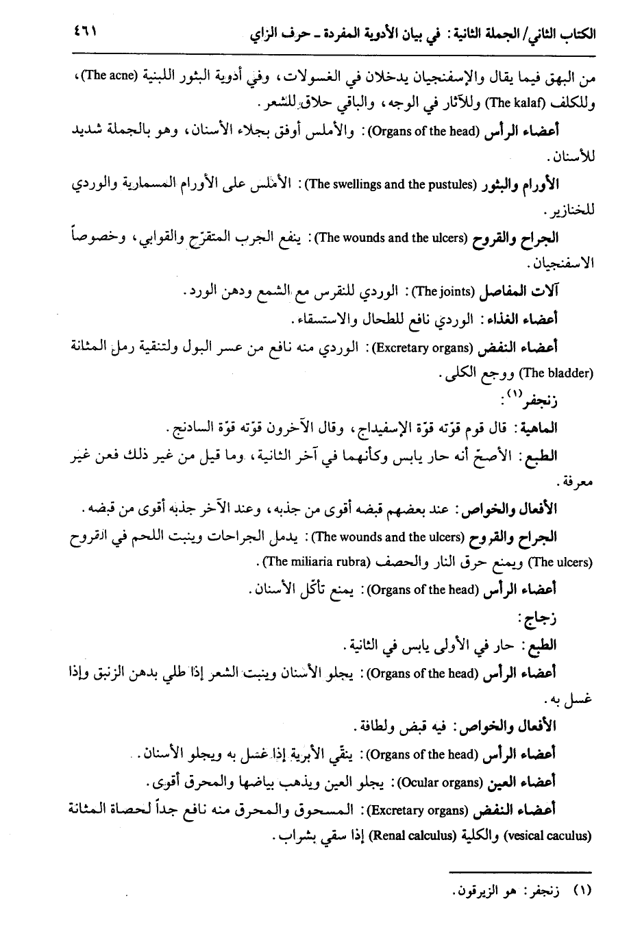 من البهق فِيمَا يُقَال والإسفنجيان يدخلَانِ فِي الغسولات وَفِي أدوية البثور اللبنية وللكلف وللآثار فِي أَعْضَاء الرَّأْس: والأملس أوفق بجلاء الْأَسْنَان وَهُوَ بِالْجُمْلَةِ شَدِيد للأسنان. الأورام والبثور: الأملس على الأورام المسمارية والوردي للخنازير. الْجراح والقروح: ينفع الجرب المتقرح والقوابي وخصوصاً الاسفنجيان. آلَات المفاصل: الوردي للنقرس مَعَ الشمع ودهن الْورْد. أَعْضَاء الْغذَاء: الوردي نَافِع للطحال وَالِاسْتِسْقَاء. أَعْضَاء النفض: الوردي مِنْهُ نَافِع من عسر الْبَوْل ولتنقية رمل المثانة ووجع الكلى. زنجفر: الْمَاهِيّة: قَالَ قوم قوته قُوَّة الإسفيداج وَقَالَ الْآخرُونَ قوّته قُوَّة السادنج. الطَّبْع: الْأَصَح أَنه حَار يَابِس وكأنهما فِي آخر الثَّانِيَة وَمَا قيل من غير ذَلِك فَعَن غير معرفَة. الْأَفْعَال والخواص: عِنْد بَعضهم قَبضه أقوى من جذبه وَعند الآخر جذبه أقوى عَن قَبضه. الْجراح والقروح: يدمل الْجِرَاحَات وينبت اللَّحْم فِي القروح وَيمْنَع حرق النَّار والحصف. أَعْضَاء الرَّأْس: يمْنَع تَأْكُل الْأَسْنَان. زجاج: الطَّبْع: حَار فِي الأولى يَابِس فِي الثَّانِيَة. الْأَفْعَال والخواص: فِيهِ قبض ولطافة. أَعْضَاء الرَّأْس: ينقي الْأَدْوِيَة إِذا غسل بِهِ ويجلو الْأَسْنَان. أَعْضَاء الْعين: يجلو الْعين وَيذْهب بياضها والمحرق أقوى. أَعْضَاء النفض: المسحوق والمحرق مِنْهُ نَافِع جدا لحصاة المثانة والكلية إِذا سقِِي بشراب.