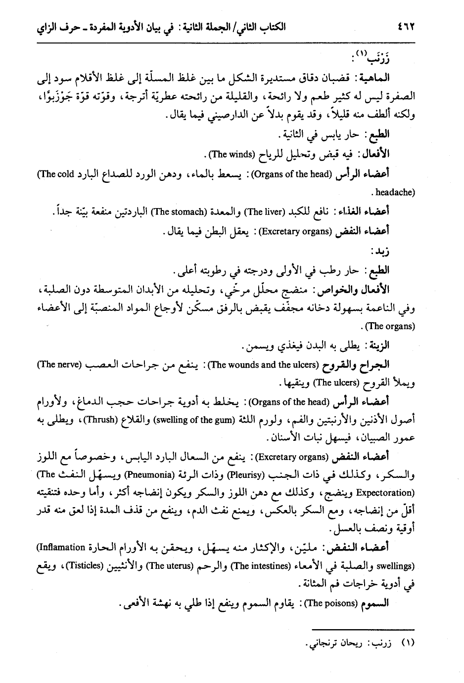 زرنَب: الْمَاهِيّة: قضبان دقاق مستديرة الشكل مَا بَين غلظ المسلة إِلَى غلظ الأقلام سود إِلَى الصُّفْرَة لَيْسَ لَهُ كثير طعم وَلَا رَائِحَة والقليلة من رَائِحَته عطرية أترجة وقوته قُوَّة جوزبوا وَلكنه ألطف مِنْهُ قَلِيلا وَقد يقوم بَدَلا عَن الدارصيني فِيمَا يُقَال. الطَّبْع: حَار يَابِس فِي الثَّانِيَة. الْأَفْعَال: فِيهِ قبض وَتَحْلِيل للرياح. أَعْضَاء الرَّأْس: يسعط بِالْمَاءِ ودهن الْورْد للصداع الْبَارِد. أَعْضَاء الْغذَاء: نَافِع للكبد والمعدة الباردتين مَنْفَعَة بَيِّنَة جدا. أَعْضَاء النفض: يعقل الْبَطن فِيمَا يُقَال. زبد. الْأَفْعَال والخواص: منضج مُحَلل مرخّي وتحليله من الْأَبدَان المتوسطة دون الصلبة وَفِي الناعمة بسهولة دخانه مجفف يقبض بالرفق مسكن لأوجاع الْموَاد المنصبة إِلَى الْأَعْضَاء. الزِّينَة: يطلى بِهِ الْبدن فيغذي ويسمن. الْجراح والقروح: ينفع من جراحات العصب ويملأ القروح وينقيها. أَعْضَاء الرَّأْس. يخلط بِهِ أدوية جراحات حجب الدِّمَاغ ولأورام أصُول الْأُذُنَيْنِ والأرنبتين والفم ولورم اللثة والقلاع ويطلى بِهِ عمور الصّبيان فيسهل نَبَات الْأَسْنَان. أَعْضَاء النفض: ينفع من السعال الْبَارِد الْيَابِس وخصوصاً مَعَ اللوز وَالسكر وَكَذَلِكَ فِي ذَات الْجنب وَذَات الرئة ويسهل النفث وينضج وَكَذَلِكَ مَعَ دهن اللوز وَالسكر وَيكون إنضاجه أَكثر وَأما وَحده فتنقيته أقل من إنضاجه وَمَعَ السكر بِالْعَكْسِ وَيمْنَع نفث الدَّم وينفع من قذف الْمدَّة إِذا لعق مِنْهُ قدر أُوقِيَّة وَنصف بالعسل. أَعْضَاء النفض: مليّن والإكثار مِنْهُ يسهّل ويحقن بِهِ الأورام الحارة والصلبة فِي الأمعاء وَالرحم والأنثيين وَيَقَع فِي أدوية خراجات فَم الحانة. السمُوم: يُقَاوم السمُوم وينفع إِذا طلي بِهِ نهشة الأفعى.