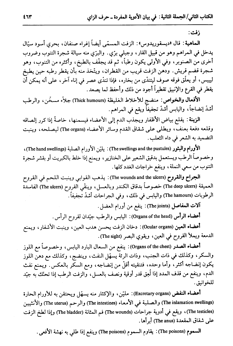 زفت: الْمَاهِيّة: قَالَ ديسقوريدوس: الزفت المسمّى أَيْضا إغراء صنفان بحري أسود سيّال يدْخل فِي المراهم وَهُوَ من قبيل القار وجبلي برّي. والبري مِنْهُ سيالة شَجَرَة التنوب وضروب أُخْرَى من الصنوبر وَفِي الأولى يكون رطبا ثمَّ قد يجفف بالطبخ وَأَكْثَره من التنوب وَهُوَ شَجَرَة قضم قُرَيْش. ودهن الزفت قريب من القطران ويتخذ مِنْهُ بِأَن يقطر رطبه حِين يطْبخ لييبس أَو يعلق فَوْقه صوف ليتندى من بخاره فَإِذا تندى عصر فِي إِنَاء آخر على أَنه يُمكن أَن يقطر فِي القرع والإنبيق تقطيراً أَجود من ذَلِك وأحفظ لما يصعد. الأقعال والخواص: منضج للآخلاط الغليظة جلاء مسخَن والرَطب أَشد إنضاجاً واليابس أَشد تجفيفاً وَيَقَع فِي المراهم. الزِّينَة: يقْلع بَيَاض الْأَظْفَار ويجذب الدَّم إِلَى الْأَعْضَاء فيسمنها خَاصَّة إِذا كرر إلصاقه وقلعه دفْعَة بعنف ويطلى على شقَاق الْقدَم وَسَائِر الْأَعْضَاء ليصلحه وينبت التضميد بِهِ الشّعْر فِي دَاء الثَّعْلَب. الأورام والبثور: يلين الأورام الصلية وخصوصاً الرطب وَيسْتَعْمل بدقيق الشّعير على الْخَنَازِير وَيمْنَع إِذا خلط بالكبريت أَو بقشر شَجَرَة التنوب من سعي النملة وينفع خراجات الغدد كلهَا. الْجراح والقروح: يذهب القوابي وينبت الدَّم فِي القروح العميقة خُصُوصا بدقاق الكندر آلَات المفاصل: ينفع من أورام العضل. أَعْضَاء الرَّأْس: الْيَابِس وَالرّطب جيدان لقروح الرَّأْس. أَعْضَاء الْعين: دُخان الزفت يحسن هدب الْعين وينبت الأشفار وَيمْنَع الدمعة ويملأ القروح فِي الْعين وَيُقَوِّي الْبَصَر. أَعْضَاء الصَّدْر: ينفع من السعال الْبَارِد الْيَابِس وخصوصَاً مَعَ اللوز وَالسكر وَكَذَلِكَ فِي ذَات الْجنب وَذَات الرئة يسهل النفث وينضج وَكَذَلِكَ مَعَ دهن اللوز يكون إنضاجه أَكثر وَأما وَحده فتنقيته أقل من إنضاجه وَمَعَ السكر بِالْعَكْسِ. وَيمْنَع نفث الدَّم وينفع من قذف المدد إِذا لُعِق قدر وقية وَنصف بالعسل والزفت الرطب إِذا تحنك بِهِ جيد للخوانيق. أَعْضَاء النفض: ملين والإكثار مِنْهُ يسهل ويحتقن بِهِ للأورام الحارة والصلبة فِي الأمعاء وَالرحم والأنثيين وَيَقَع فِي أدوية جراحات فَم المثانة وَإِذا لطخ الزفت على شقَاق المنغمة أبرأها. السمُوم: يُقَاوم السمُوم وينفع إِذا طلي بِهِ نهشة الأفعى.