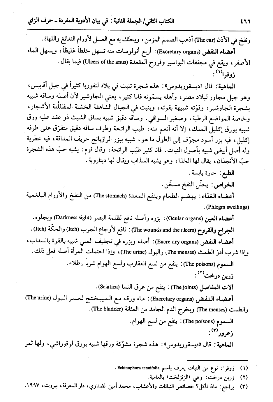 وَنفخ فِي الْأذن أذهب الصمم المزمن ويحنك بِهِ مَعَ الْعَسَل لأورانم النغانغ واللهاة. أَعْضَاء النفض: أَربع أنولوسات مِنْهُ تسهل خلطاً غليظاً ويسهل المَاء الْأَصْفَر وَيَقَع فِي مجففات البواسير وقروح المقعدة فِيمَا يُقَال. زوفرا: الْمَاهِيّة: قَالَ ديسقوريدوس: هَذِه شَجَرَة تنْبت فِي بِلَاد لنفوربا كثيرا فِي جبل أقابيس وَهُوَ جبل مجاور لبلاد مصر وَأَهله يسمّونه فانا كثير يَعْنِي الجاوشير لِأَن أَصله وَسَاقه شَبيه بشجرة الجاوشير وقوته شَبيهَة بقوته وينبت فِي الْجبَال الشاهقة الخشنة المظللة الْأَشْجَار وخاصة الْمَوَاضِع الرّطبَة وصغير السواقي. وَسَاقه دَقِيق شَبيه بساق الشبث ذُو عقد عَلَيْهِ ورق شَبيه بورق إكليل الْملك إِلَّا أَنه أنعم مِنْهُ طيب الرَّائِحَة وطرف سَاقه دَقِيق متفرق على طرفه إكليل فِي بزر أسود مجوف إِلَى الطول مَا هُوَ شَبيه ببزر الرازيانج حريف المذاقة فِيهِ عطرية وَله أصل أَبيض شَبيه بأصول النَّبَات. فانا كثير طيب الرَّائِحَة وَقَالَ قوم: يشبه حبّ هَذِه الشَّجَرَة حب الأنجذان يُقَال لَهَا الخذا وَهُوَ يشبه السذاب وَيُقَال لَهَا ديناروية. الطَّبْع: حارة يابسة. أَعْضَاء الْغذَاء: يهضم الطَّعَام وينفع الْمعدة من النفخ والأورام البلغمية. أَعْضَاء الْعين: بزره وَأَصله نَافِع لظلمة الْبَصَر ويجلوه. الْجراح والقروح: نَافِع لأوجاع الجرب والحكّة. أَعْضَاء النفض: أَصله وبزره فِي تجفيف الْمَنِيّ شَبيه بِالْقُوَّةِ بالسذاب وَإِذا شربّ أدر الطمث وَالْبَوْل وَإِذا احتملت الْمَرْأَة أَصله فعل ذَلِك. السمُوم: ينفع من لسع العقارب ولسع الْهَوَام شرباً وطلاء. زرين درخت: آلَات المفاصل: ينْفَرد من عرق النسا. أَعْضَاء النفض: مَاء ورقه مَعَ الميبختج لعسر الْبَوْل والطمث وَيخرج الدَّم الجامد من المثانة. السمُوم: ينفع من لسع الْهَوَام. زعرور: الْمَاهِيّة: قَالَ ديسقوريدوس: هَذِه شَجَرَة مشوكة وَرقهَا شَبيه بورق لوقوراشي وَلها ثَمَر